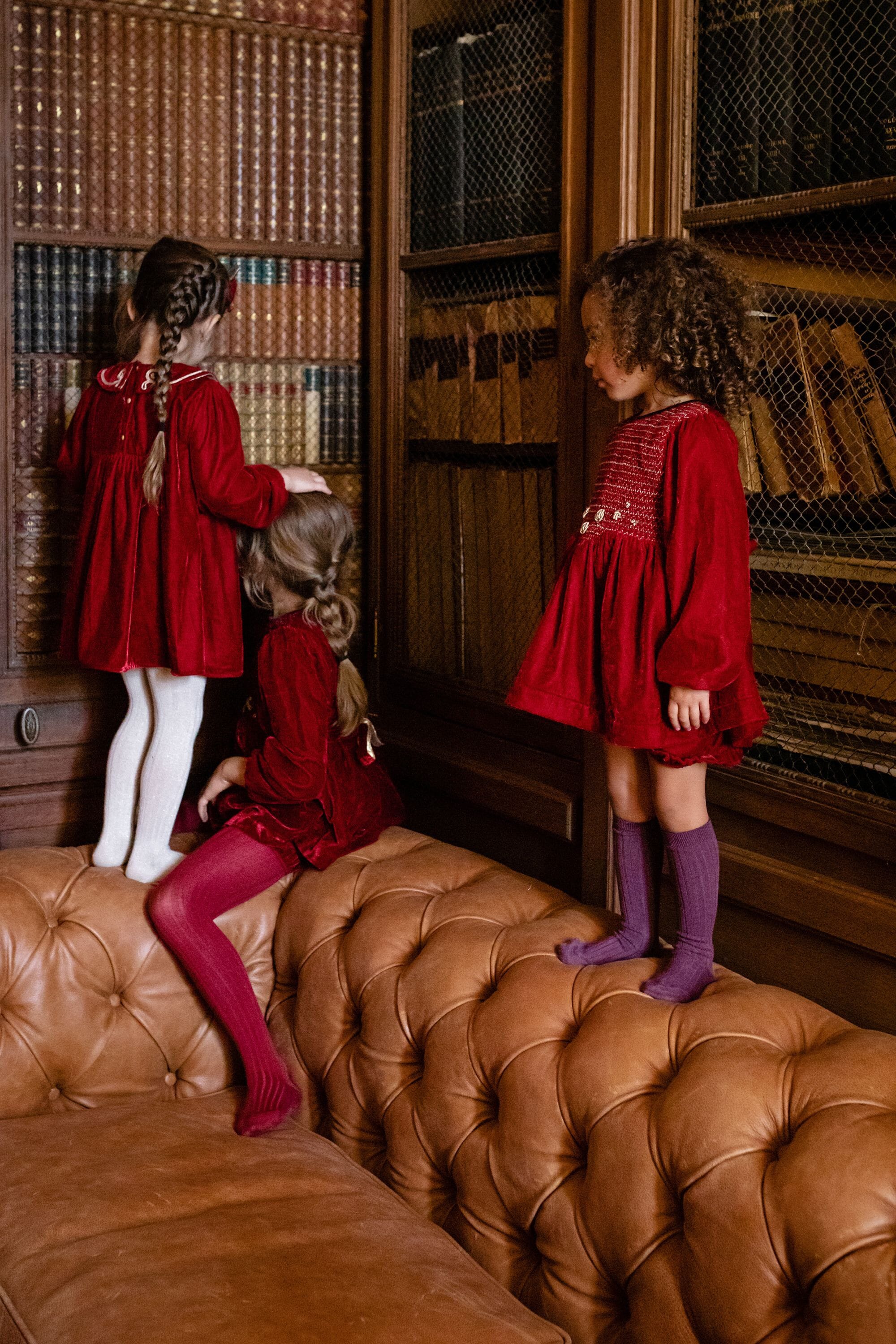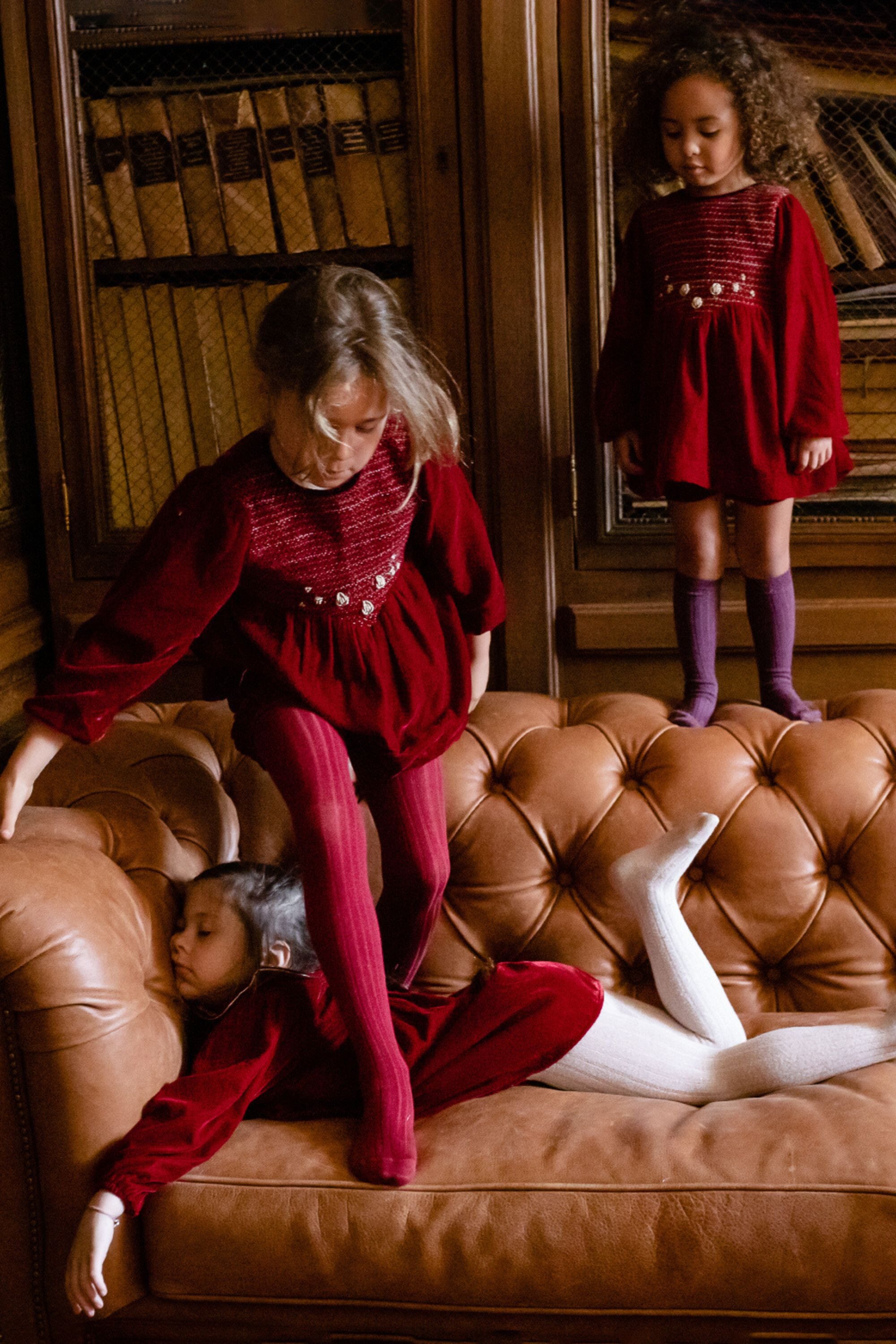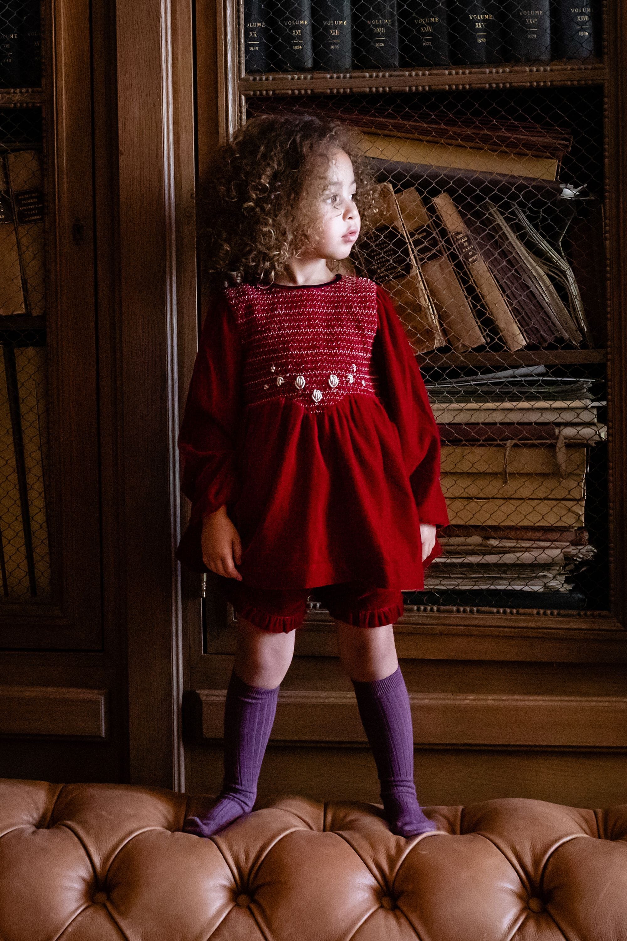 Blouse/Robe courte, Velours, Couleur Pomme d’amour, Doublure unie et contrastée en voile de coton bio, Entièrement smockée sur le devant, Broderies main dorées, Manches longues élastiquées, Boutons dorés et ceinture dans le dos.