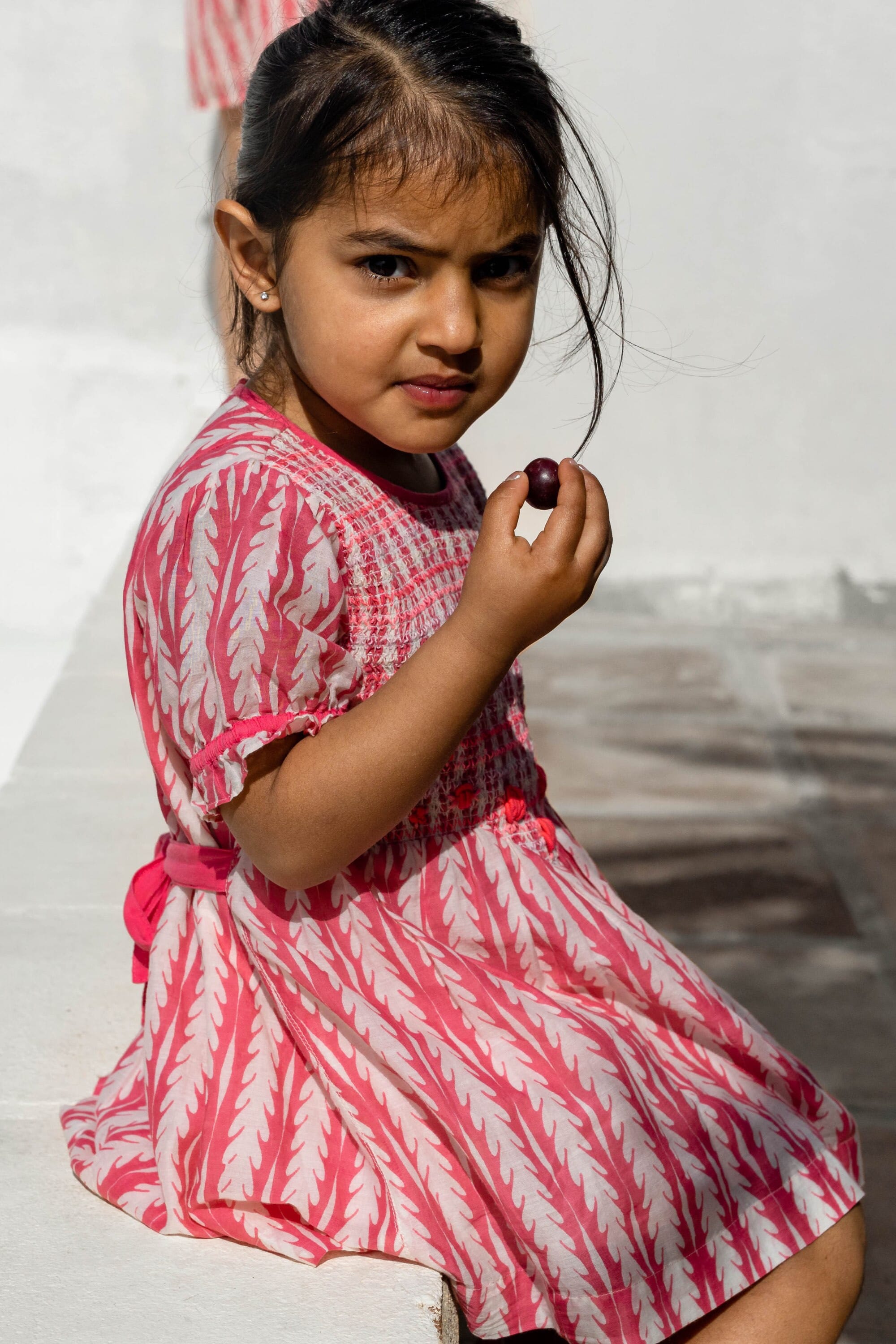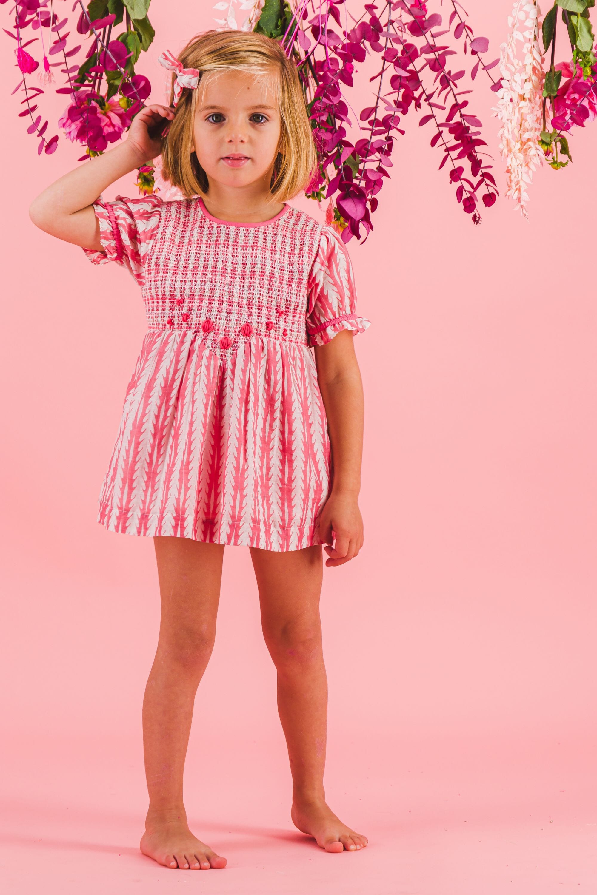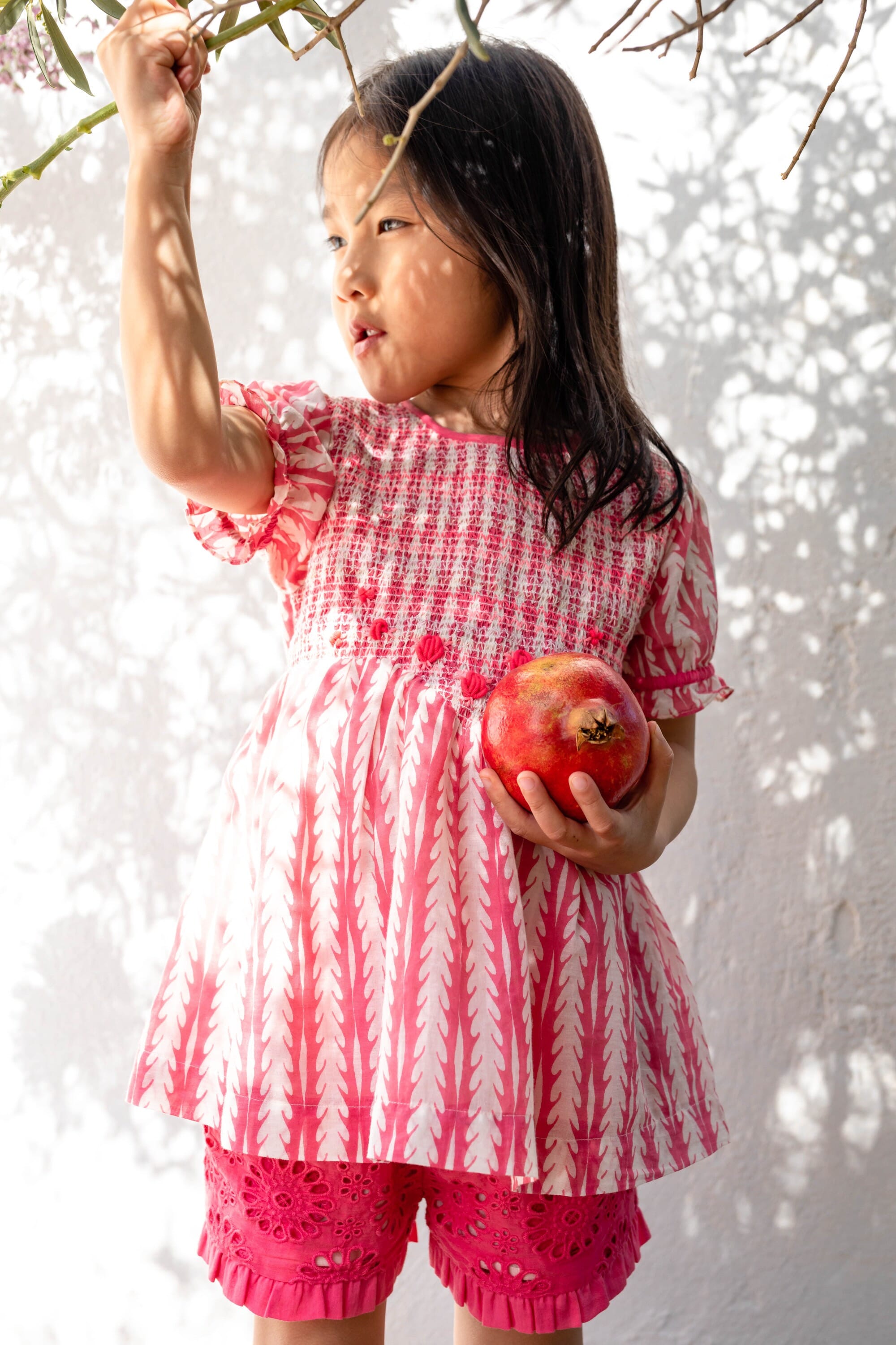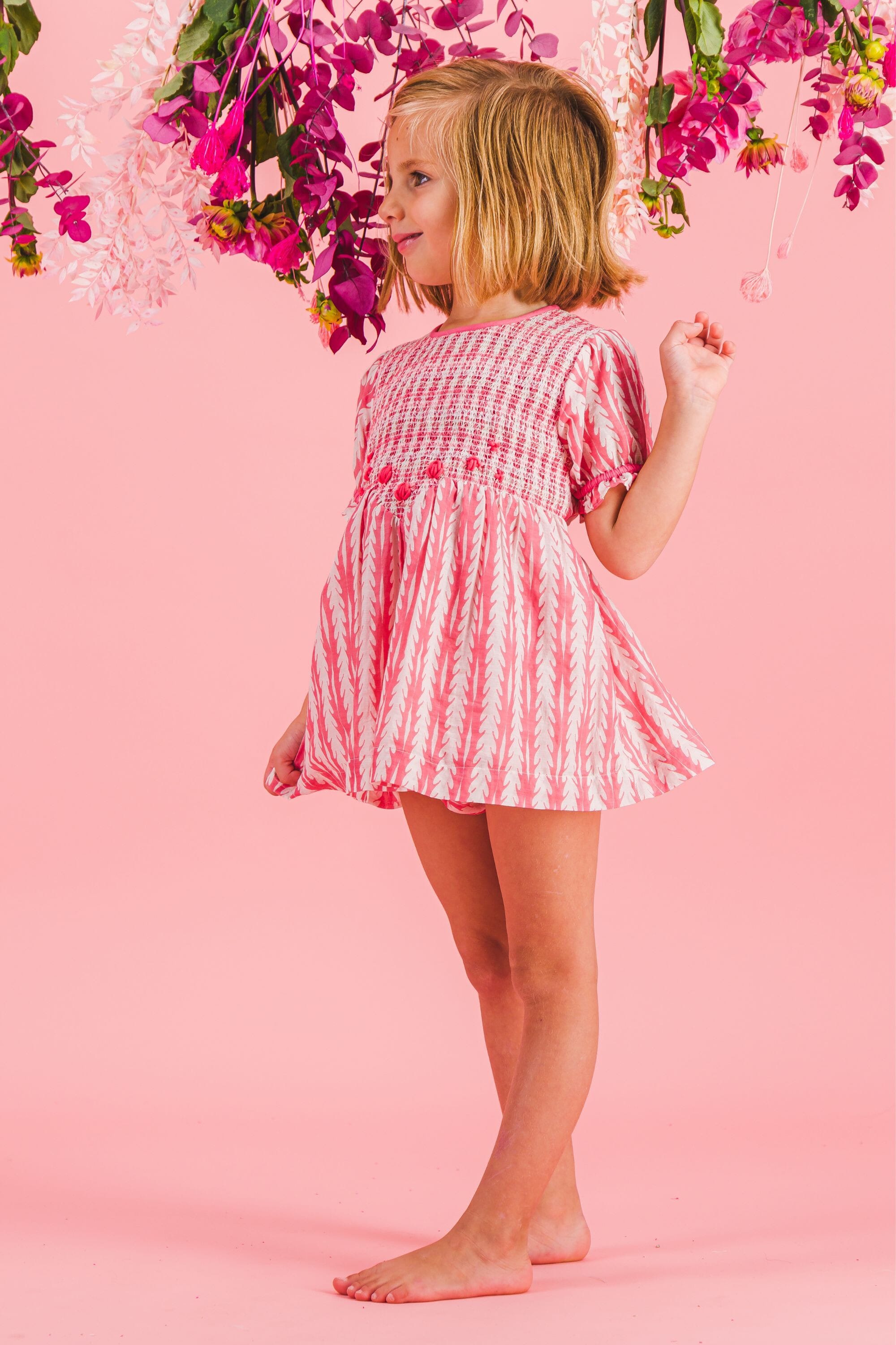 - Blouse/Robe courte, 100% coton bio, Doublure unie en voile de coton bio, Blockprint, Entièrement smockée sur le devant, Broderies main, Fronces sur le devant et dans le dos, Manches courtes élastiquées, Boutons contrastés et ceinture dans le dos.