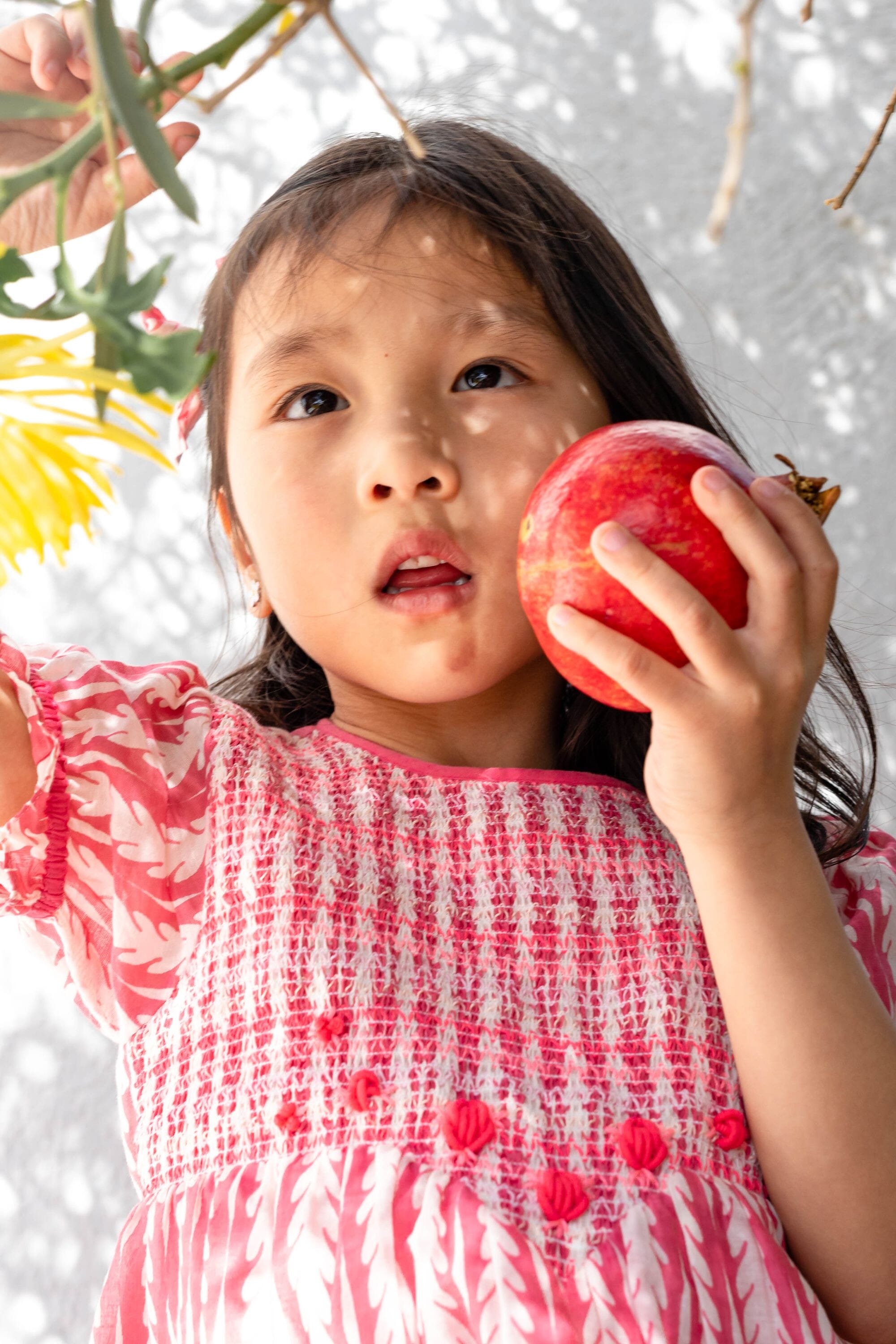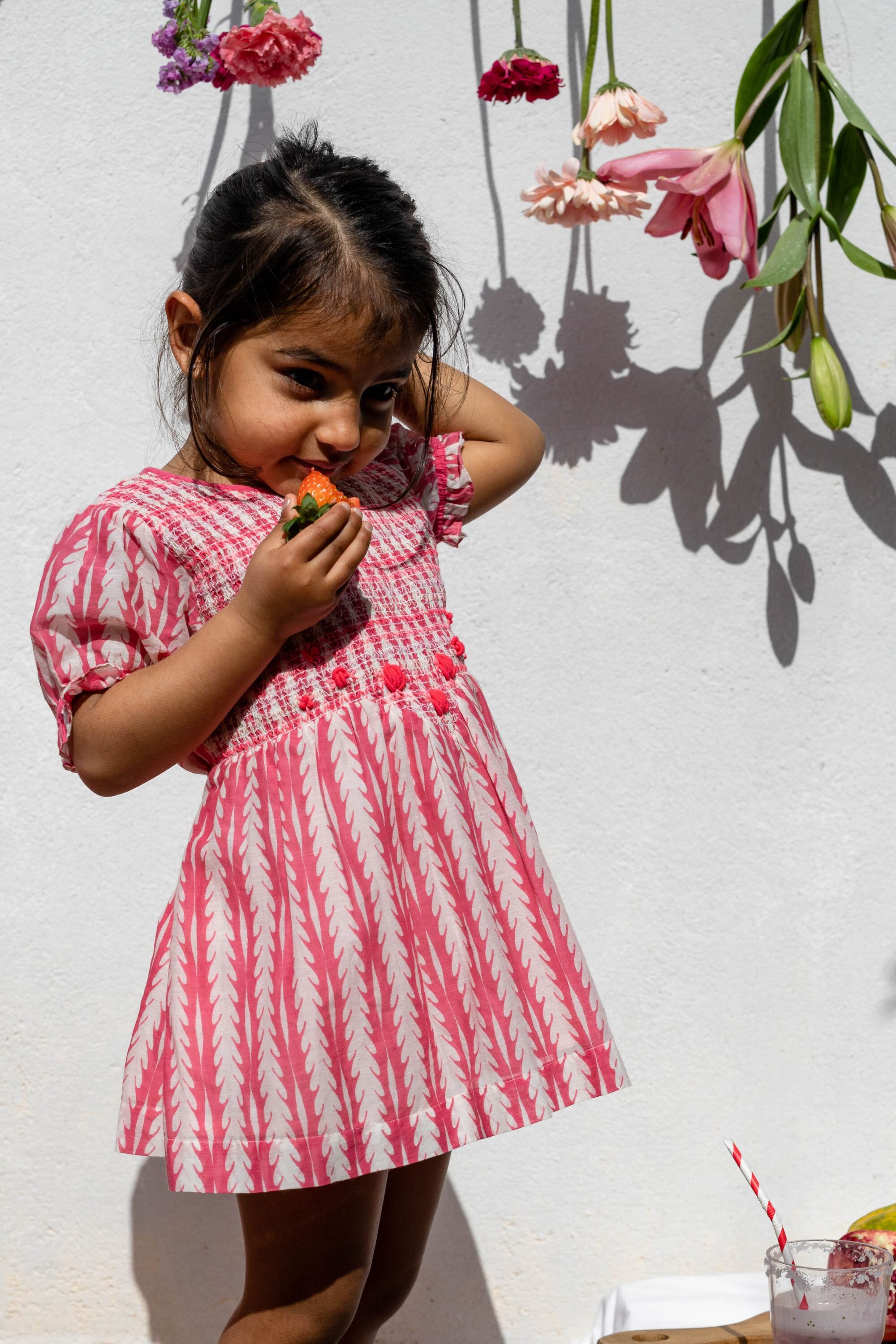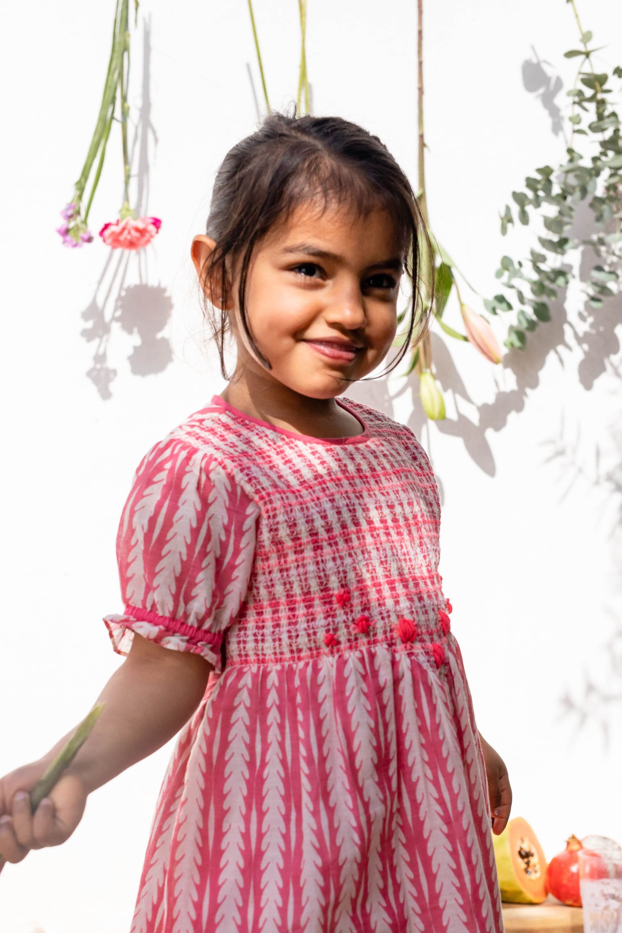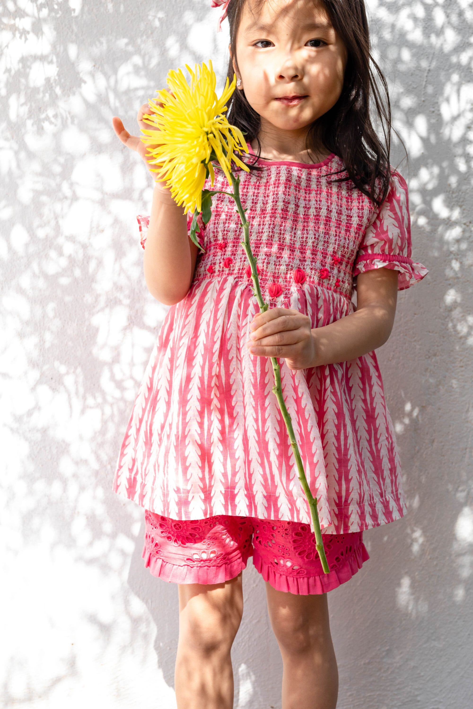 Une blouse en coton biologique entièrement smockée sur le devant avec des broderies main.