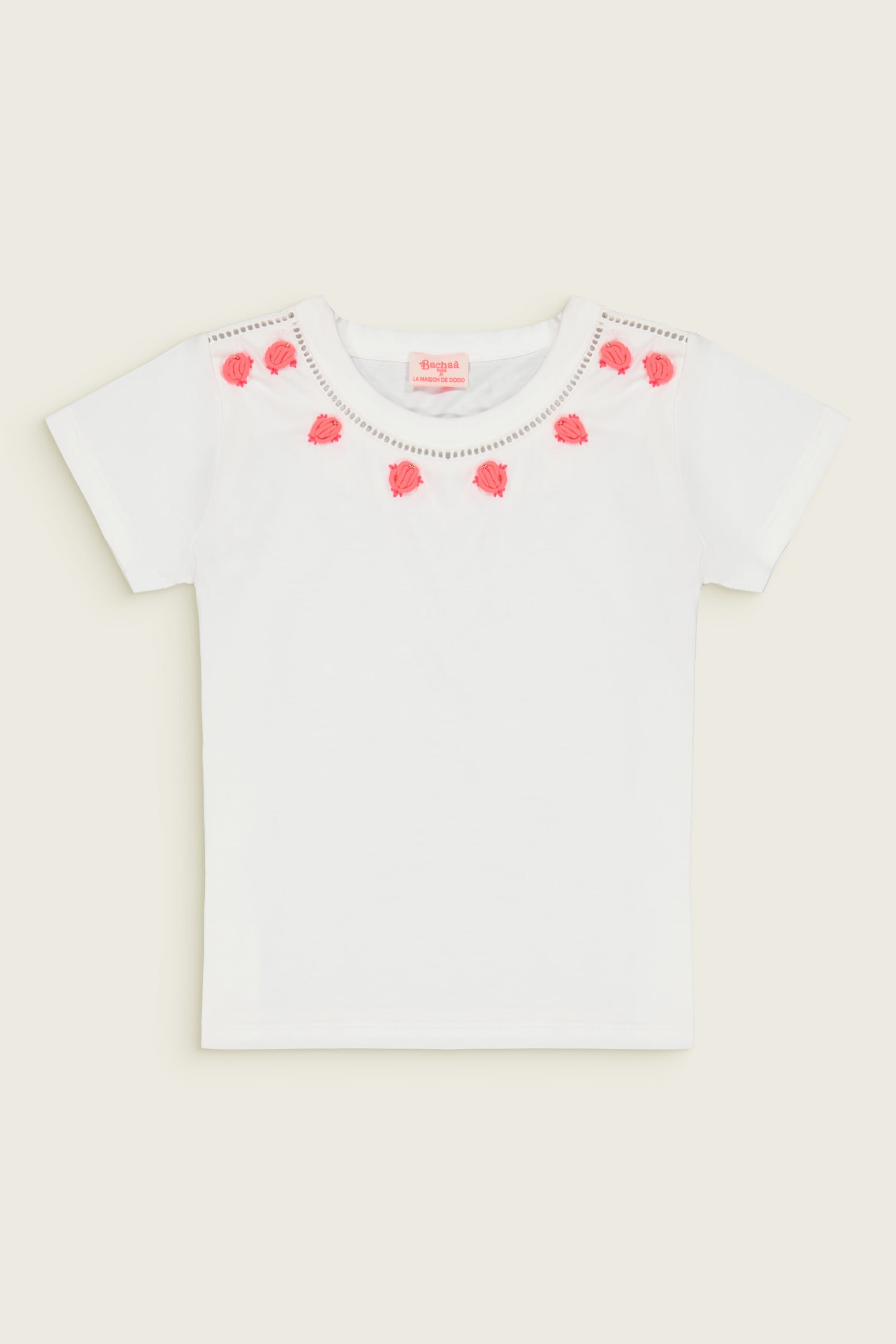 - T-shirt, 100% coton bio, Blanc, Broderies main et dentelles jour échelle sur le col et les épaules.
