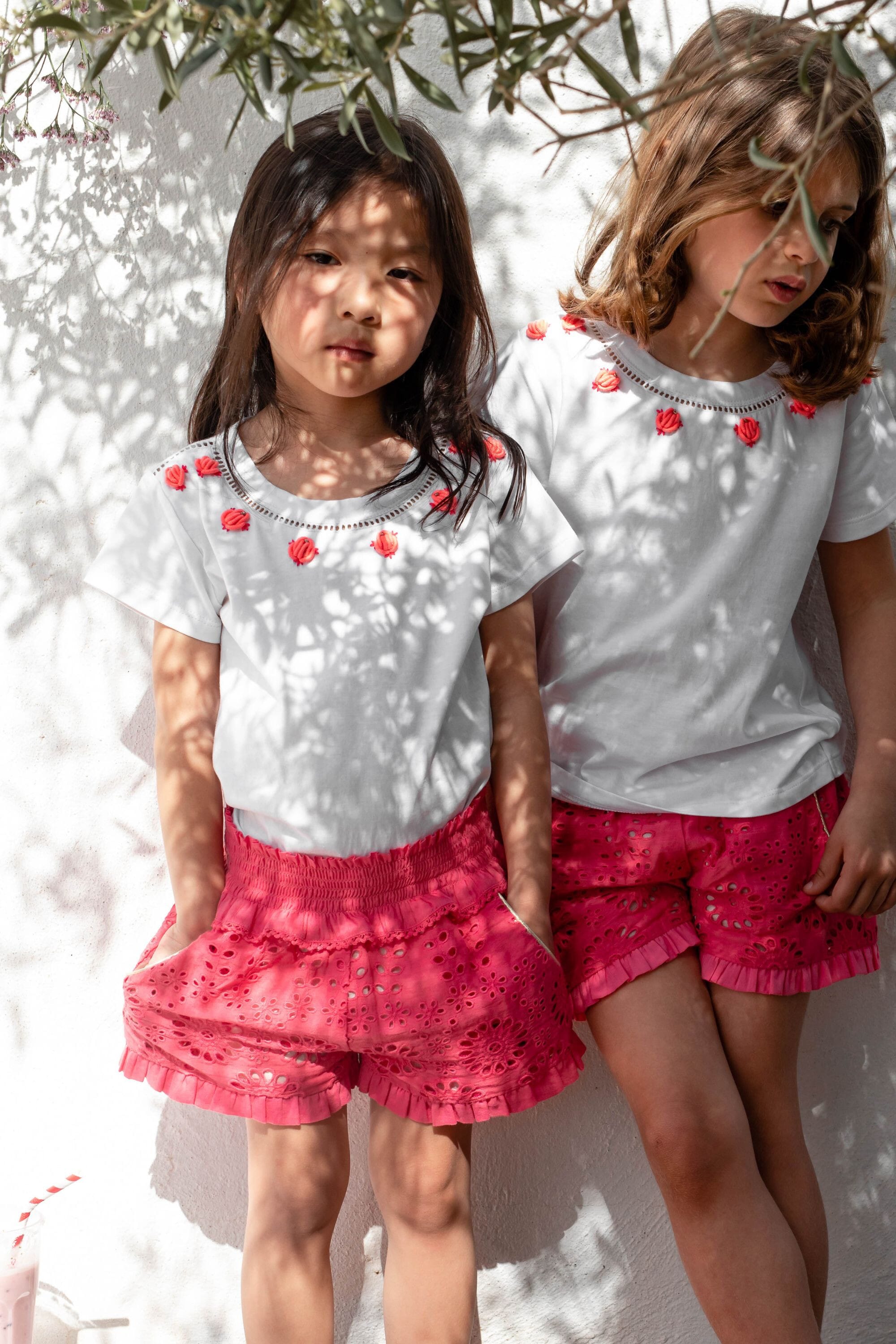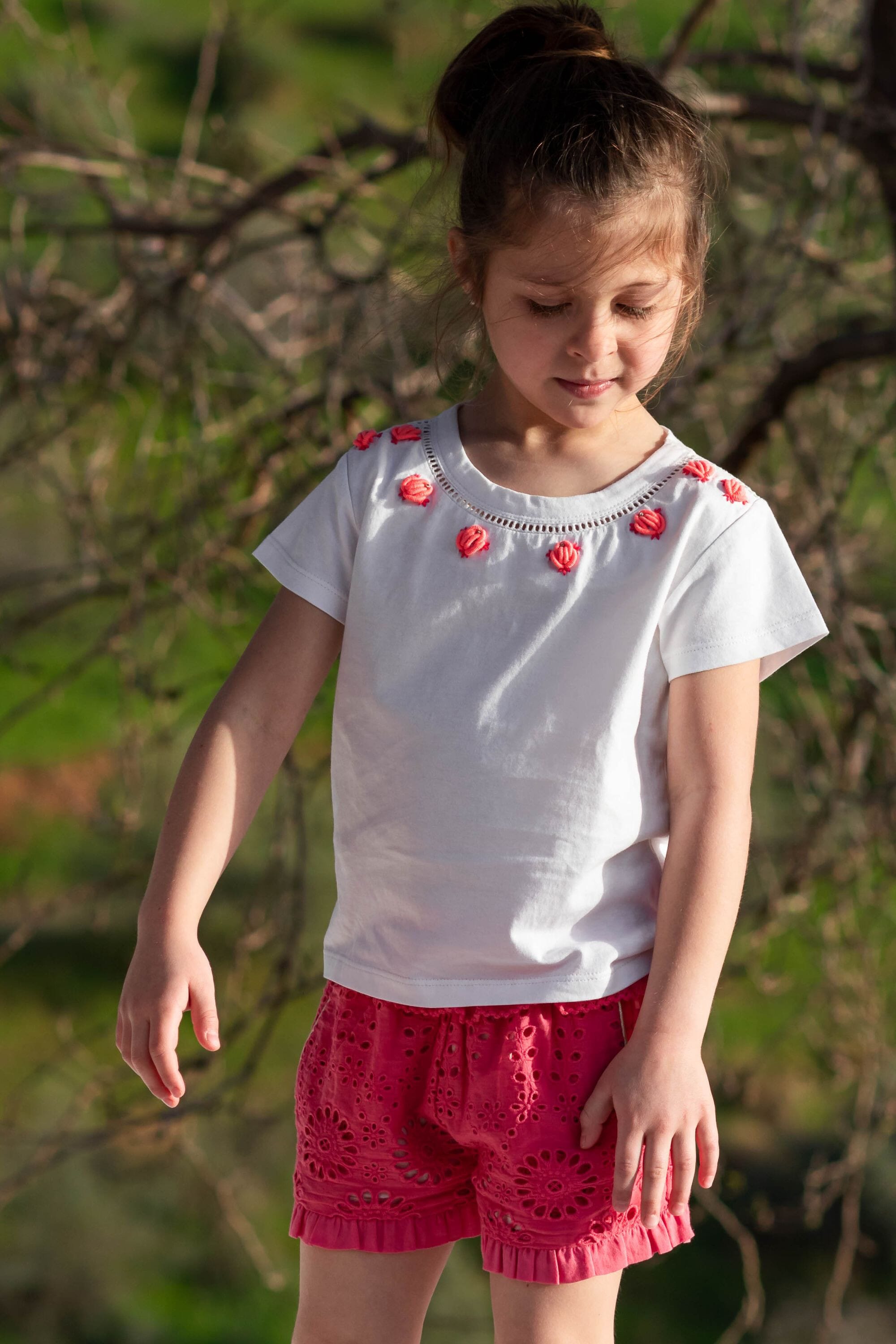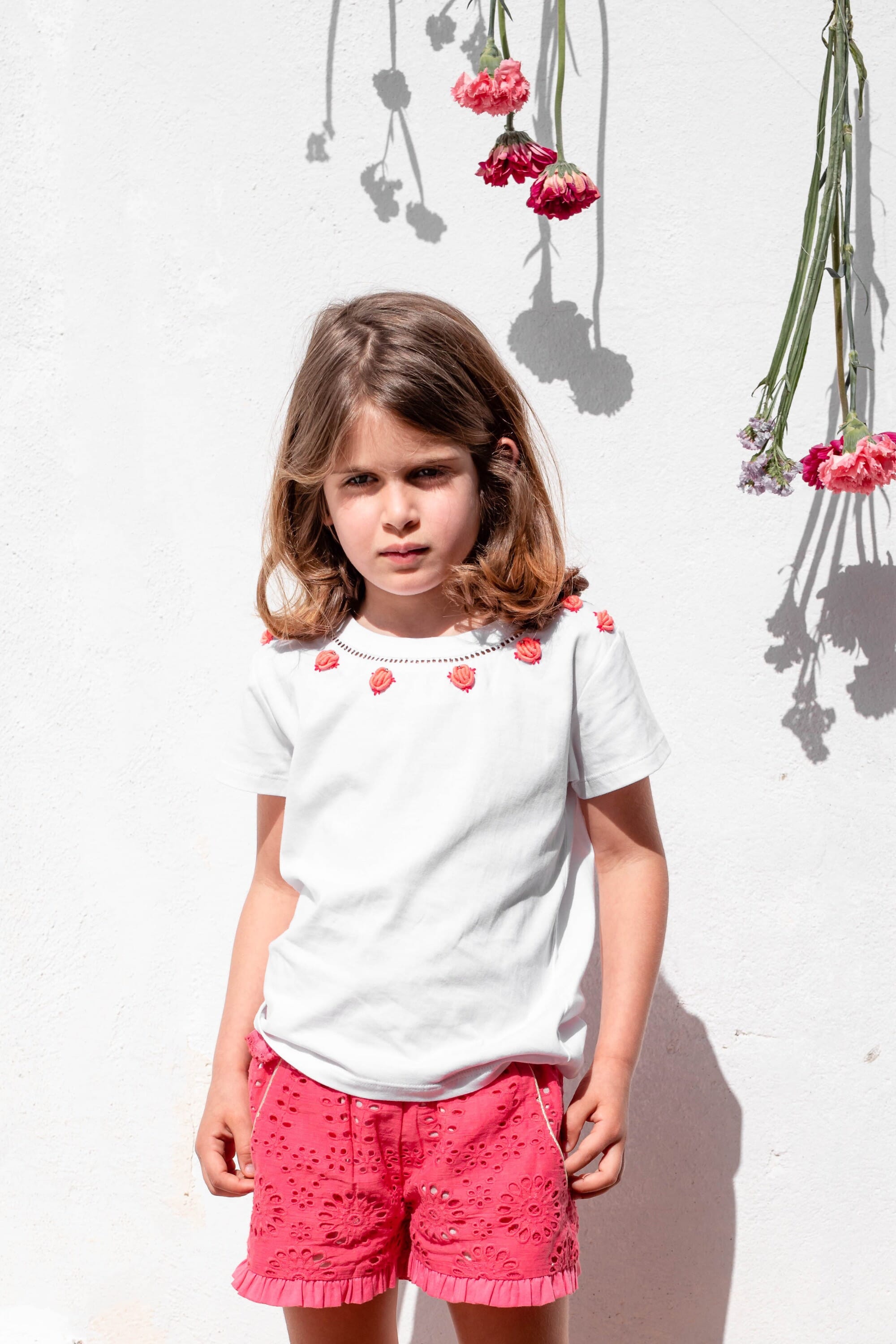 Un T-shirt en coton biologique avec des broderies main et des dentelles jour échelle sur le col et les épaules.