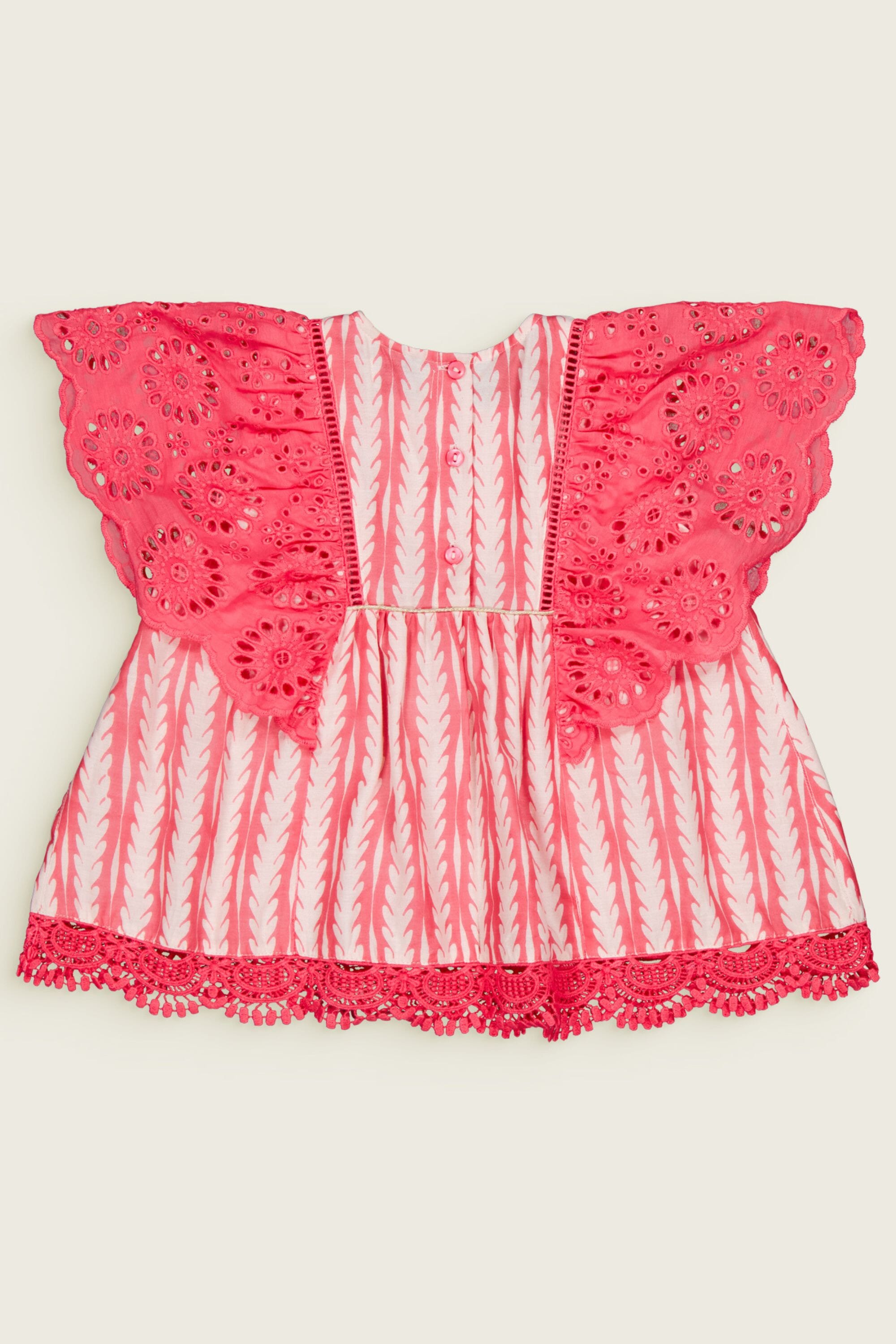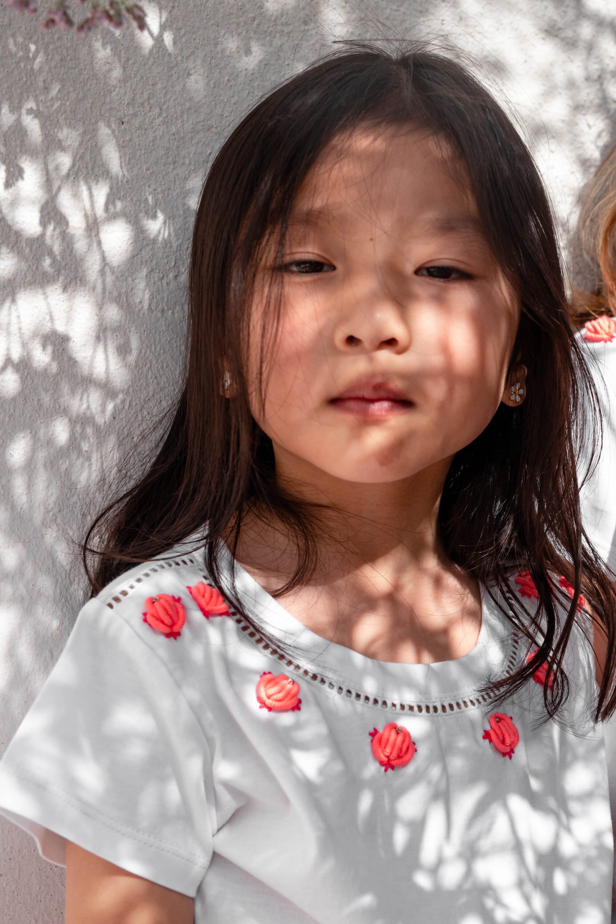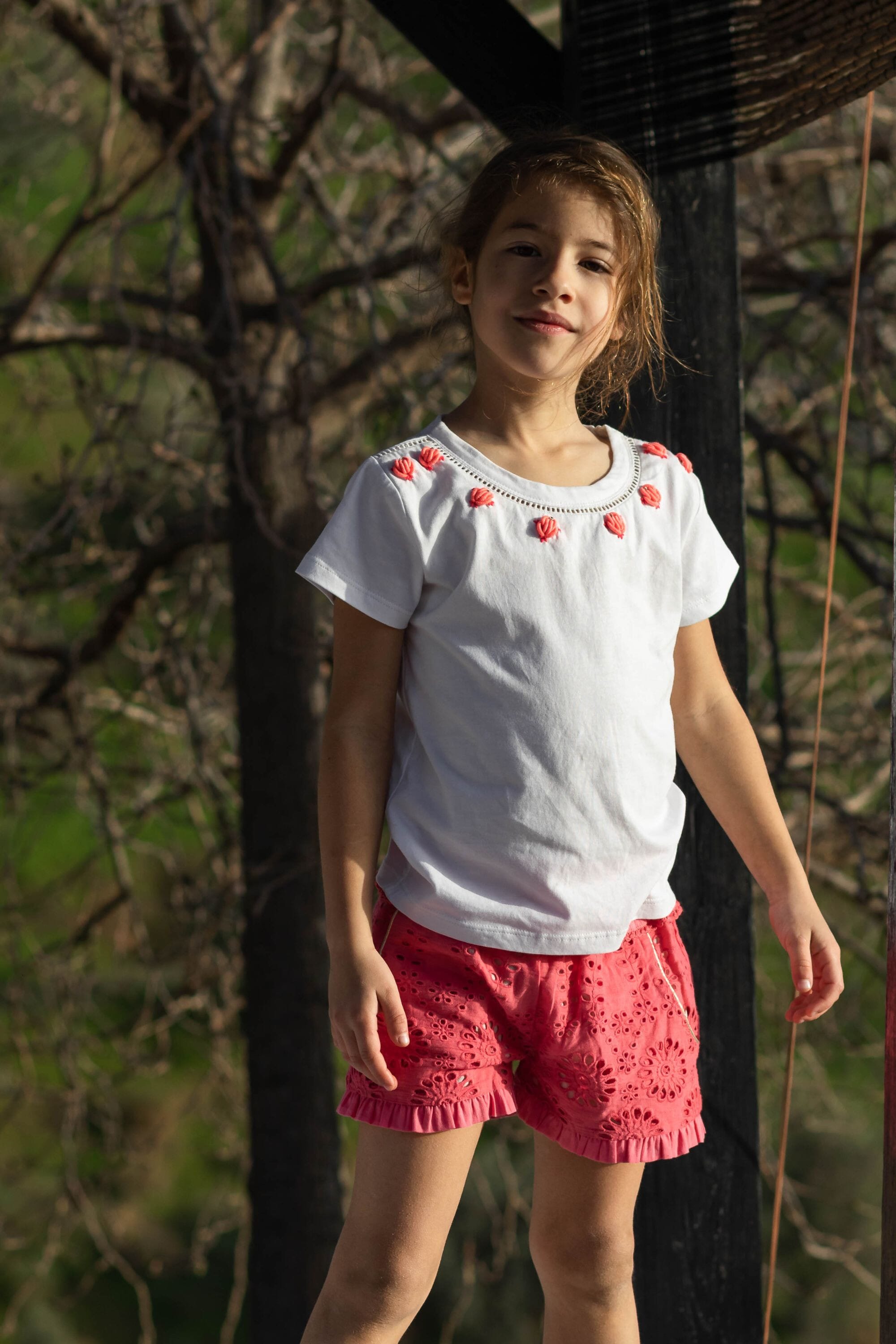 Un T-shirt en coton biologique avec des broderies main et des dentelles jour échelle sur le col et les épaules.