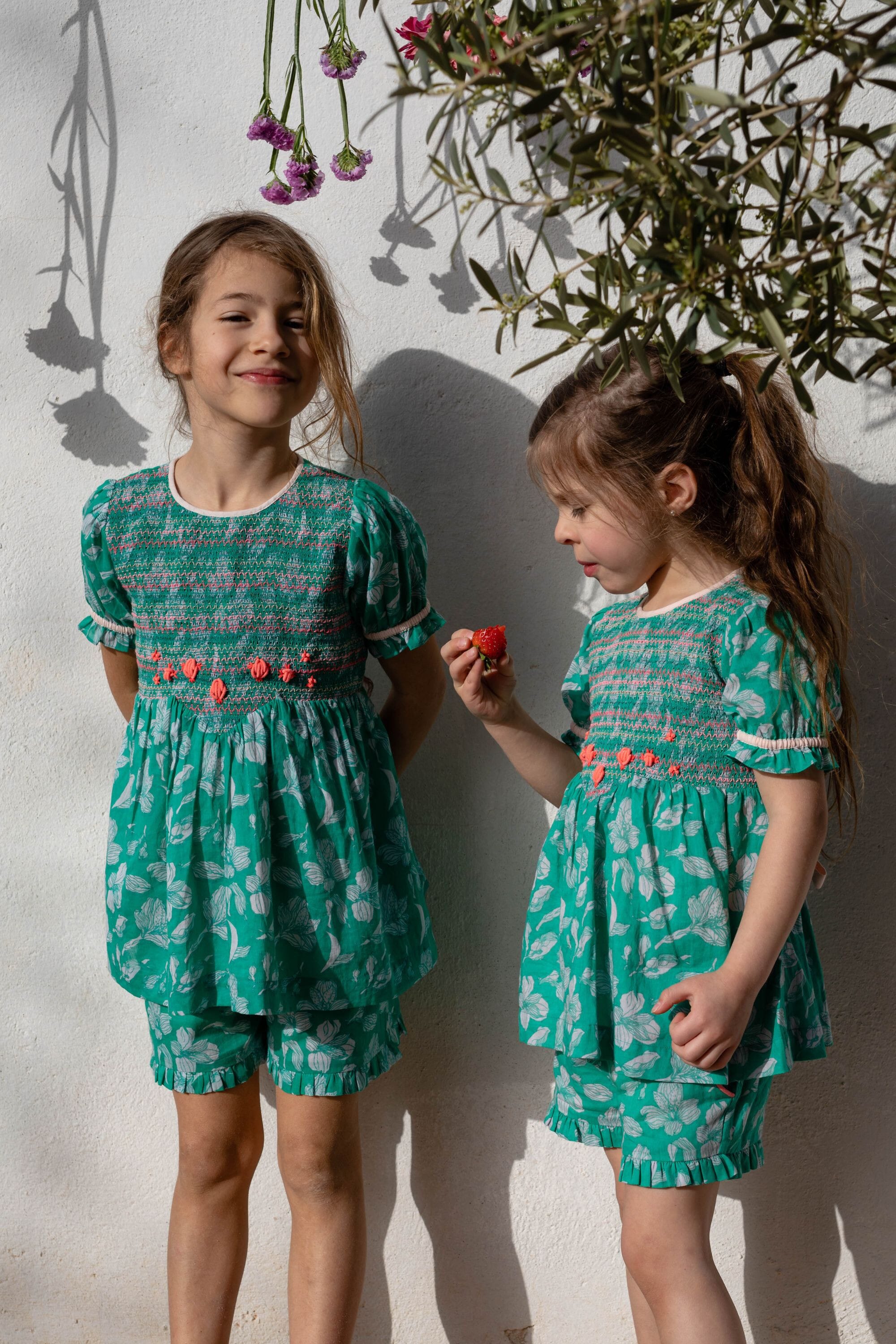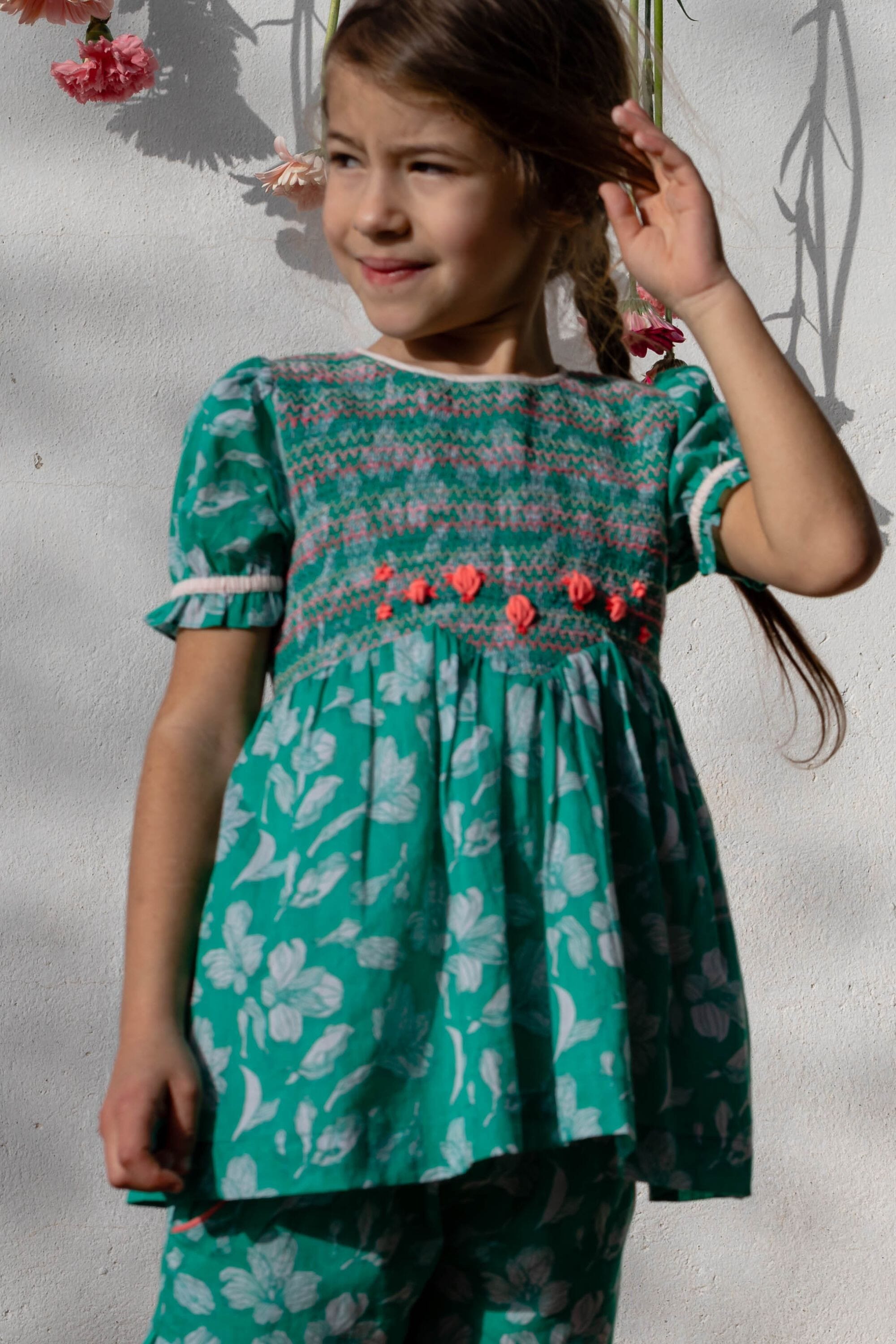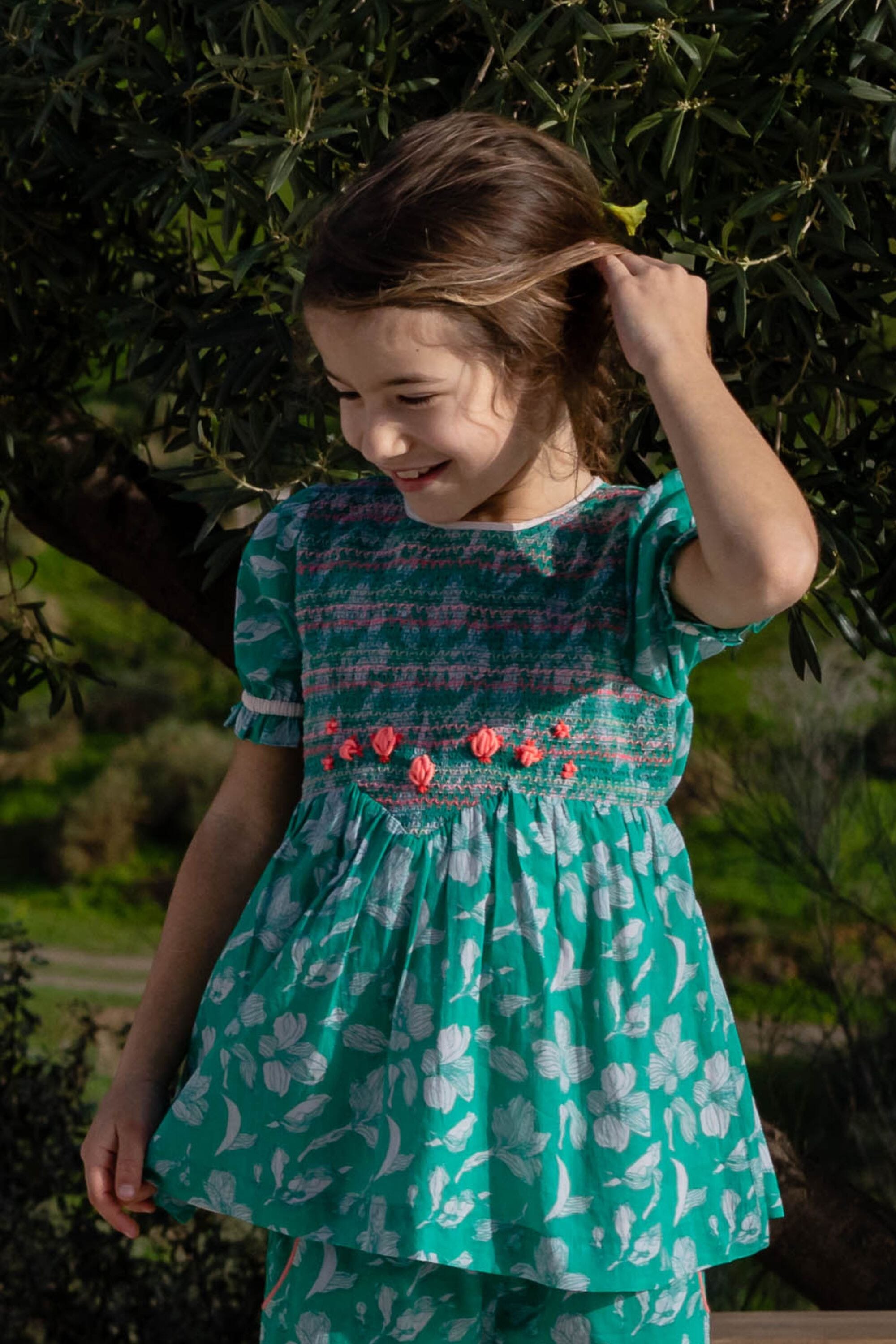Une blouse en coton biologique entièrement smockée sur le devant avec des broderies main.