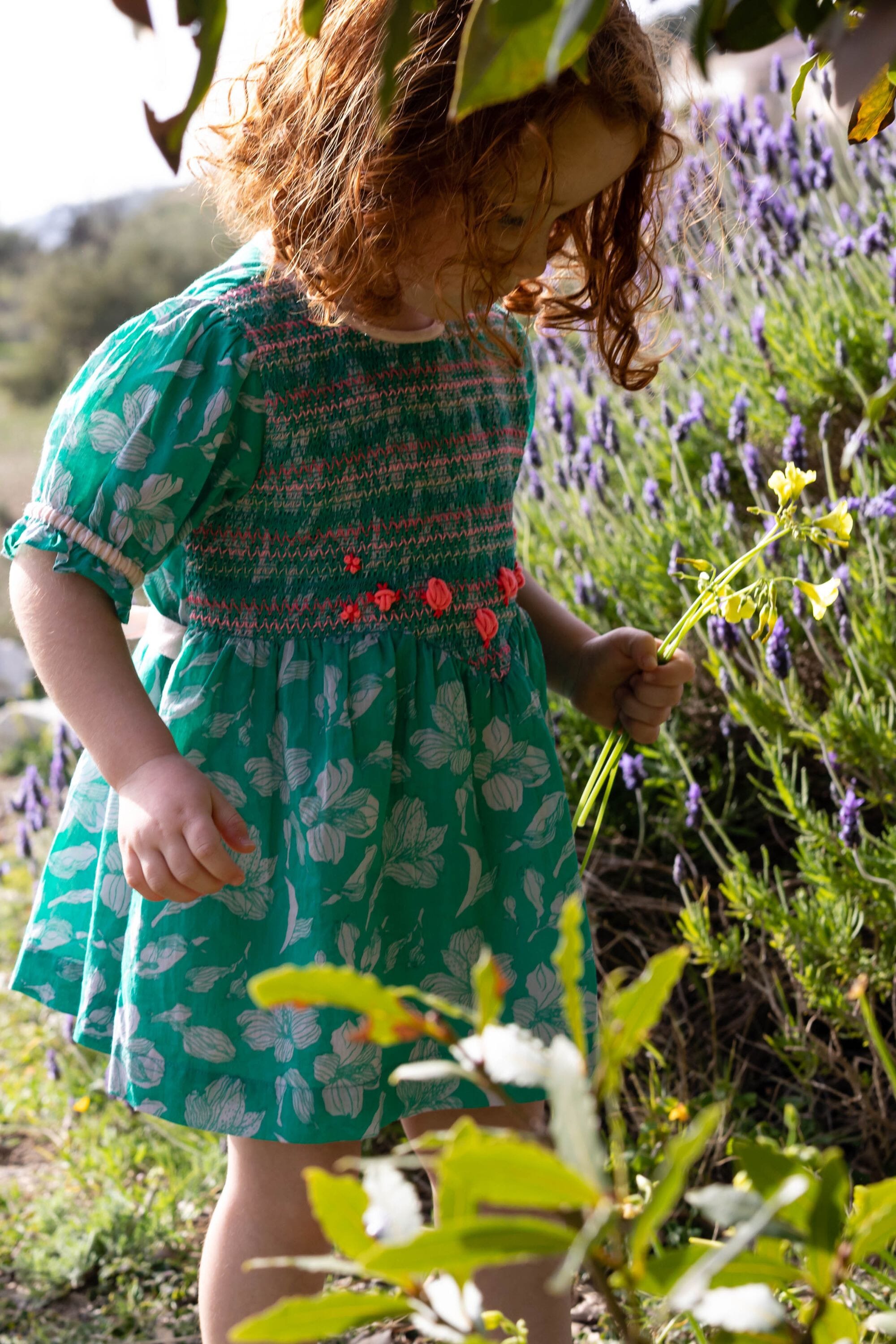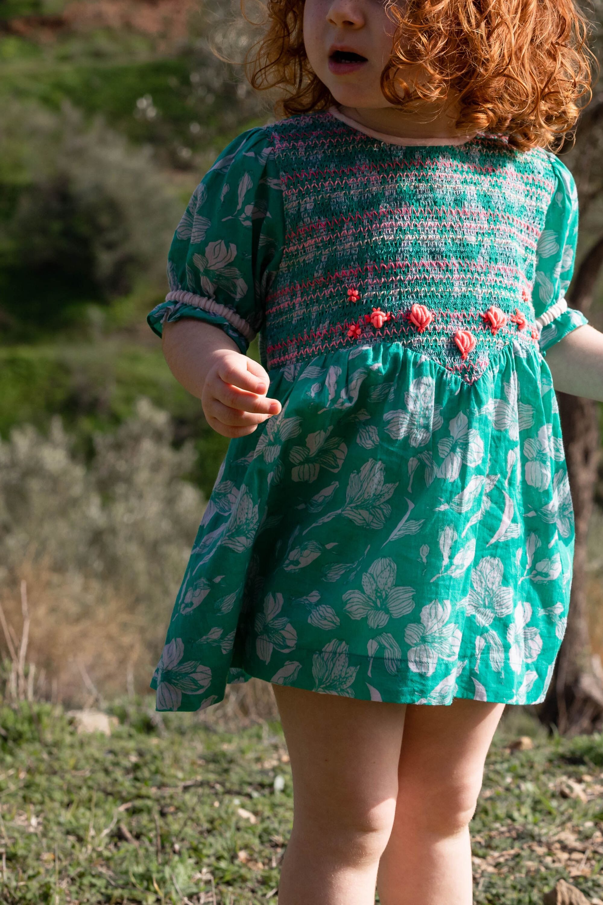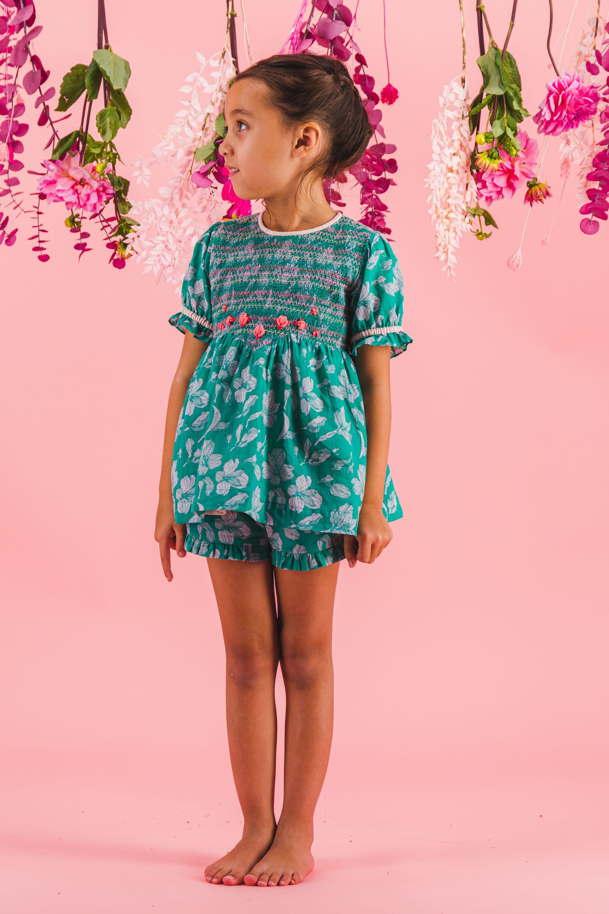 Une blouse en coton biologique entièrement smockée sur le devant avec des broderies main.