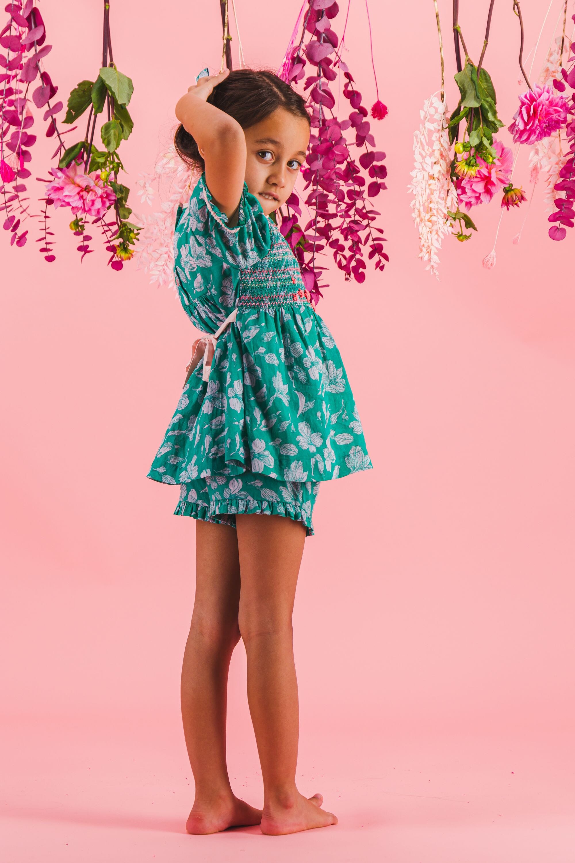 Blouse/Robe courte, 100% coton bio, Doublure unie en voile de coton bio, Blockprint, Entièrement smockée sur le devant, Broderies main, Fronces sur le devant et dans le dos, Manches courtes élastiquées, Boutons contrastés et ceinture dans le dos.