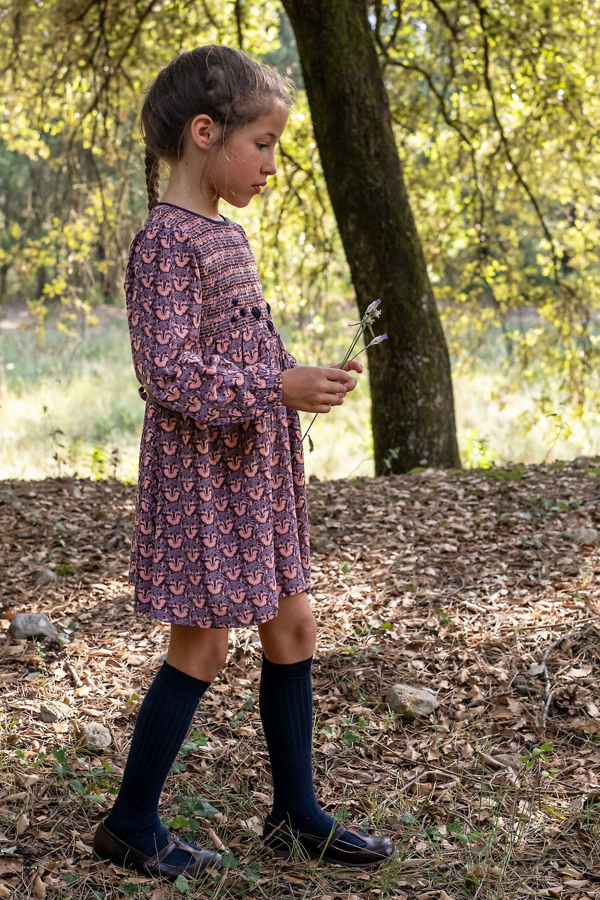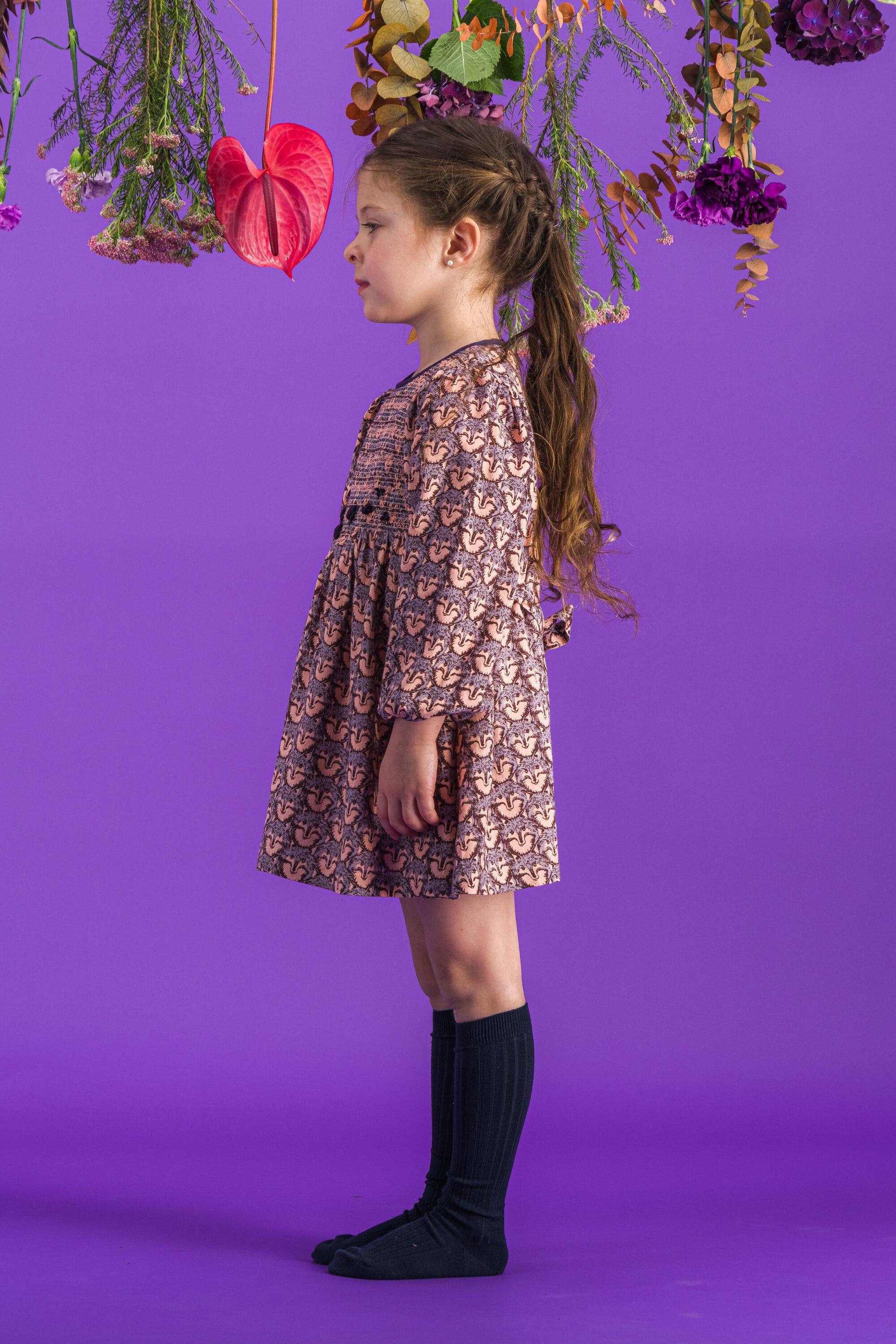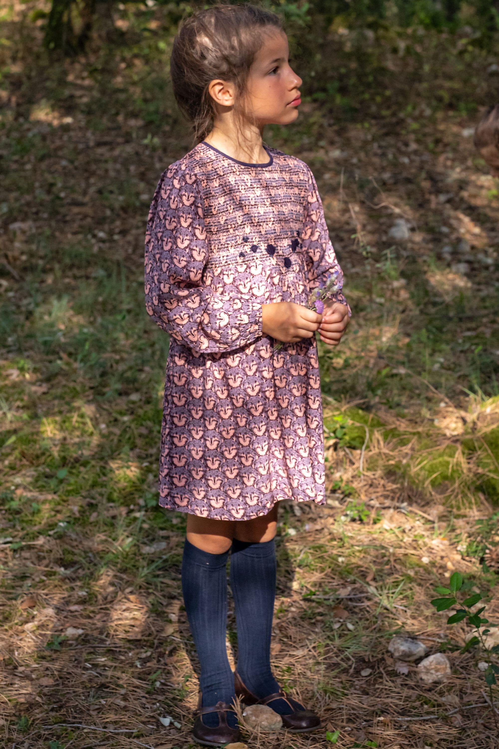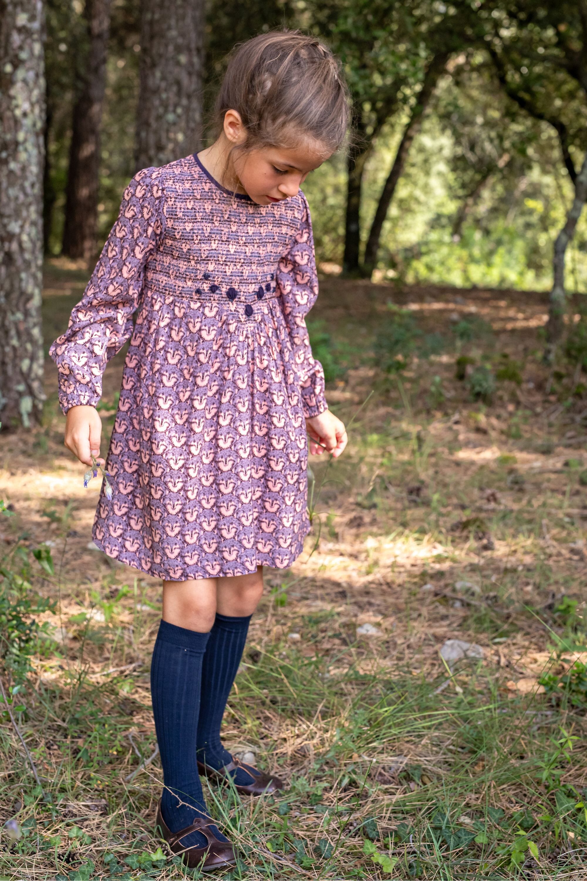 - Robe, 100% Viscose ECOVERO®, Imprimé Block print, Doublure unie en voile de coton bio, Entièrement smockée sur le devant, Broderies main, Manches longues élastiquées, Boutons contrastés et ceinture dans le dos.