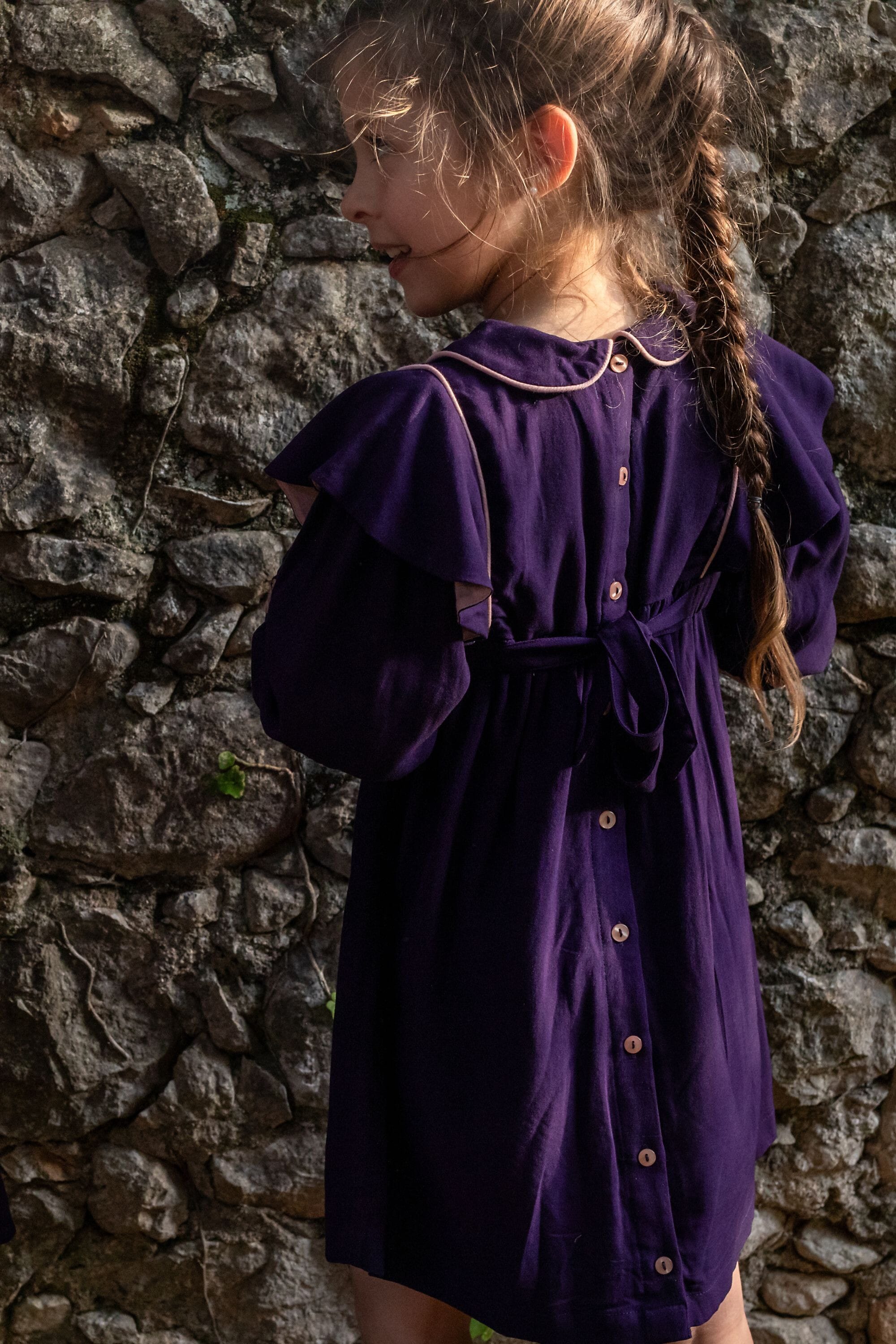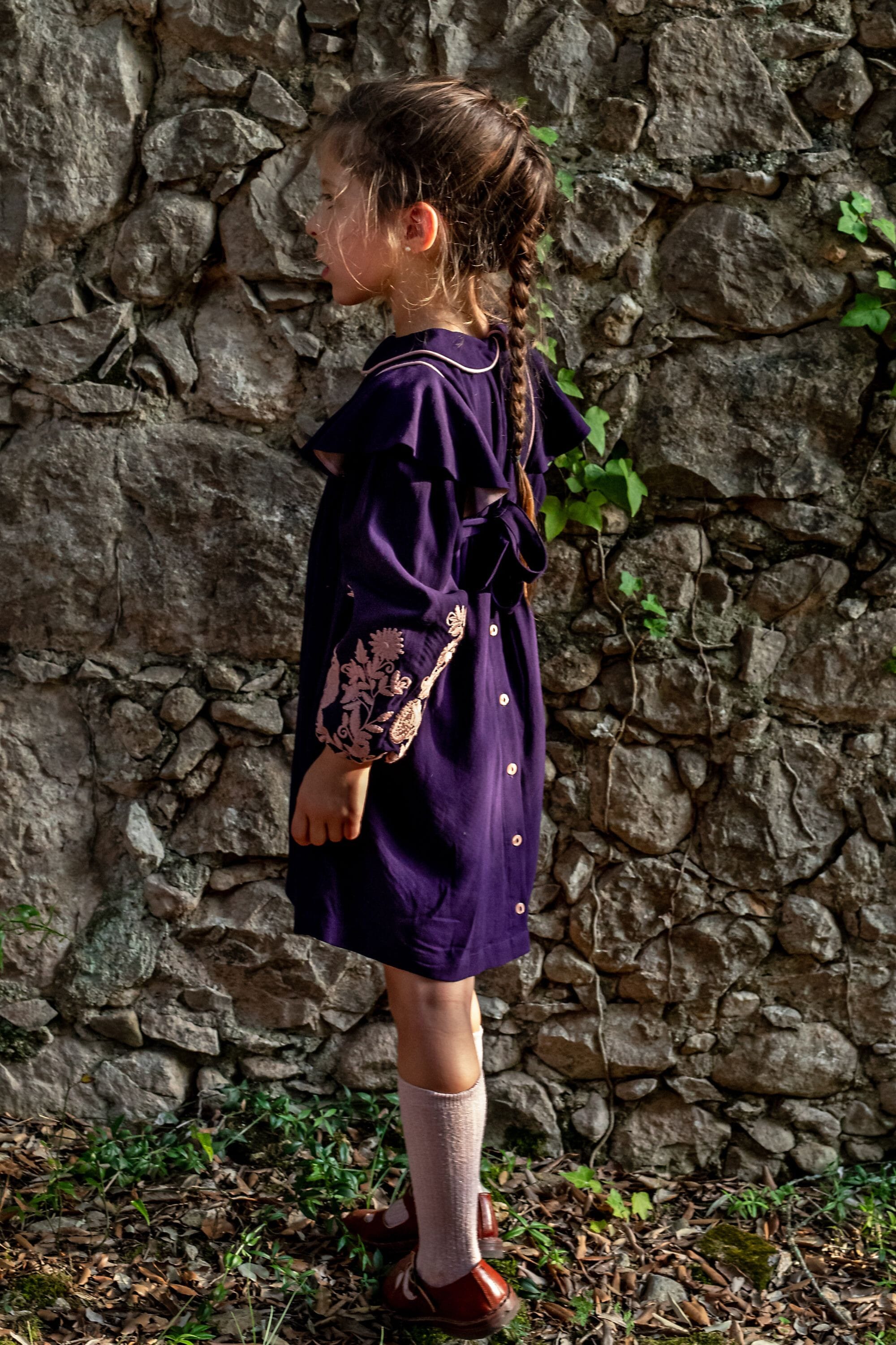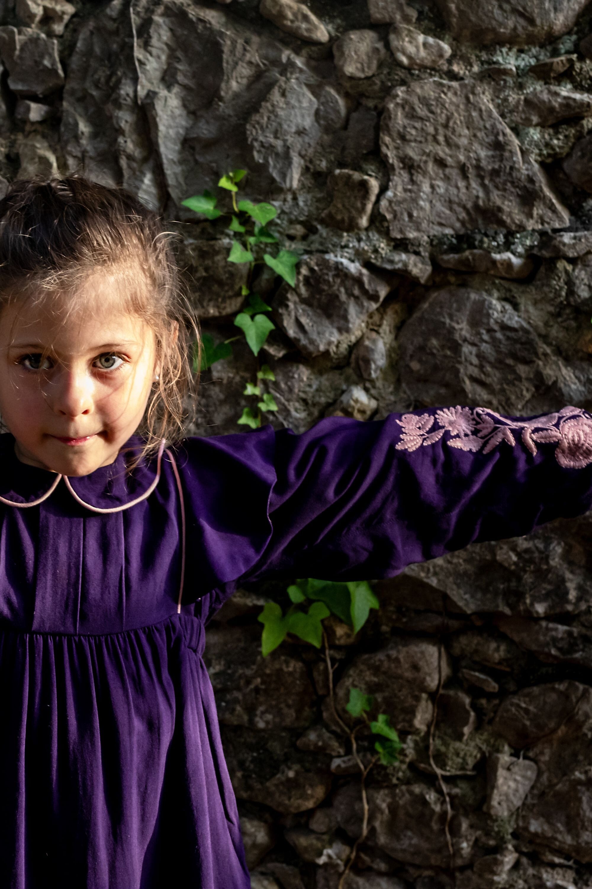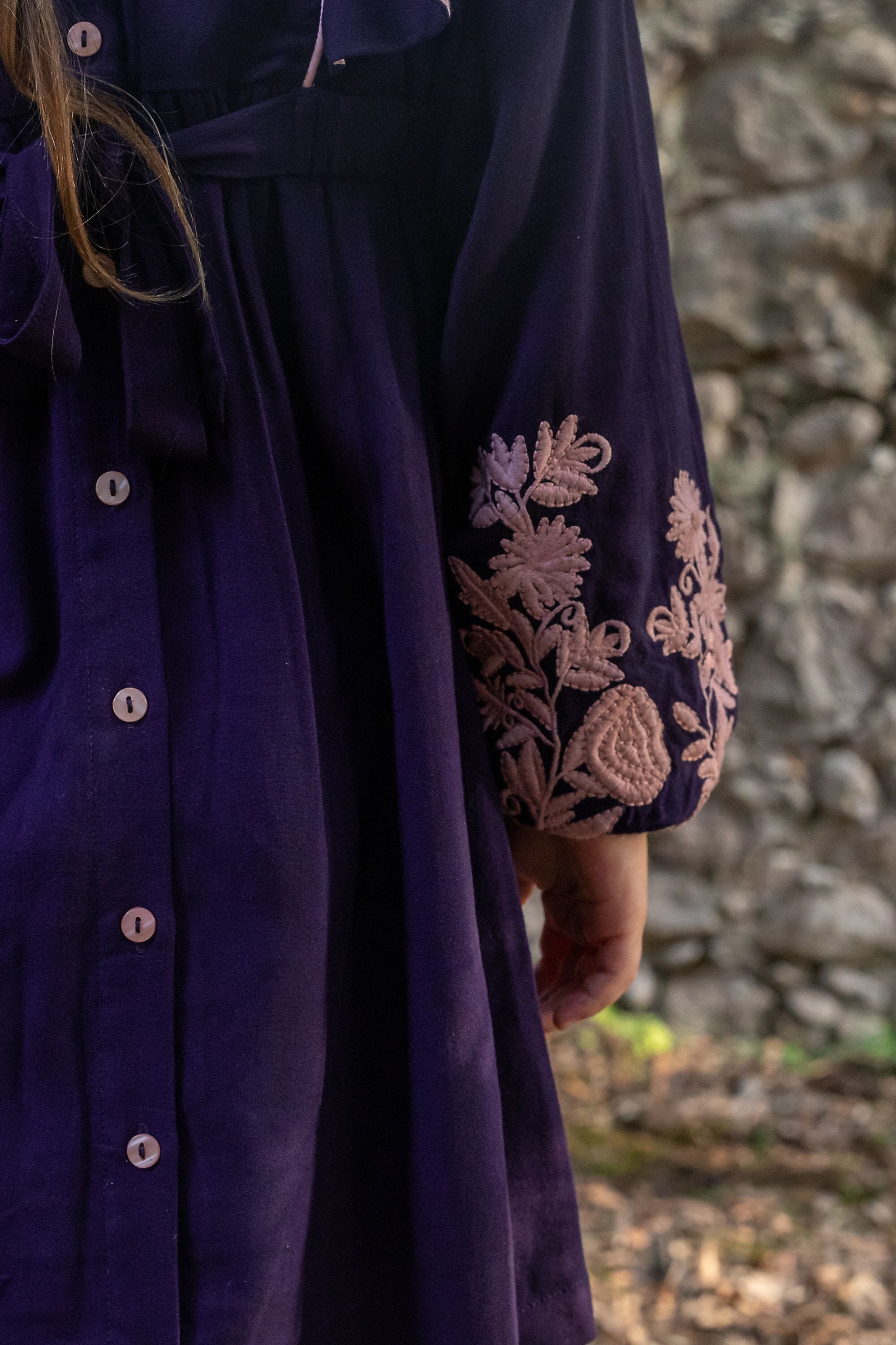 Une robe de couleur Violine en Viscose ECOVERO® avec un col Claudine et des broderies sur les manches.