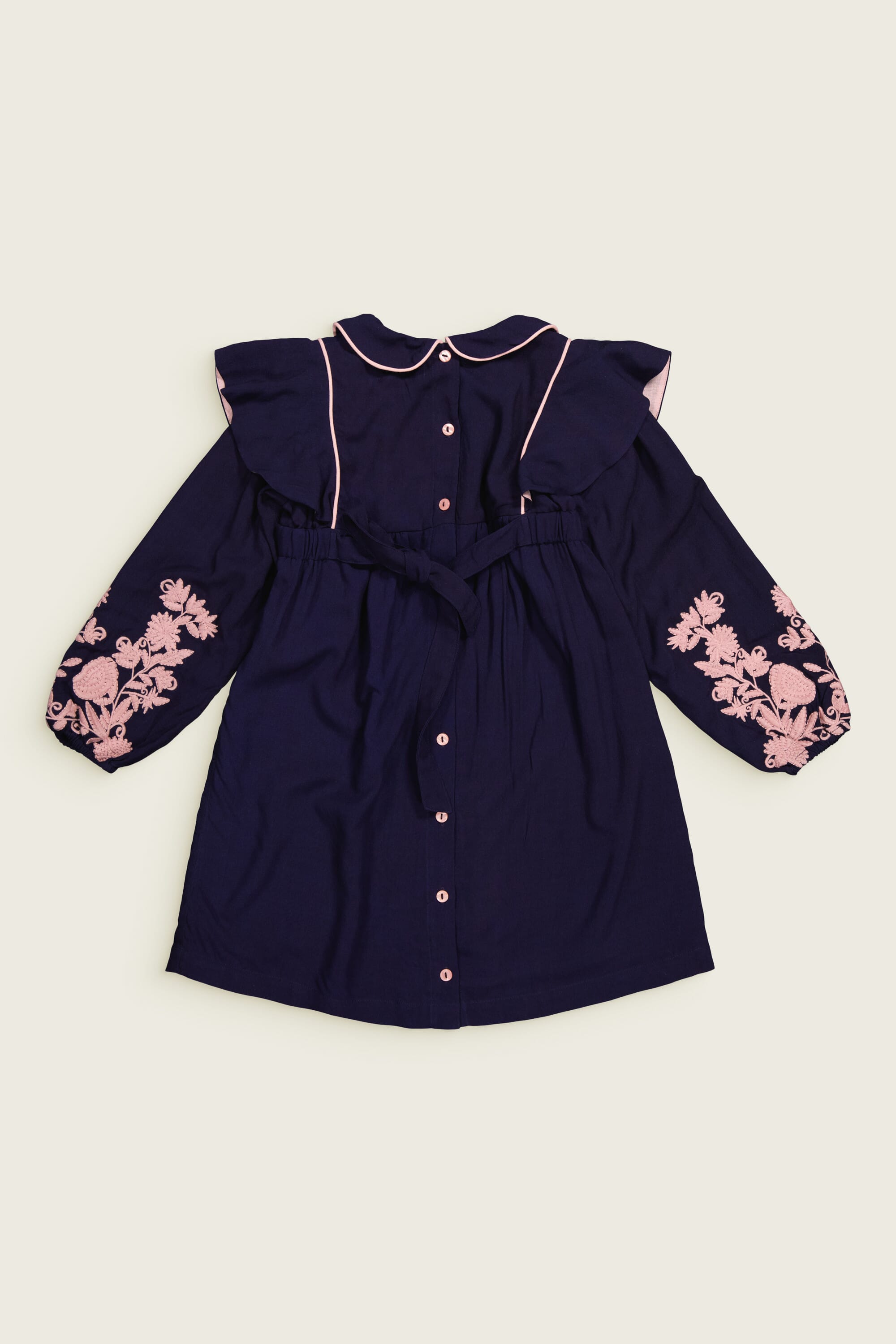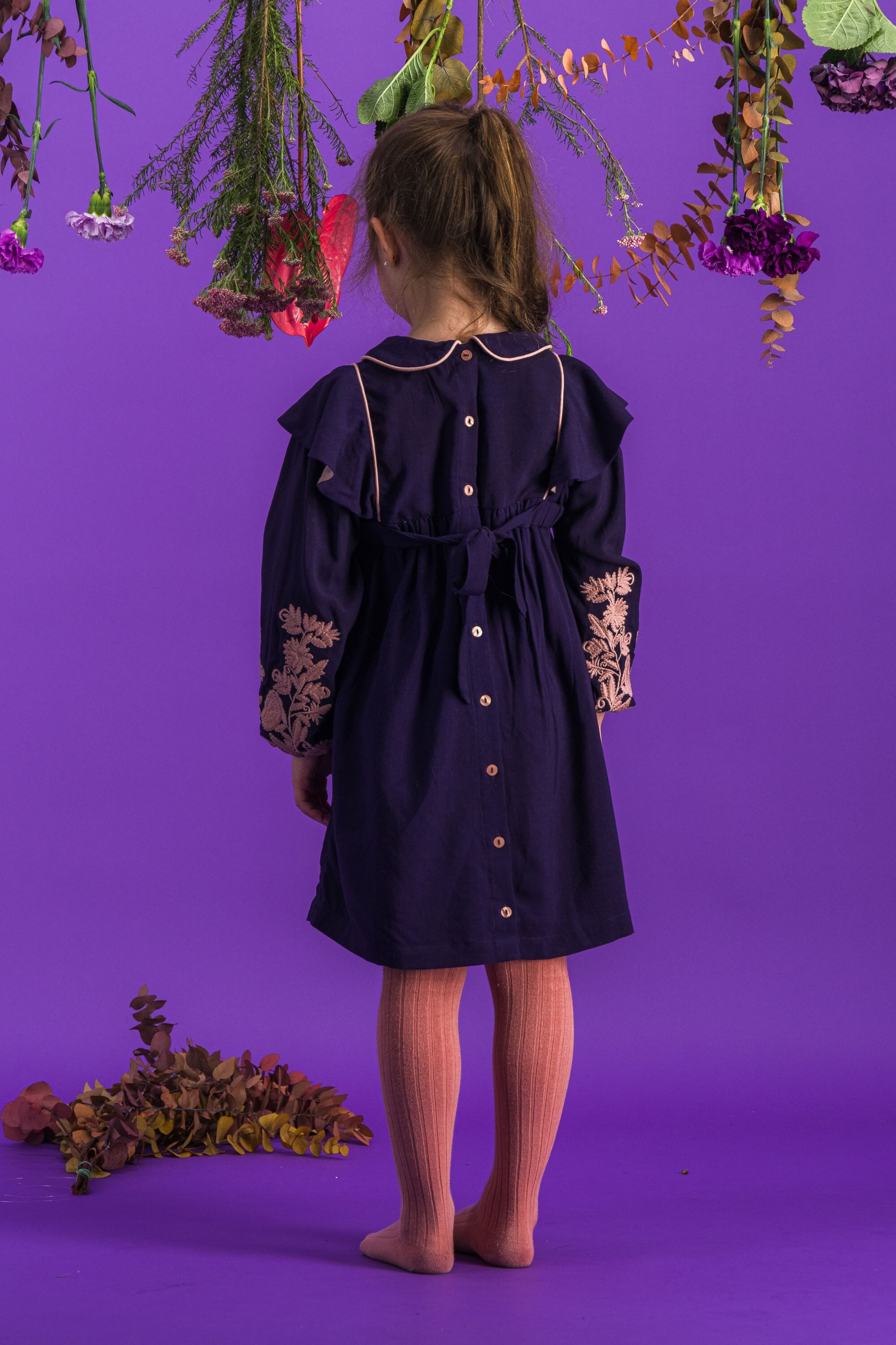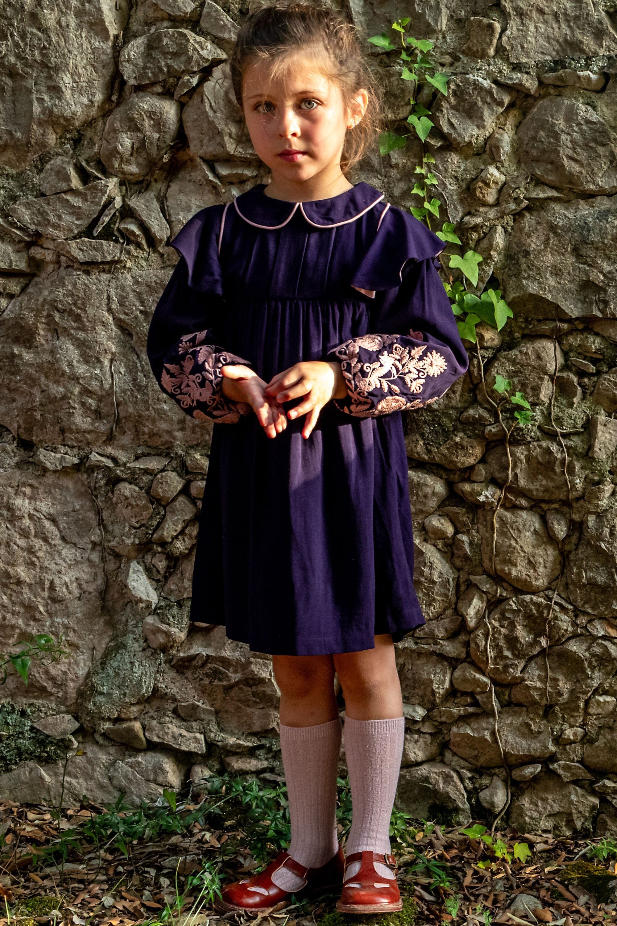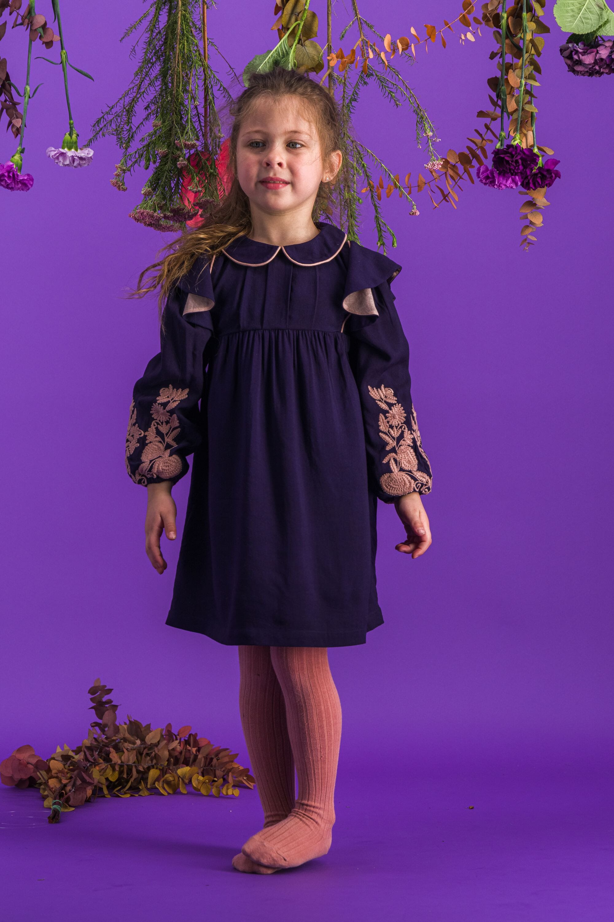 Une robe de couleur Violine en Viscose ECOVERO® avec un col Claudine et des broderies sur les manches.