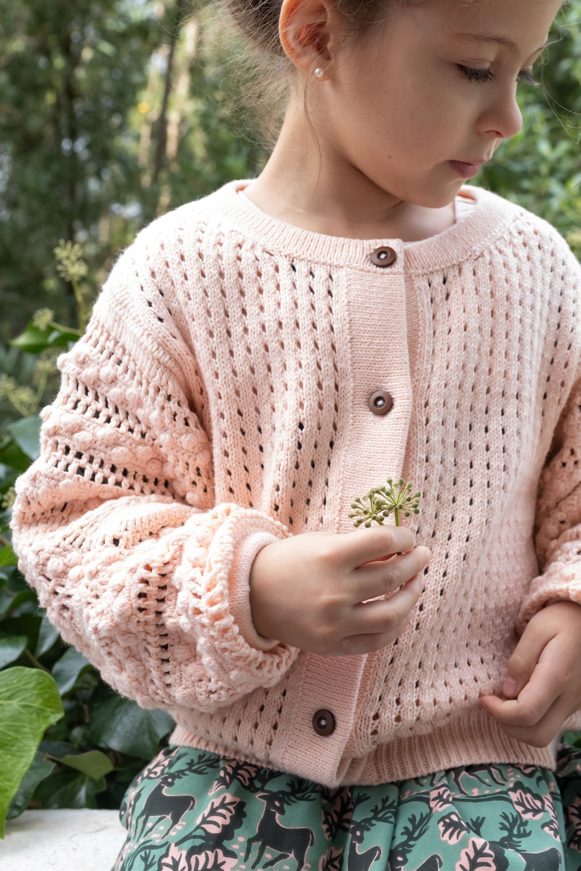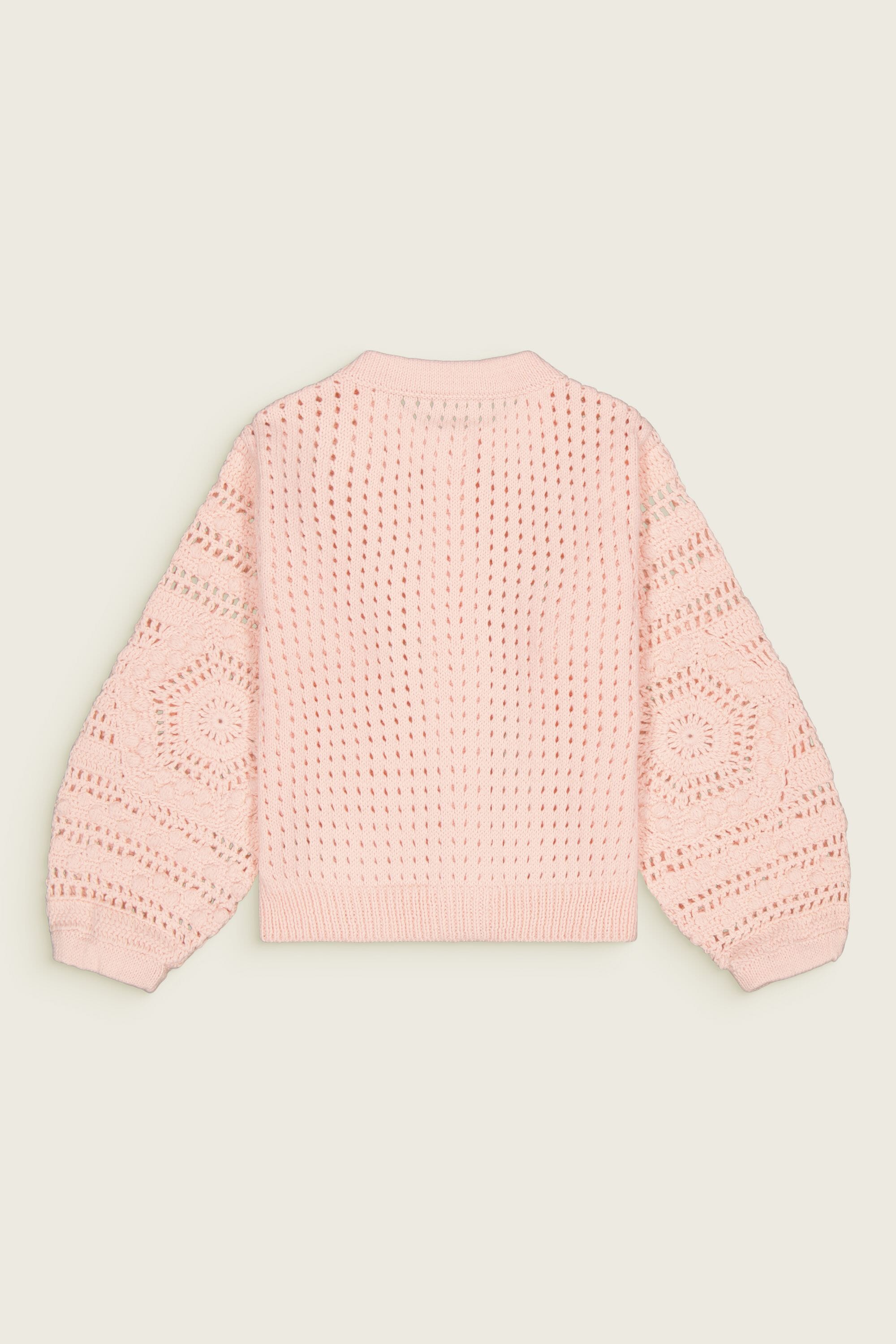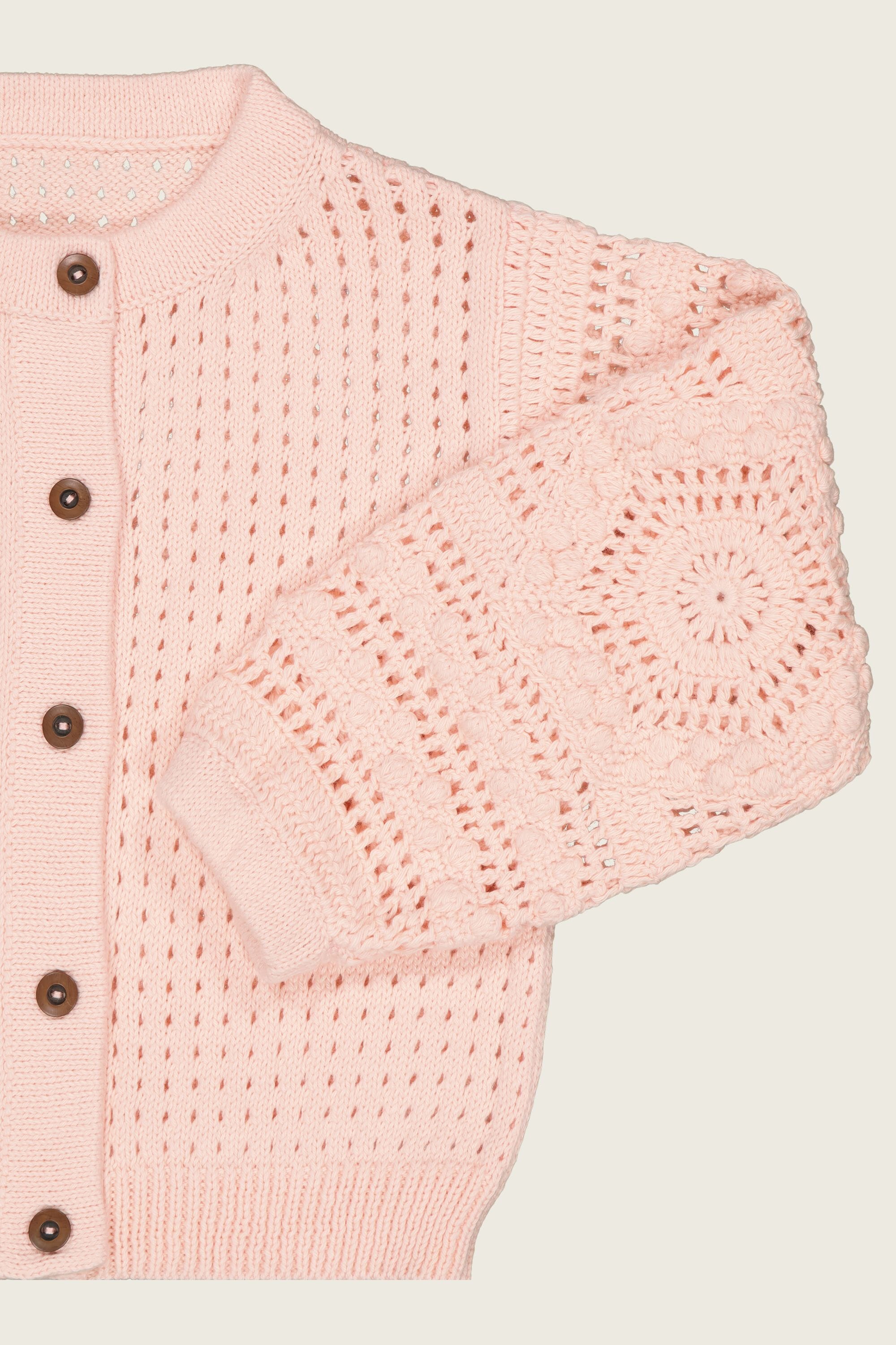 - Cardigan, 100% coton, Light pink, Tricoté main Crochet tricoté main sur les manches, Maille ajourée sur le devant et le derrière, Bouton en bois.