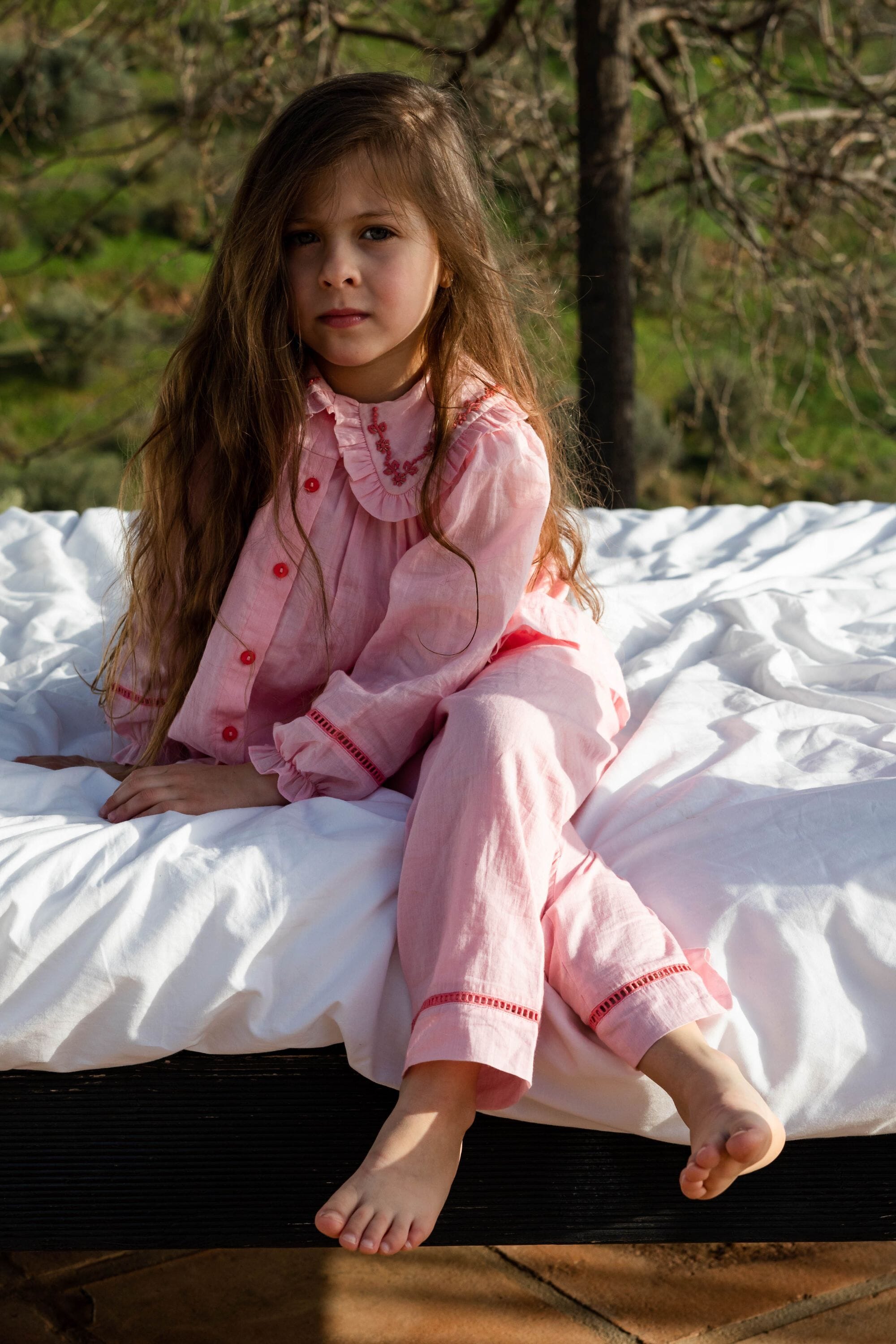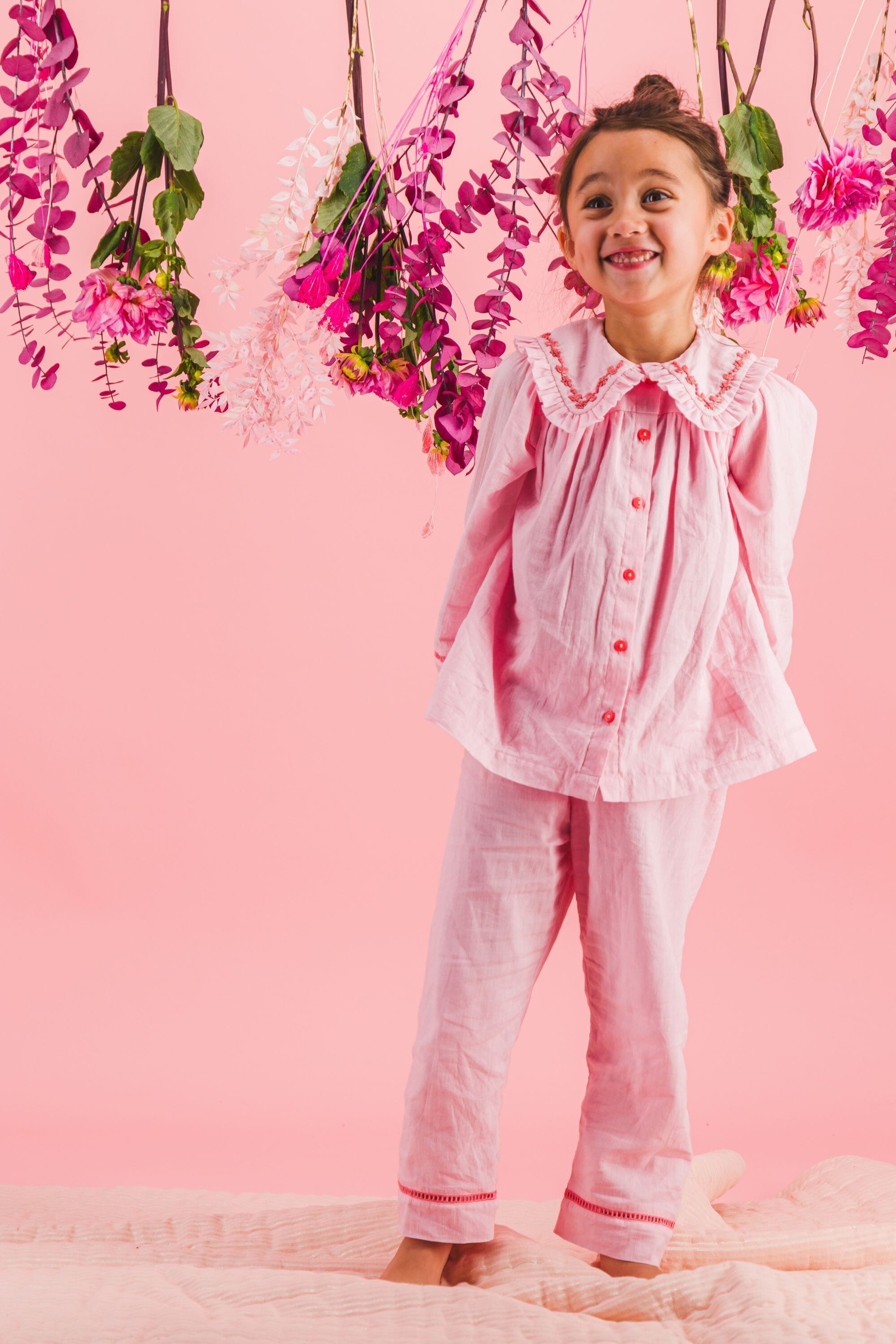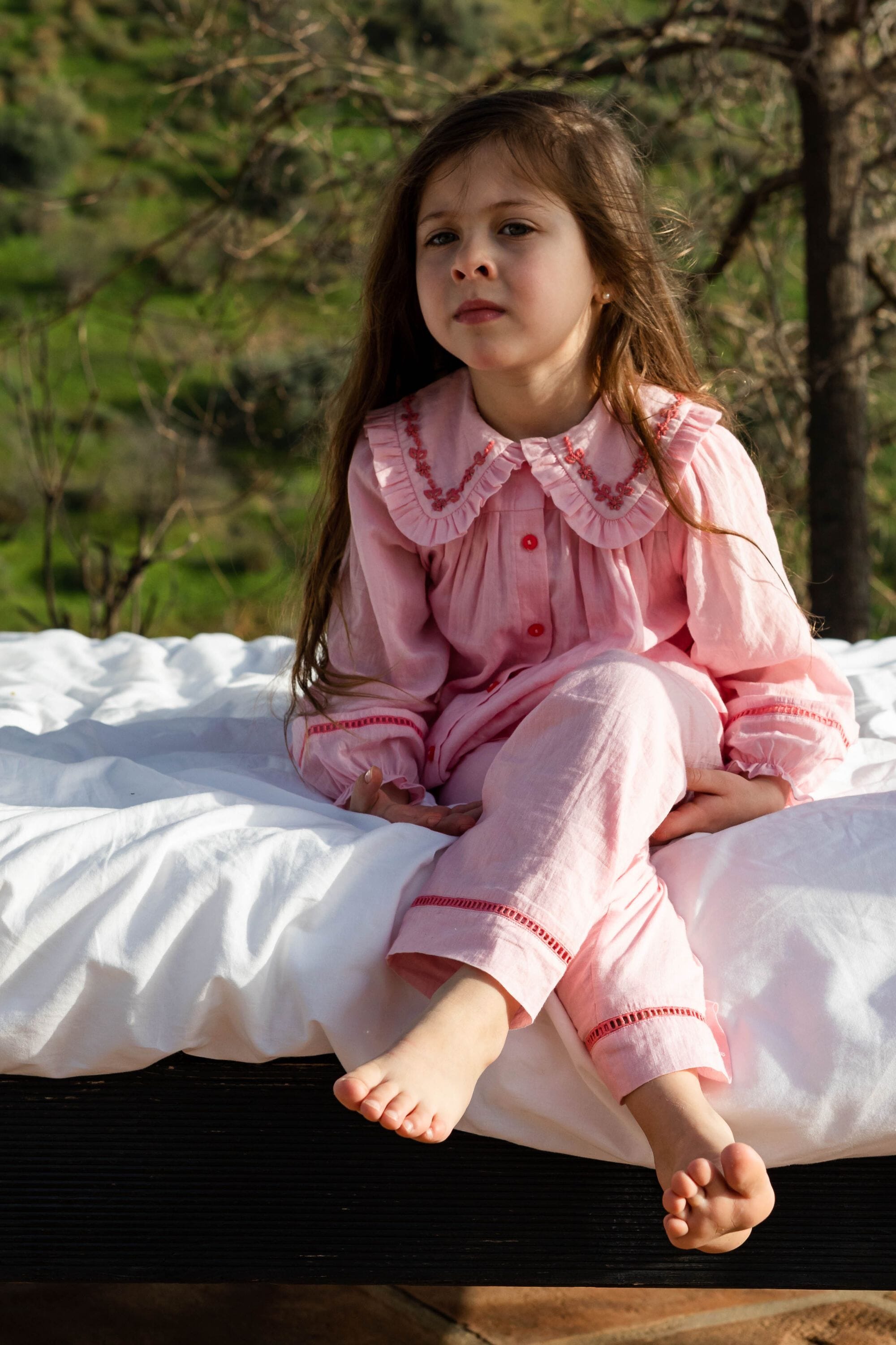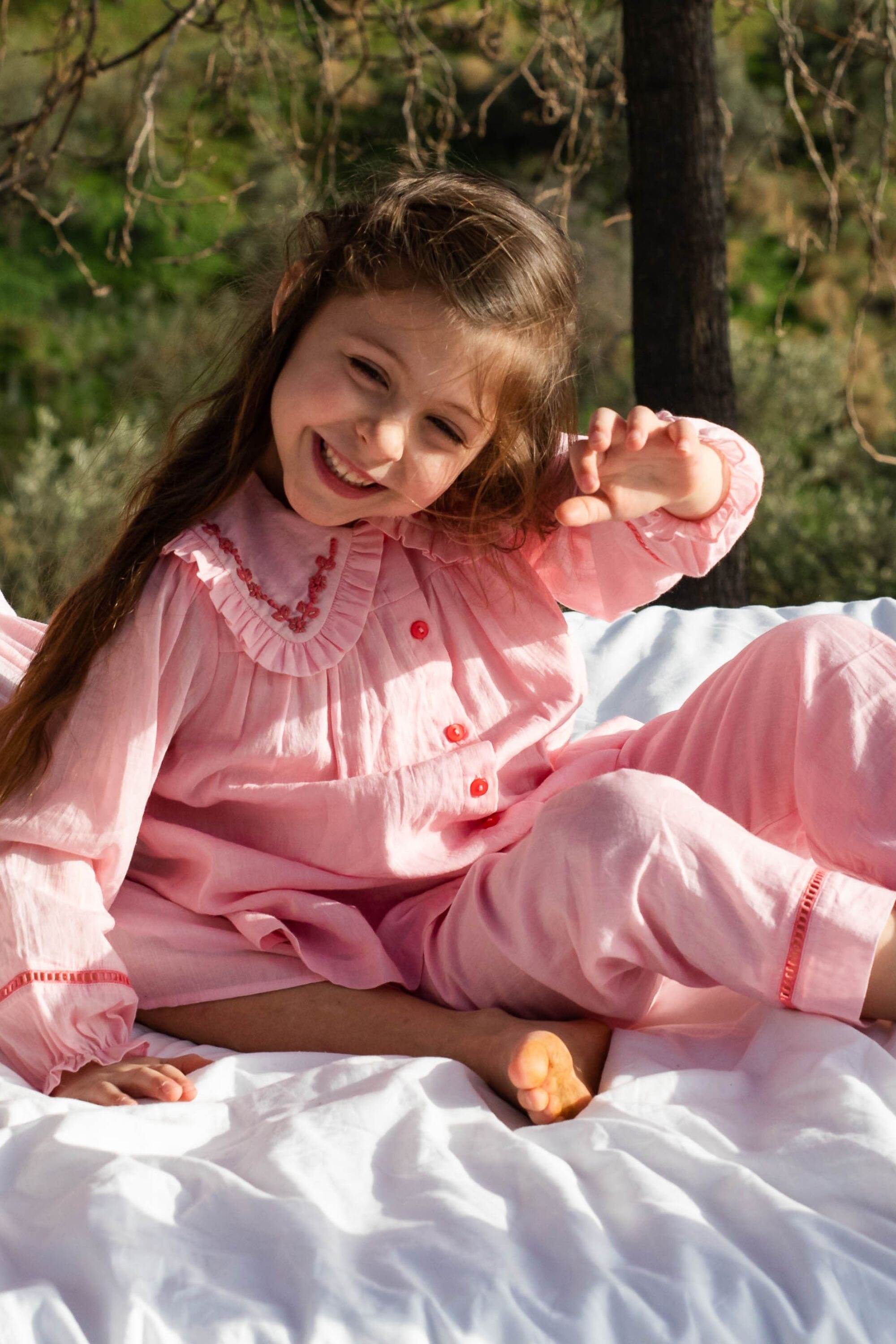 - Pyjama (pantalon et blouse), 100% coton bio, Doublure unie en voile de coton bio, Couleur Candy pink, Broderies main sur le col, Dentelles jour échelle en bas de manches et de jambes, fronces sur le devant, Boutons contrastés.