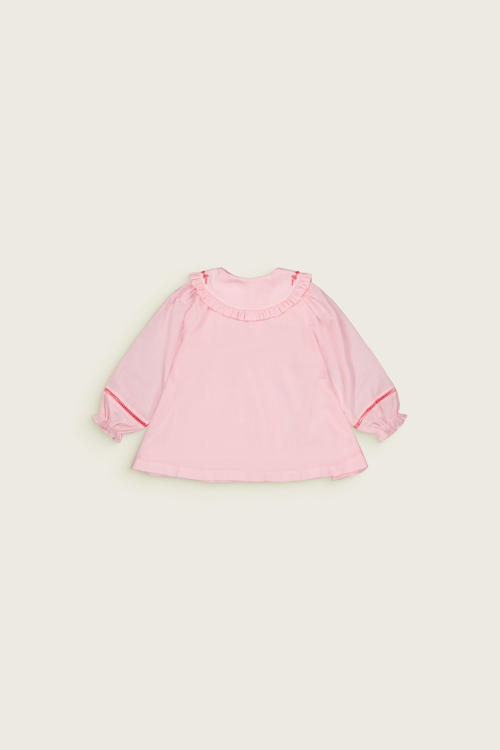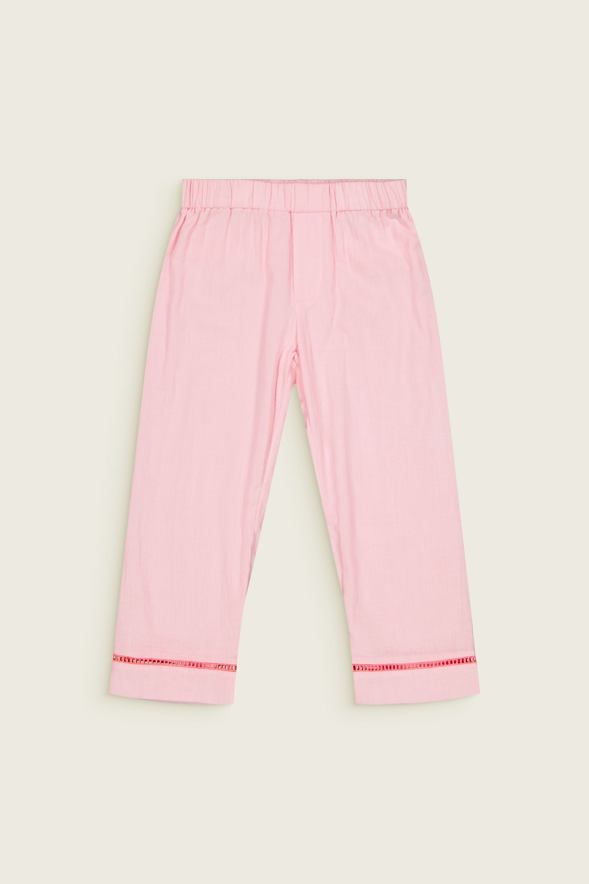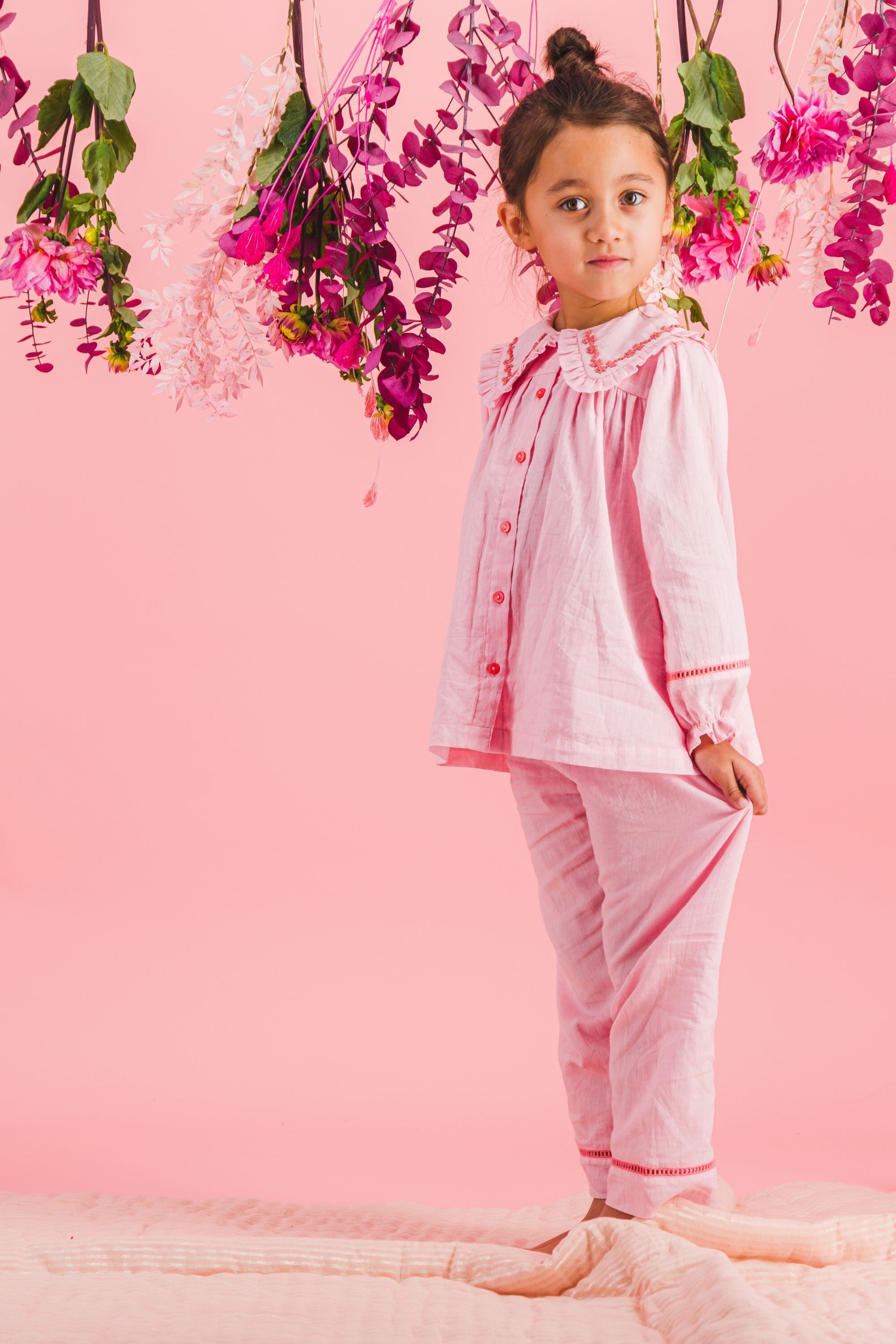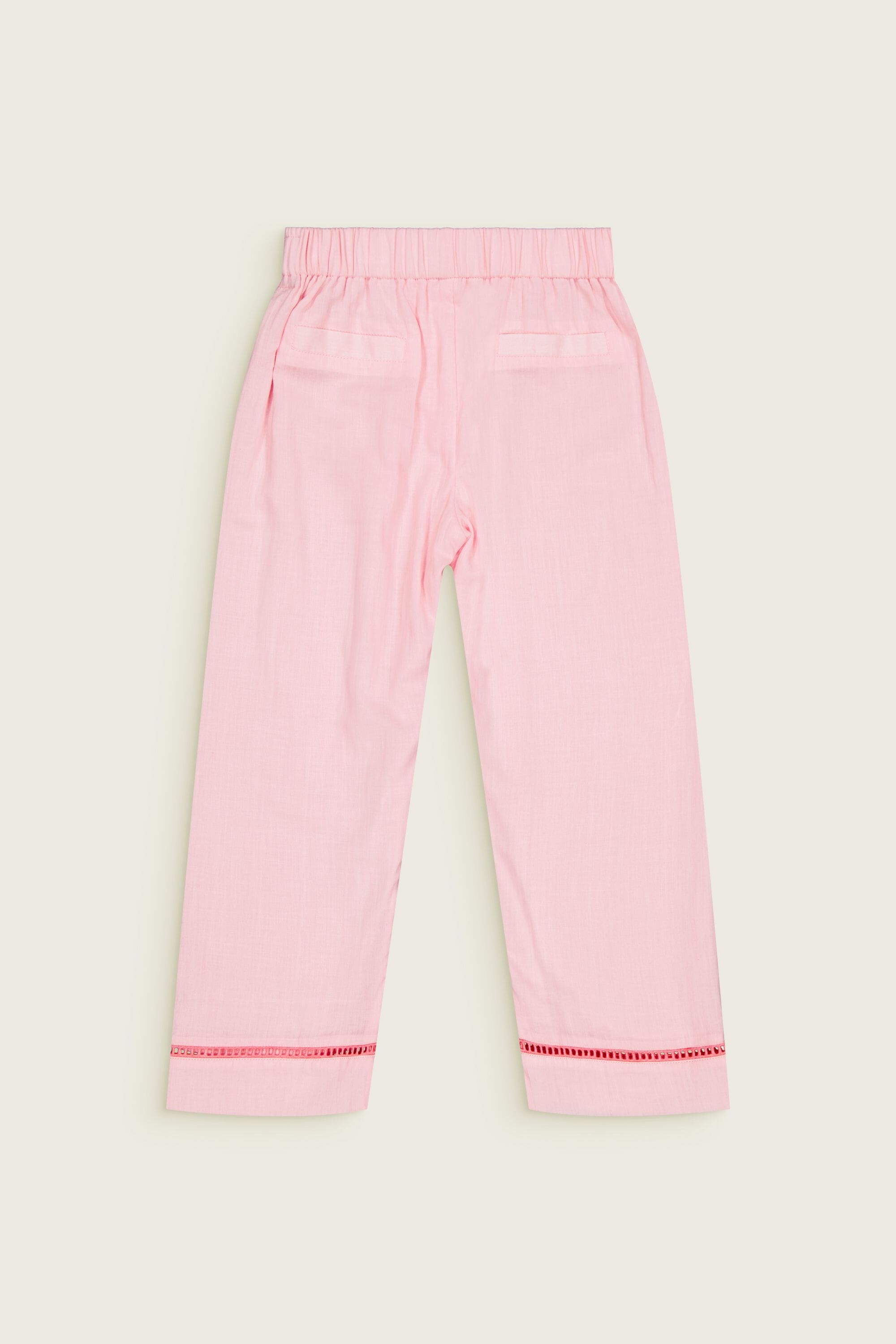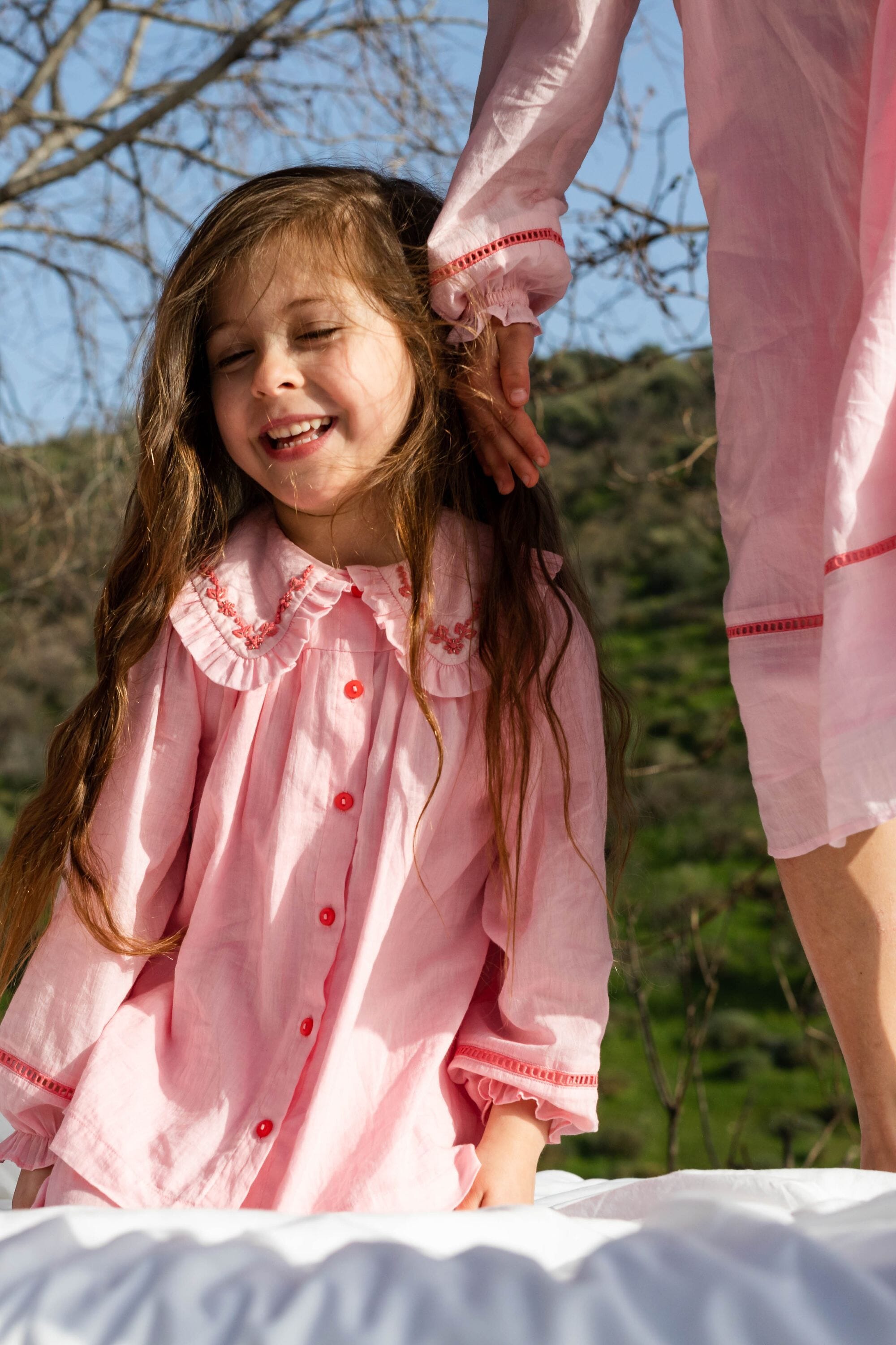 - Pyjama (pantalon et blouse), 100% coton bio, Doublure unie en voile de coton bio, Couleur Candy pink, Broderies main sur le col, Dentelles jour échelle en bas de manches et de jambes, fronces sur le devant, Boutons contrastés.