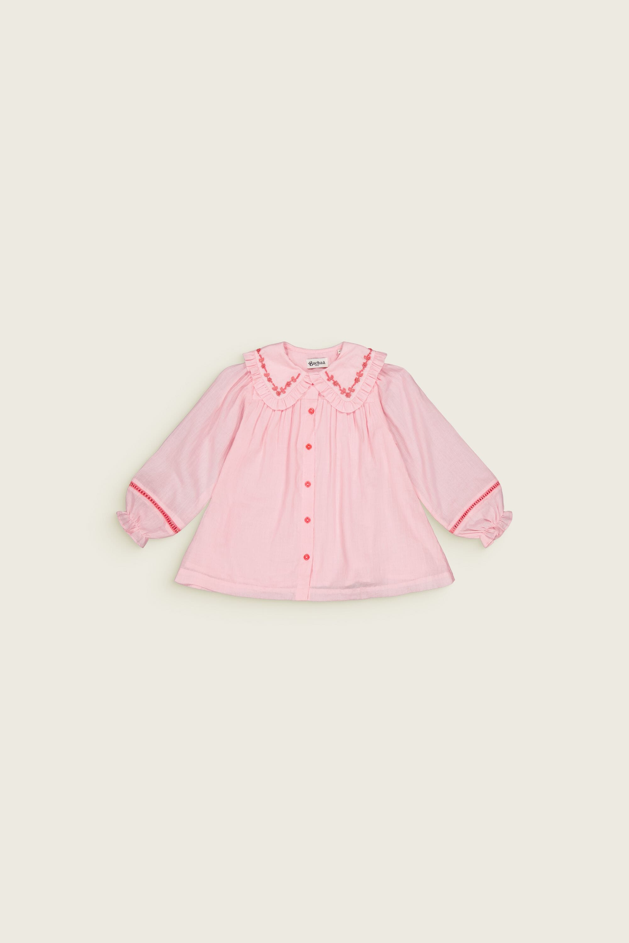 Un pyjama en coton biologique qui associe un pantalon et une blouse avec des broderies main sur le col.