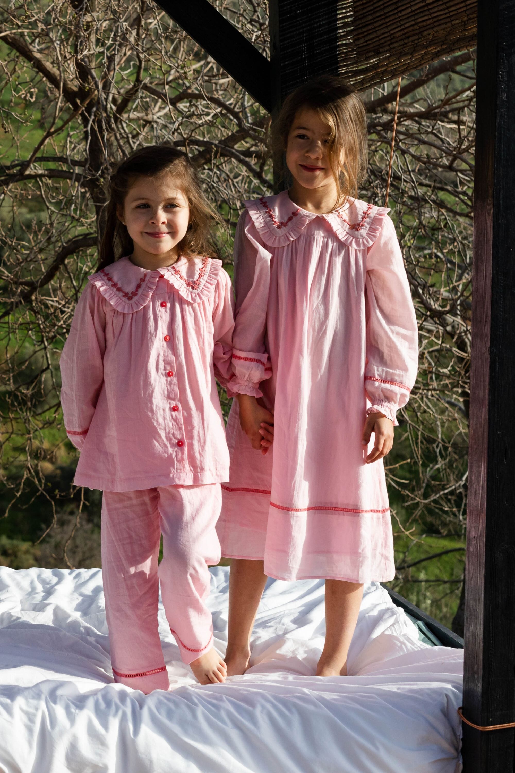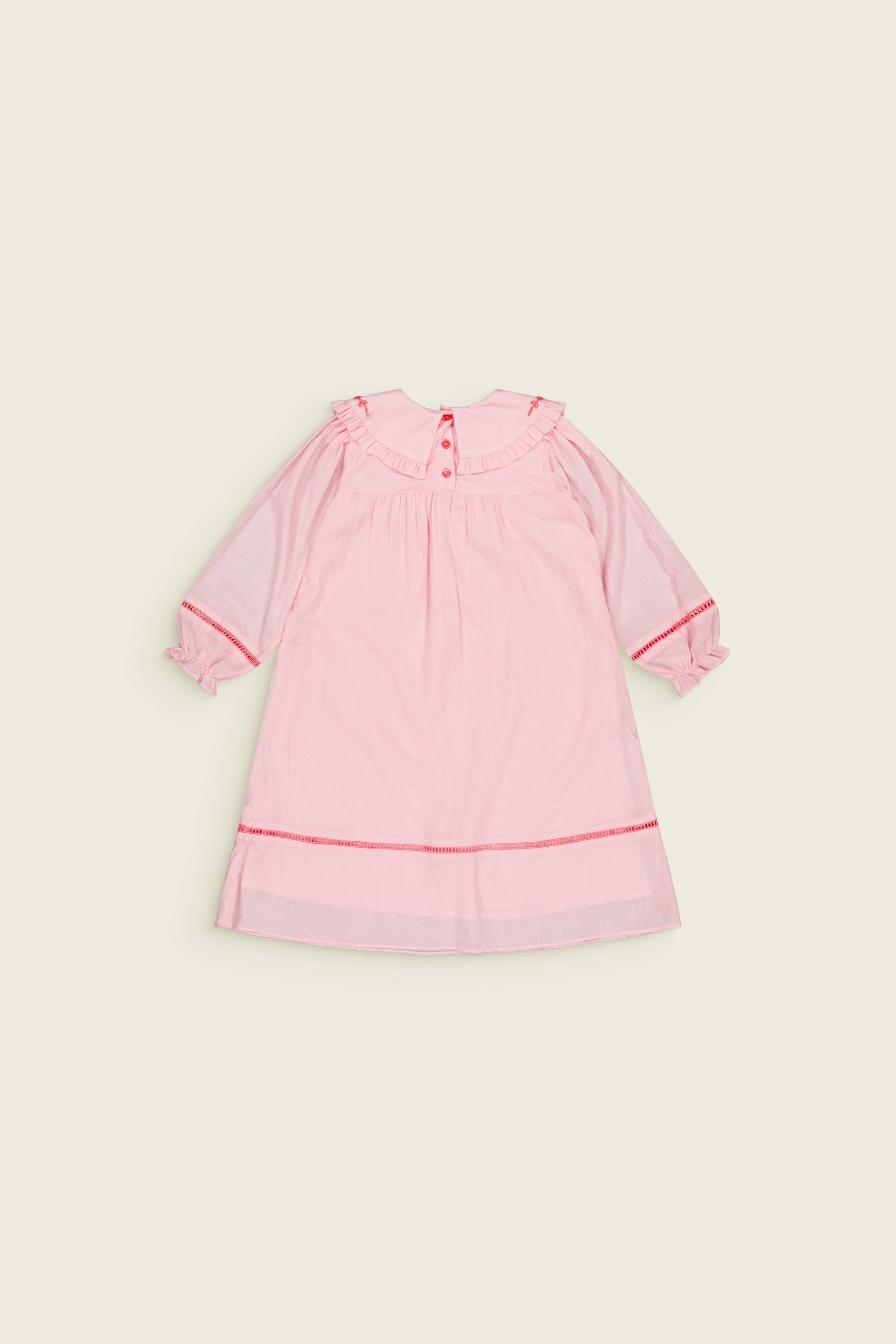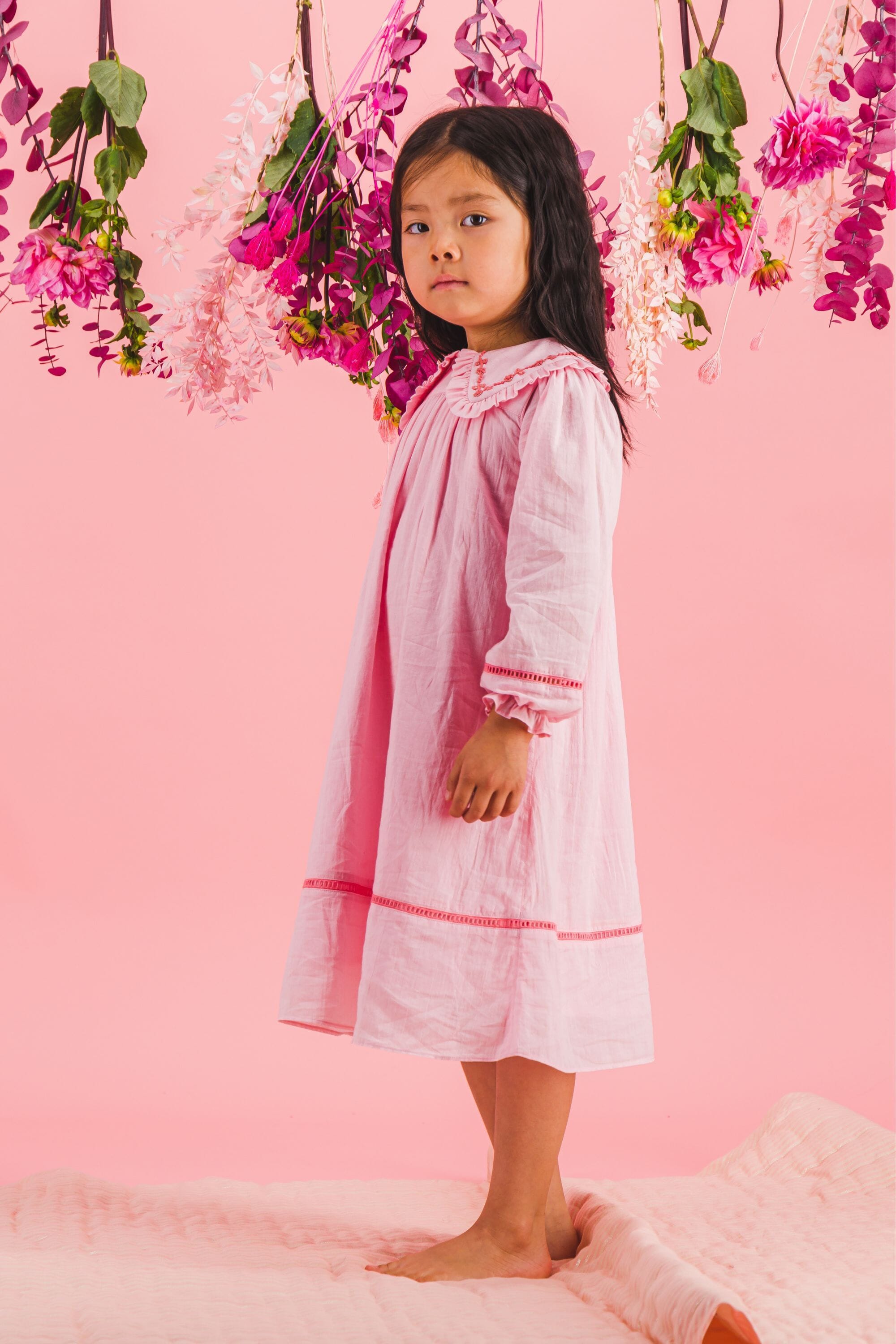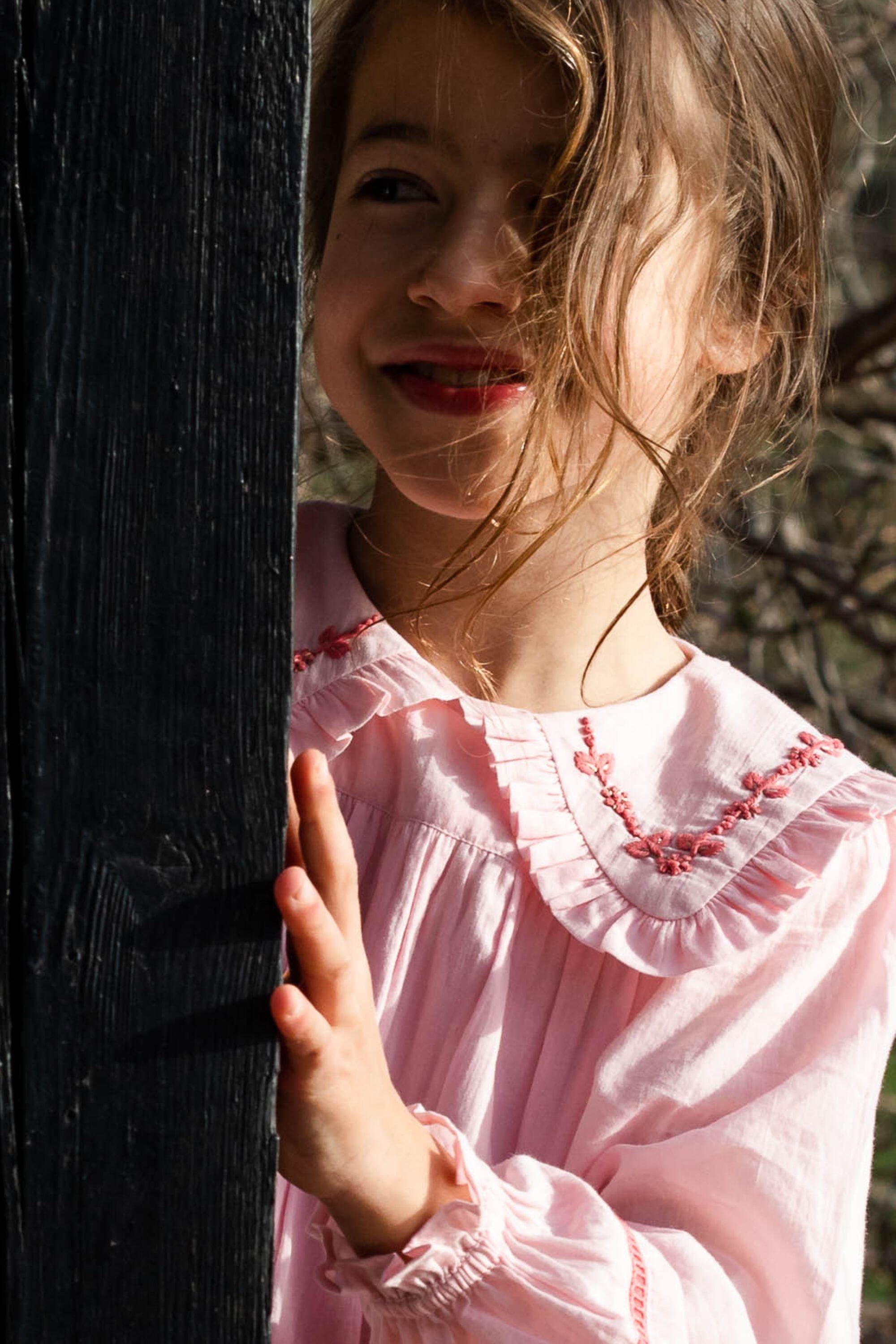 - Chemise de nuit, 100% coton bio, Doublure unie en voile de coton bio, Couleur Candy pink, Broderies main sur le col, Dentelles jour échelle en bas de manches et sur le devant, fronces sur le devant et dans le dos, Boutons contrastés.