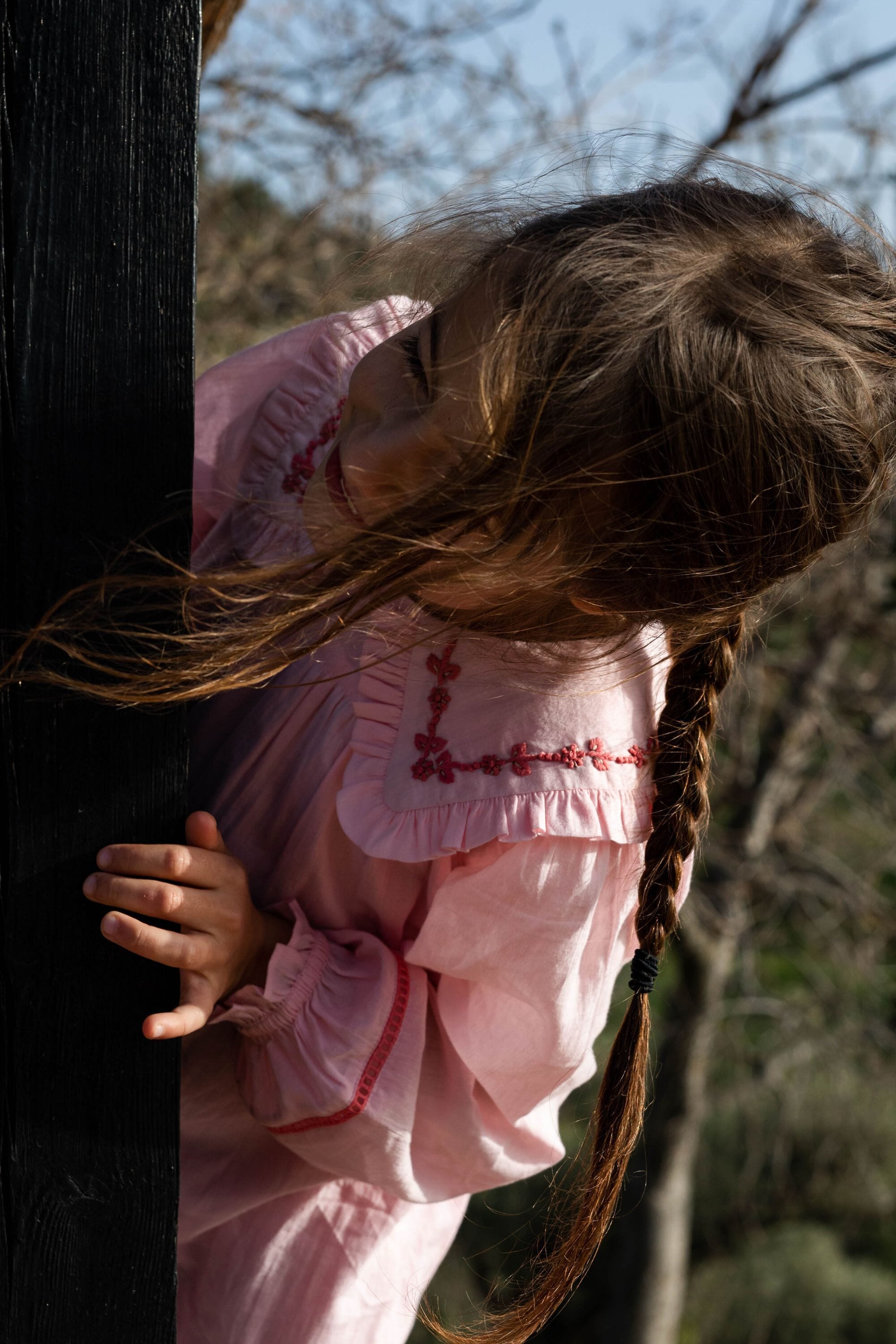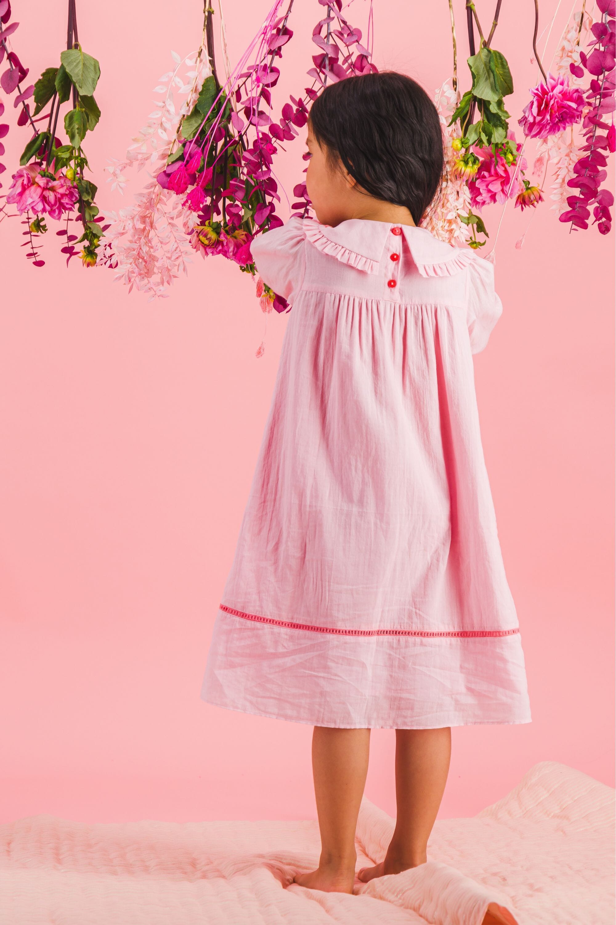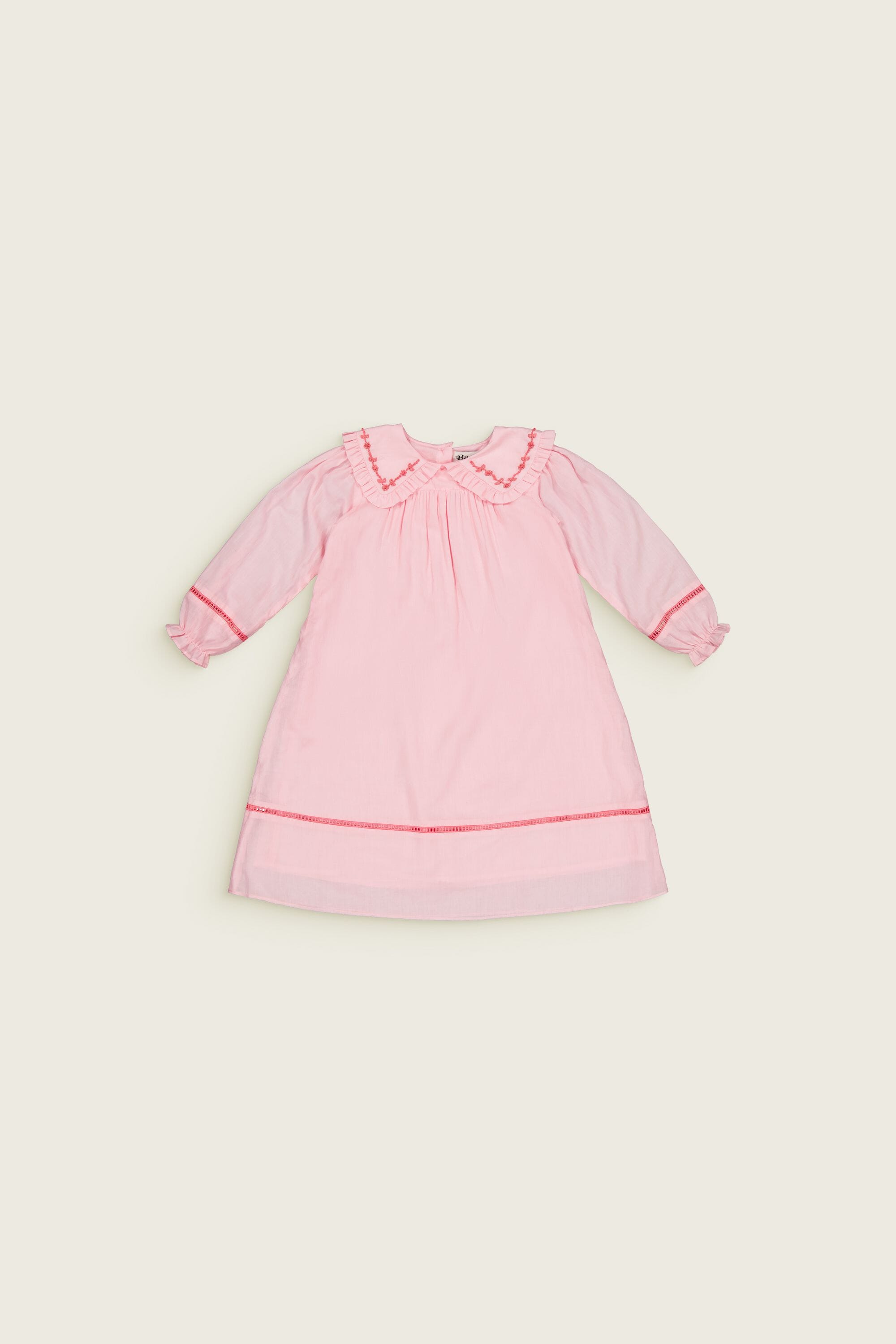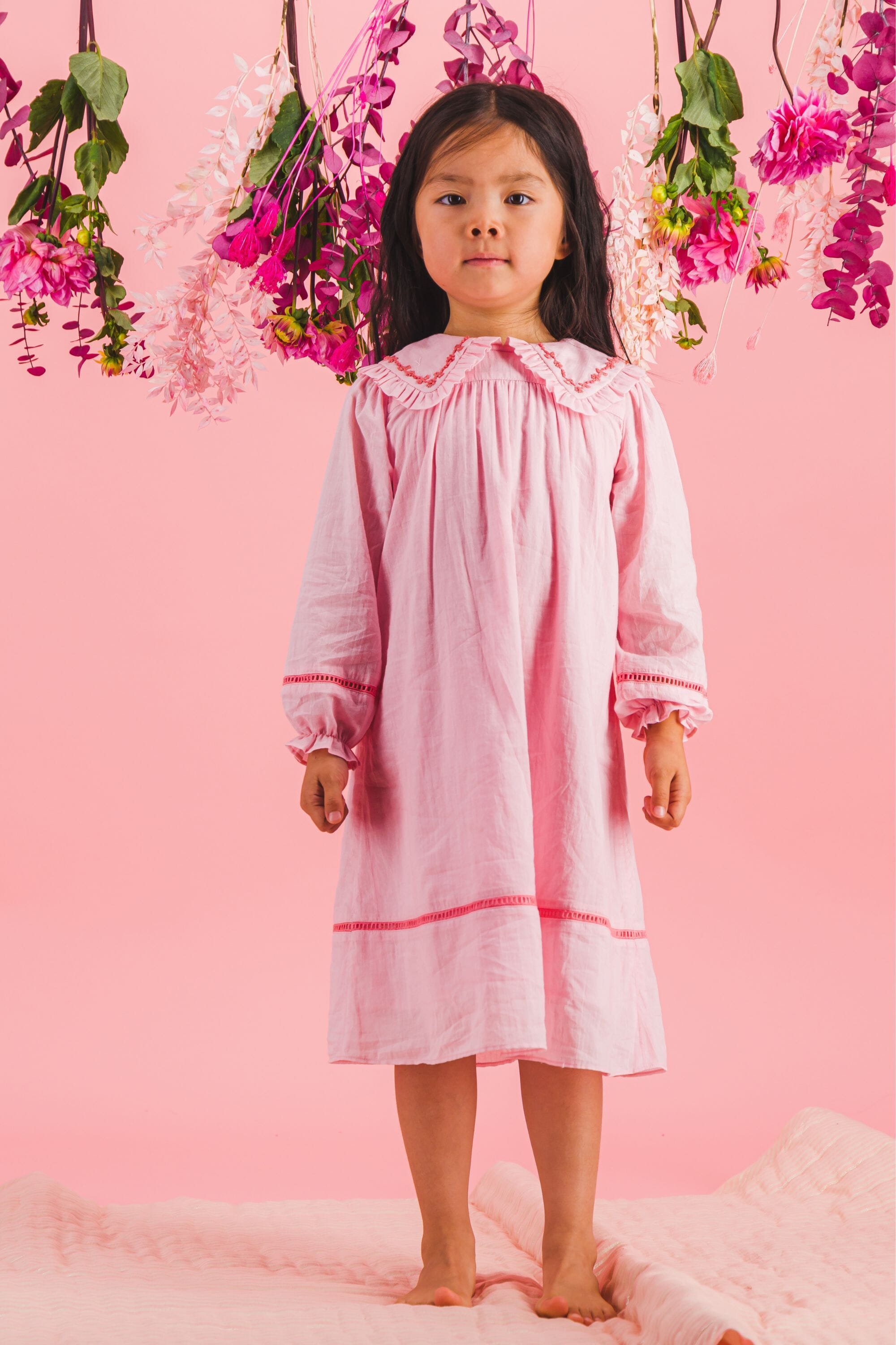 - Chemise de nuit, 100% coton bio, Doublure unie en voile de coton bio, Couleur Candy pink, Broderies main sur le col, Dentelles jour échelle en bas de manches et sur le devant, fronces sur le devant et dans le dos, Boutons contrastés.