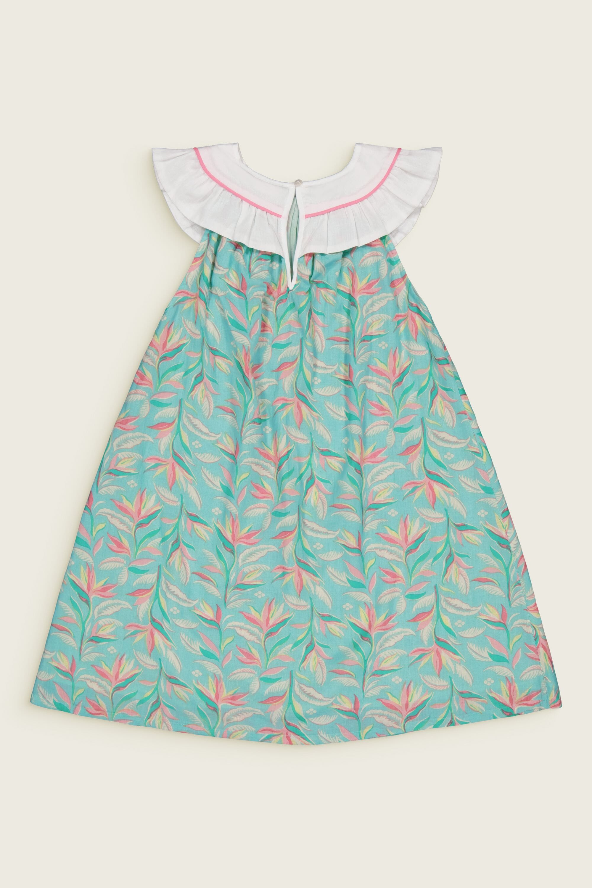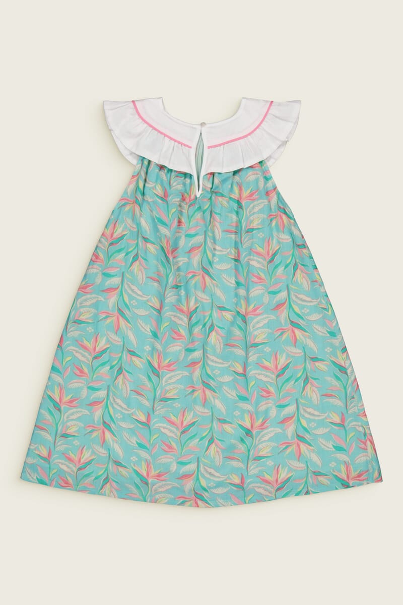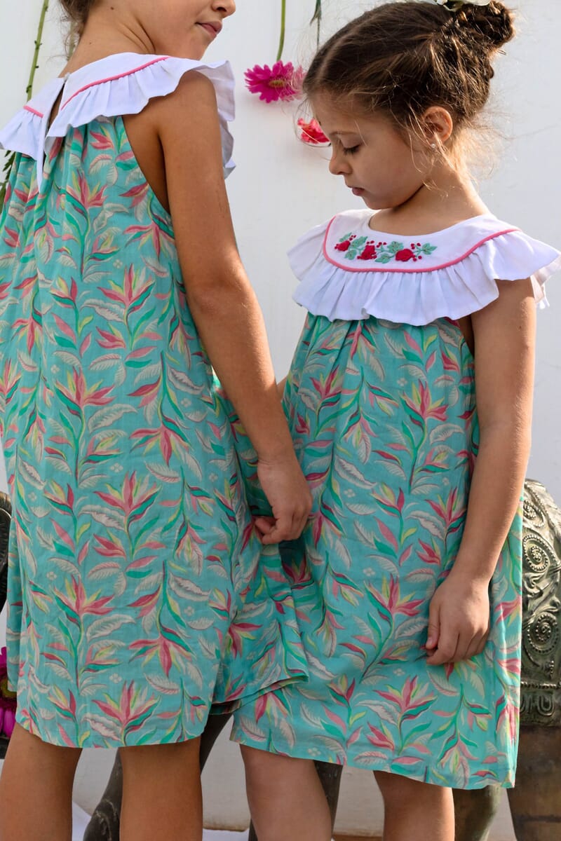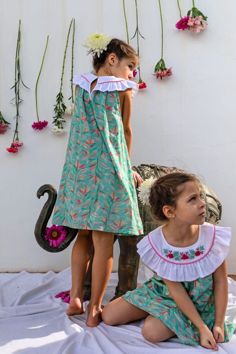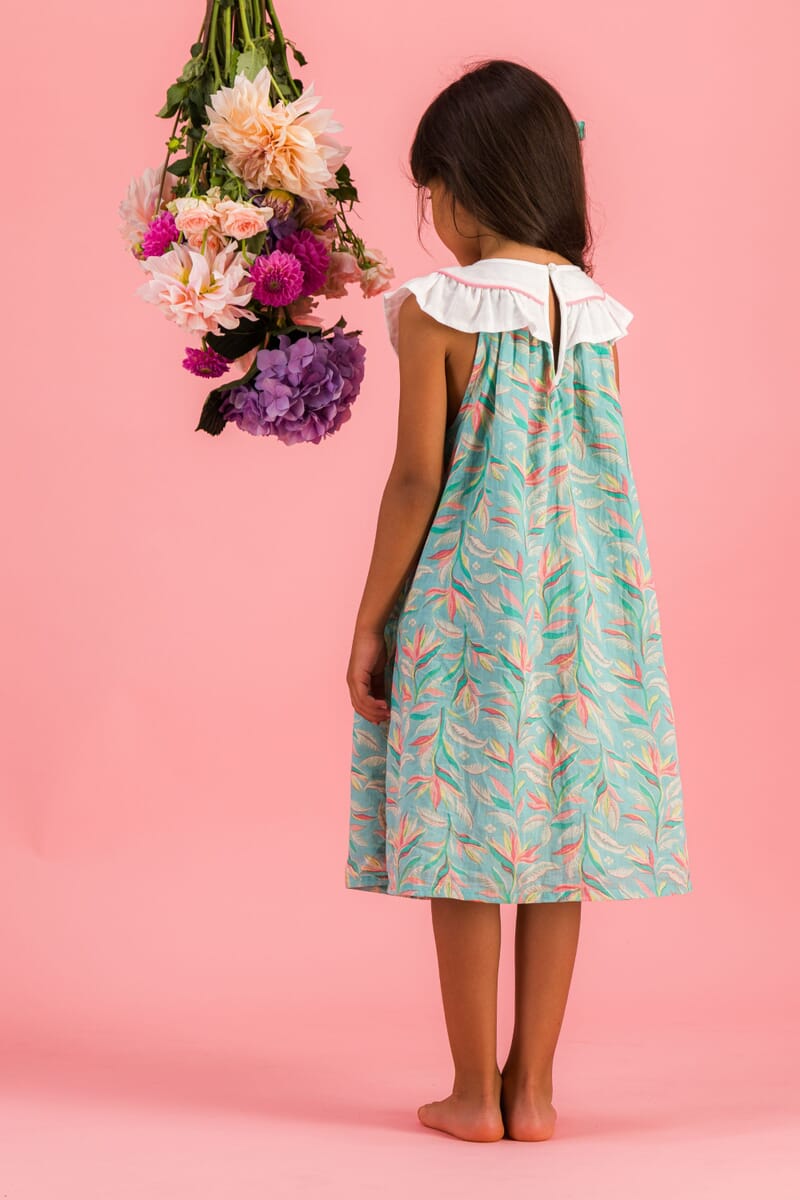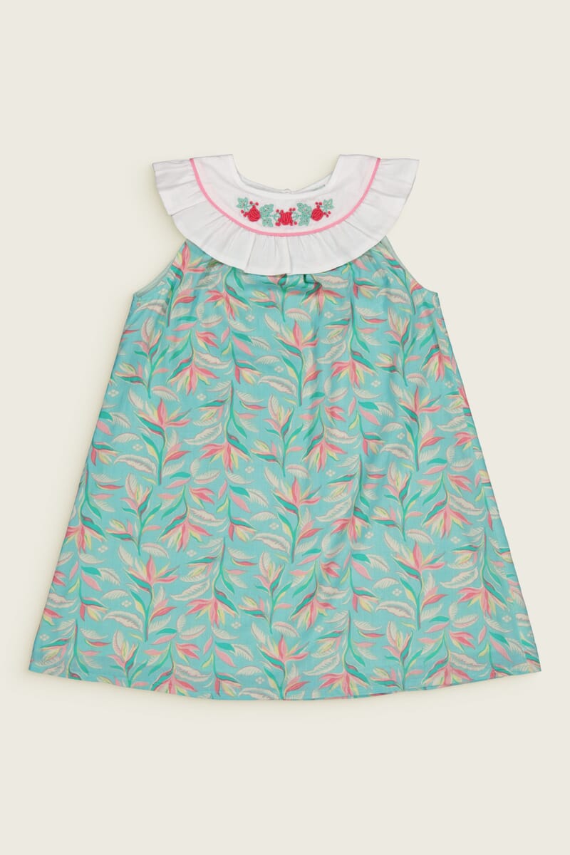 Une Robe sans manche en coton biologique avec un col rond orné de magnifiques broderies main et d’un passepoil contrasté.