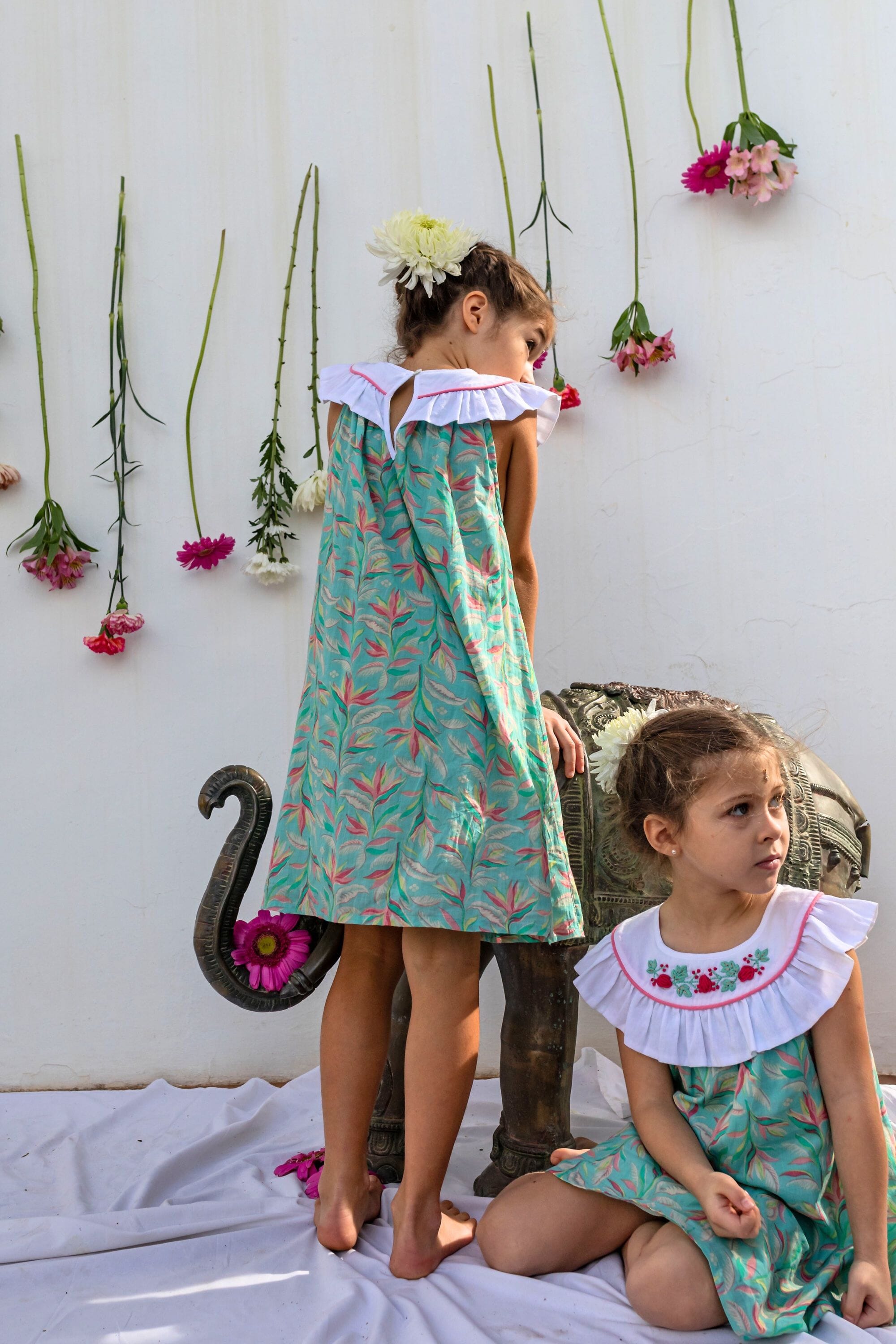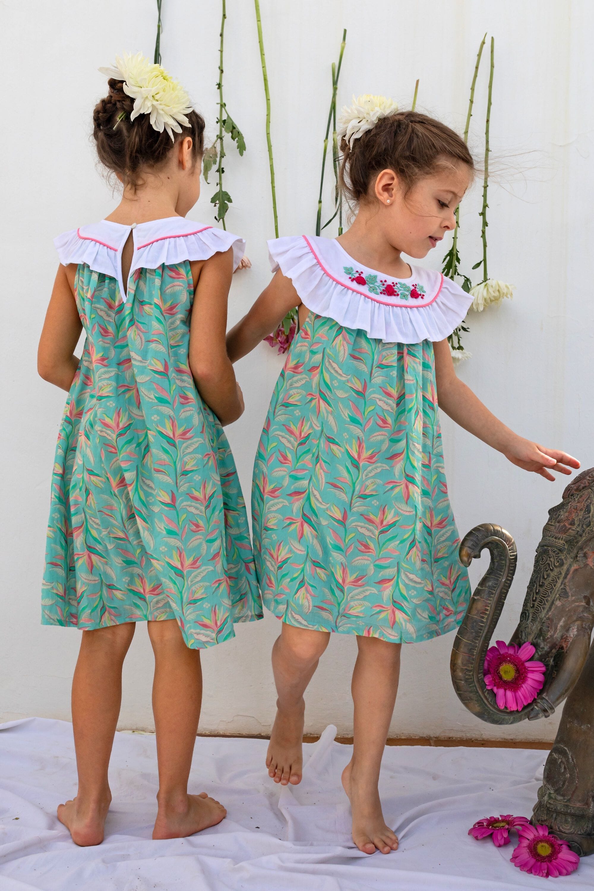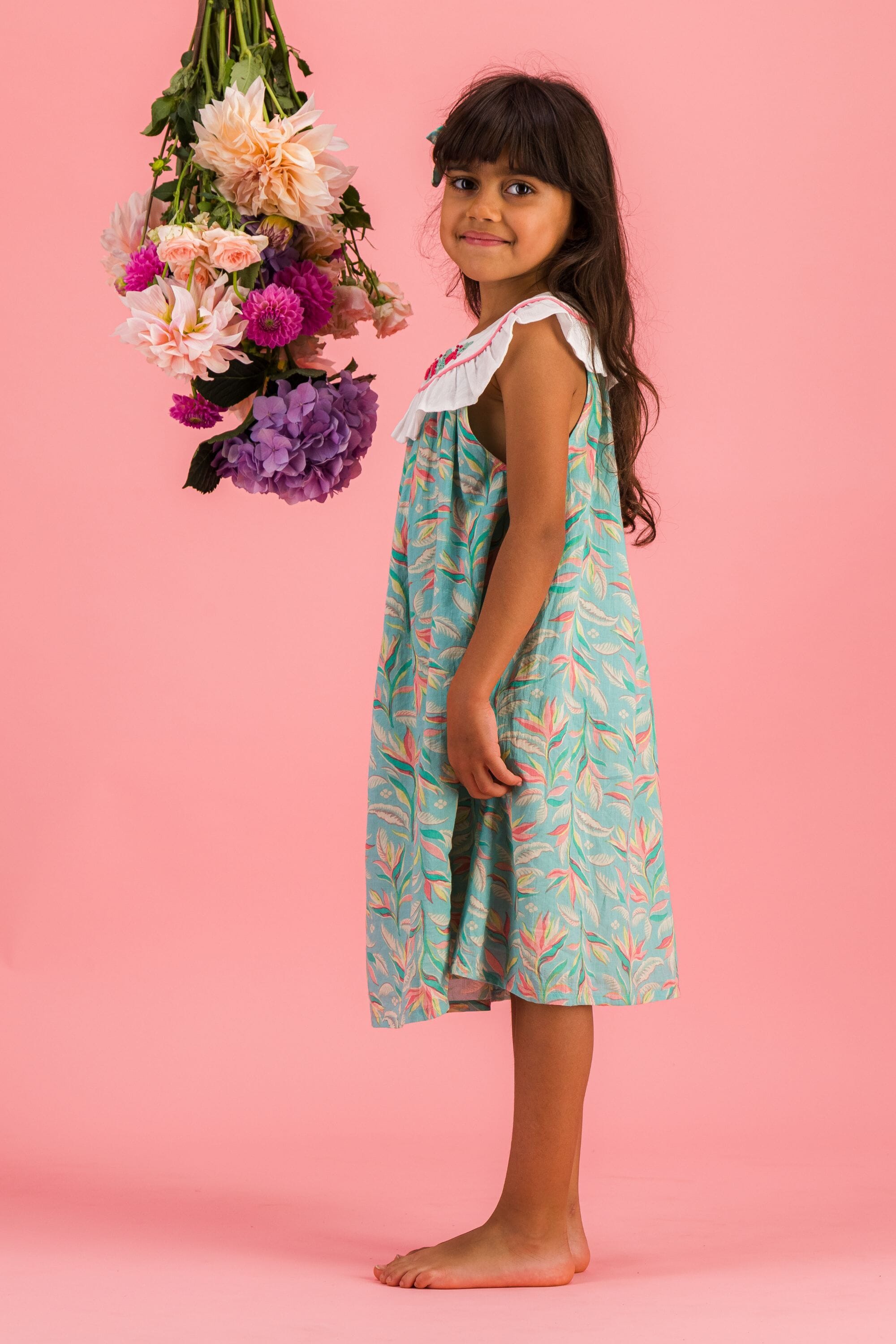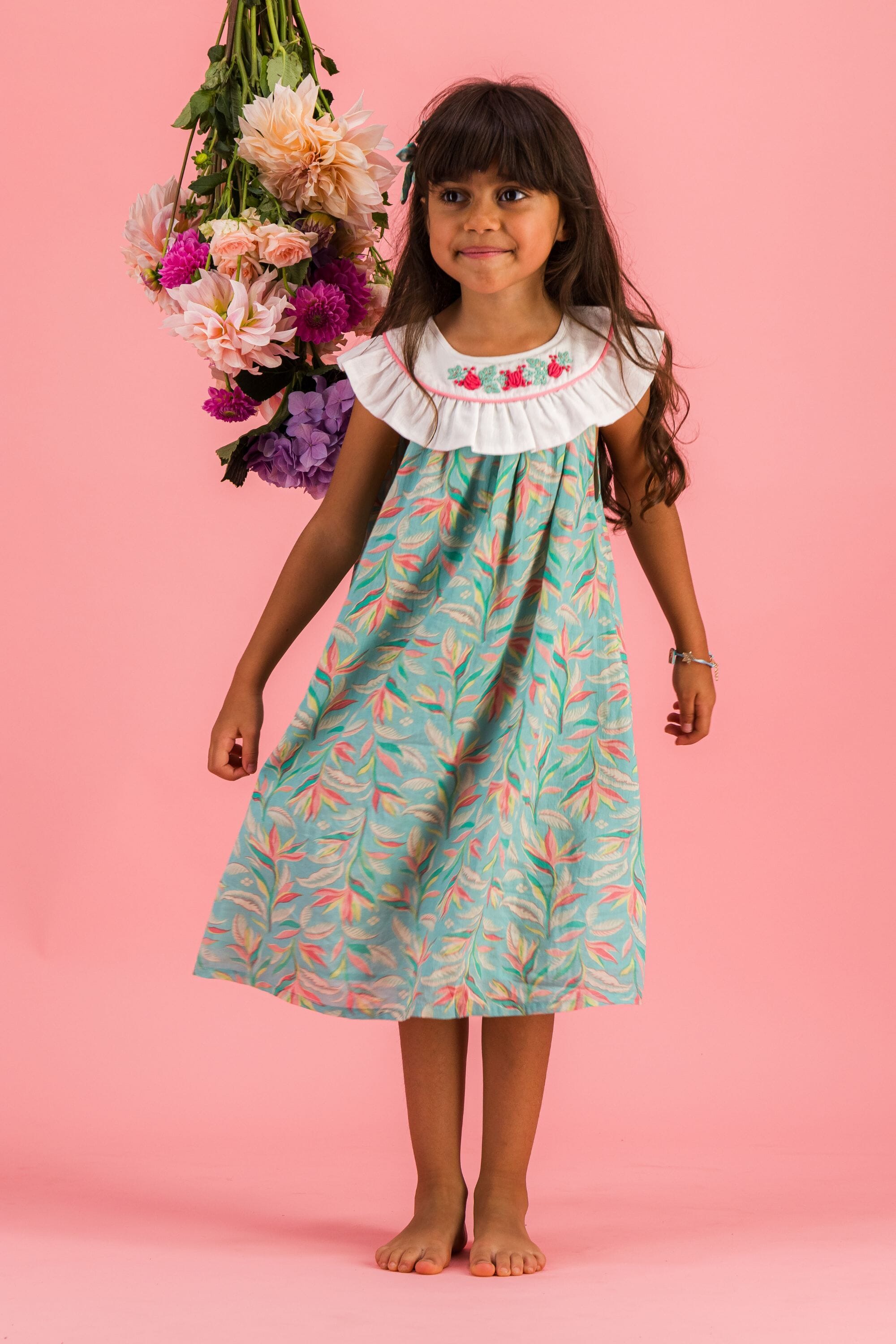 Une Robe sans manche en coton biologique avec un col rond orné de magnifiques broderies main et d’un passepoil contrasté.