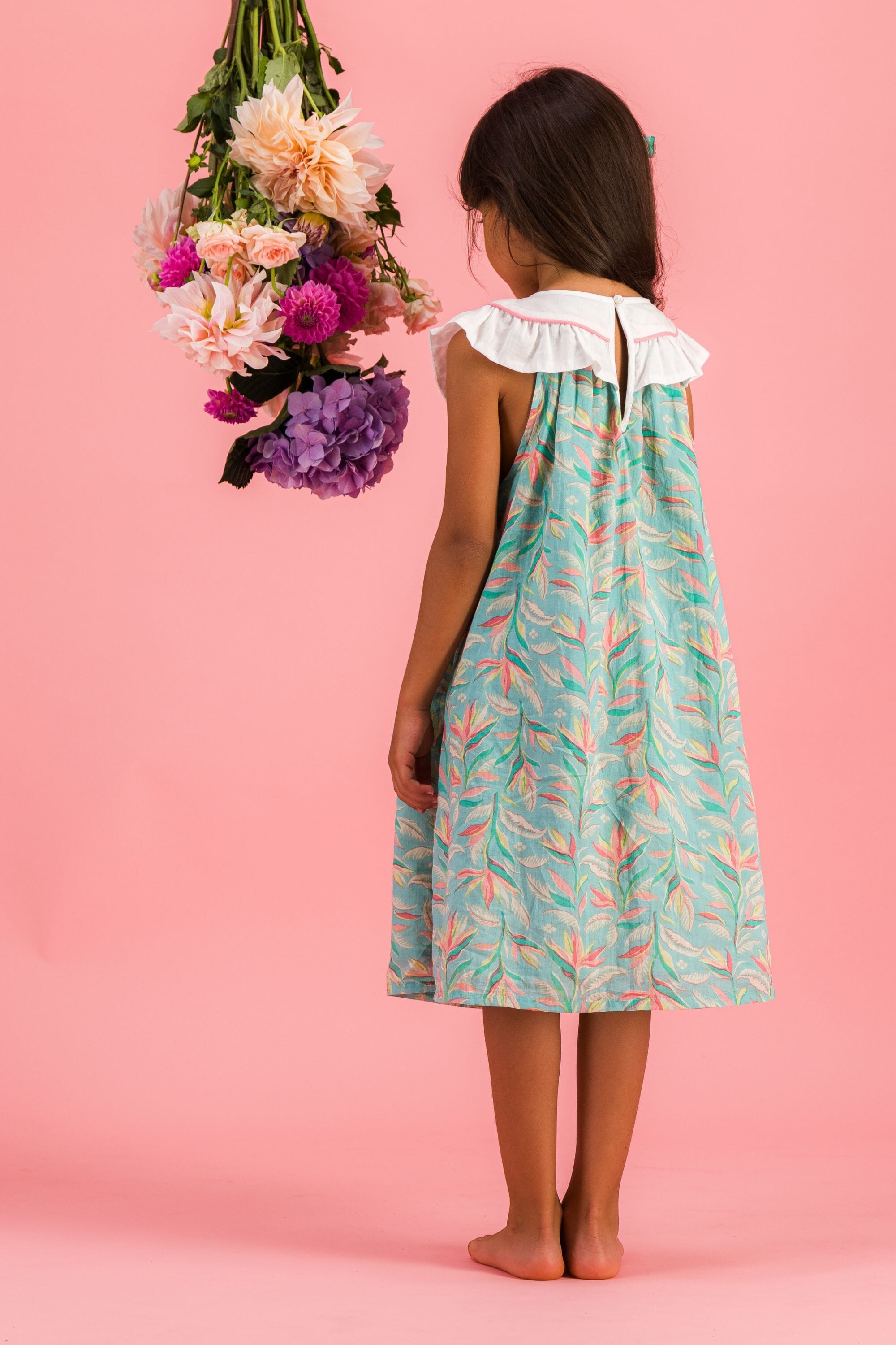 - Robe sans manche, 100% coton biologique, Doublure unie en voile de coton biologique, Block print, Broderies main et passepoil contrasté sur le col, Fronces sur le devant et dans le dos, Goute boutonnée dans le dos.
