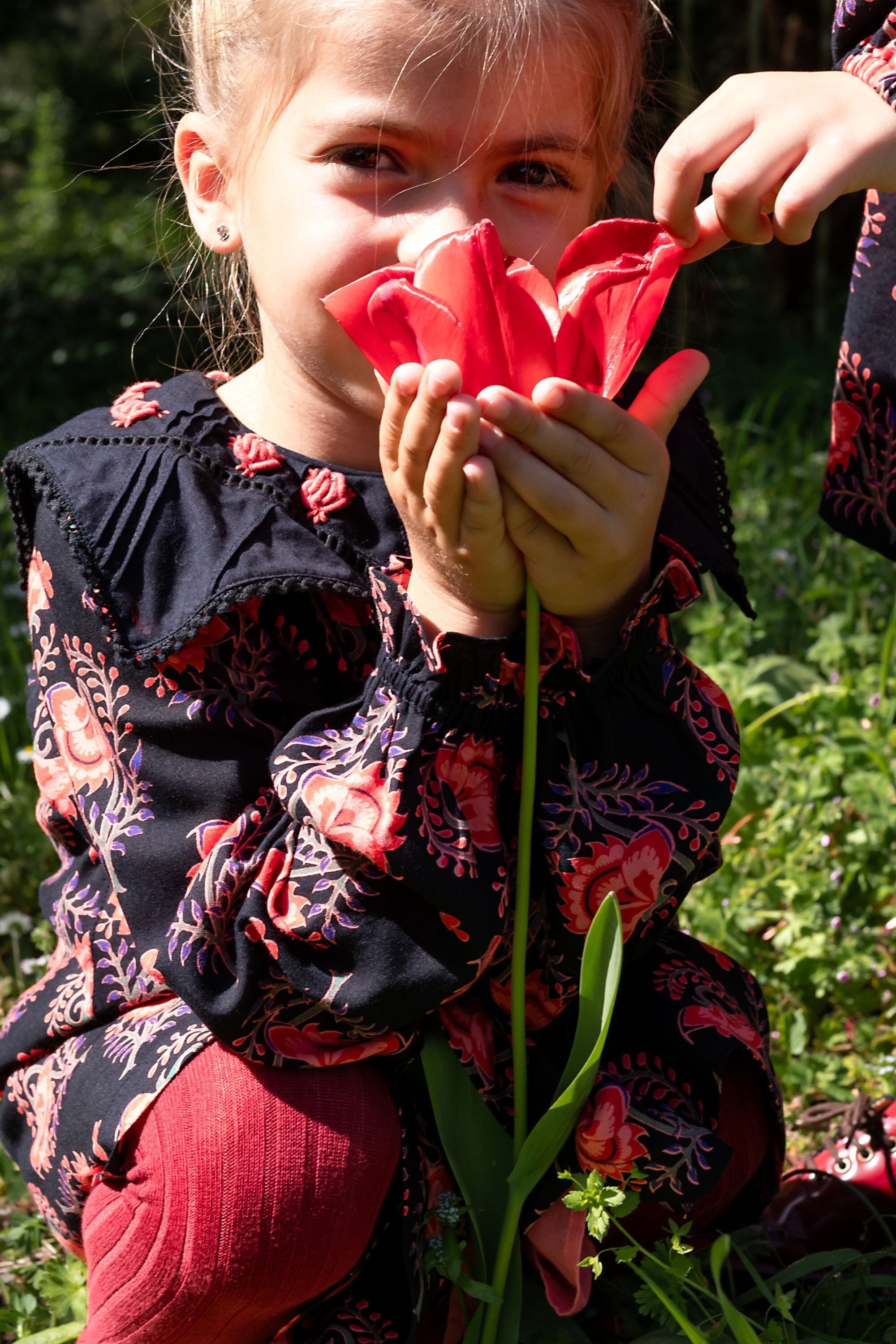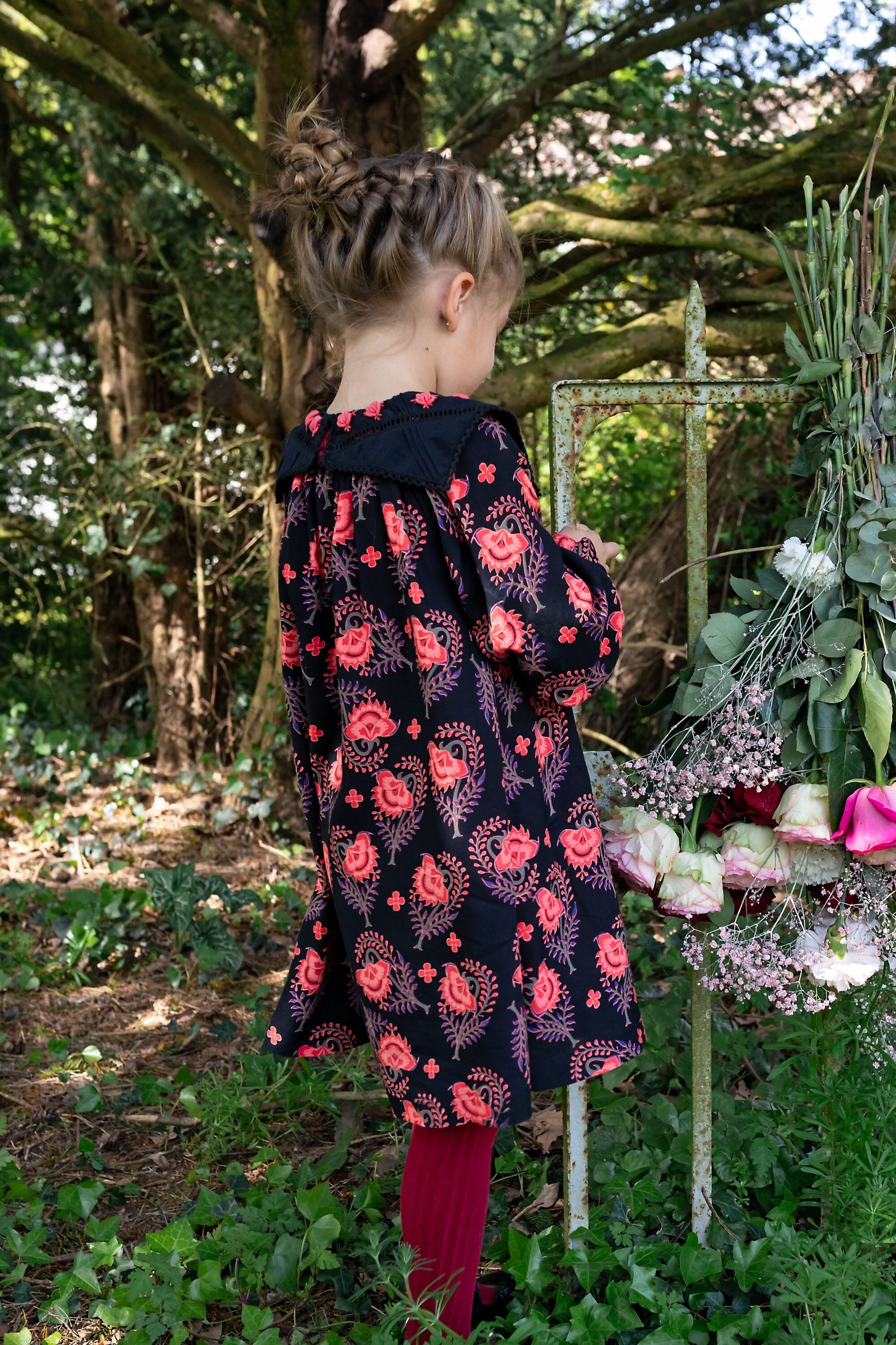 - Robe, 100% Viscose ECOVERO®, Imprimé Block Print, Doublure unie en voile de coton bio, Broderies main, dentelles et plis nervures sur le col, Manches longues élastiquées, Fronces sur le devant et dans le dos, Goute boutonnée dans le dos.