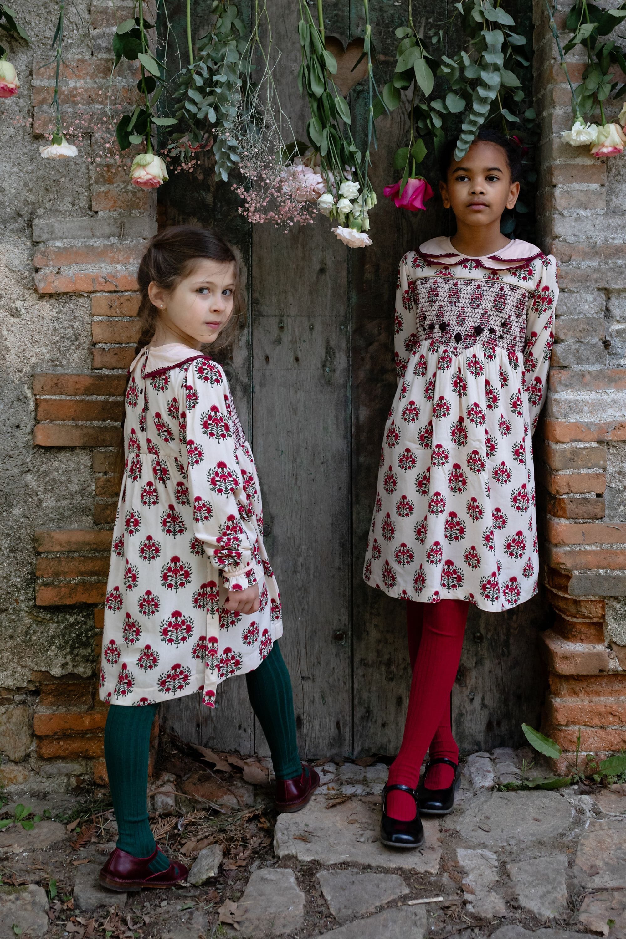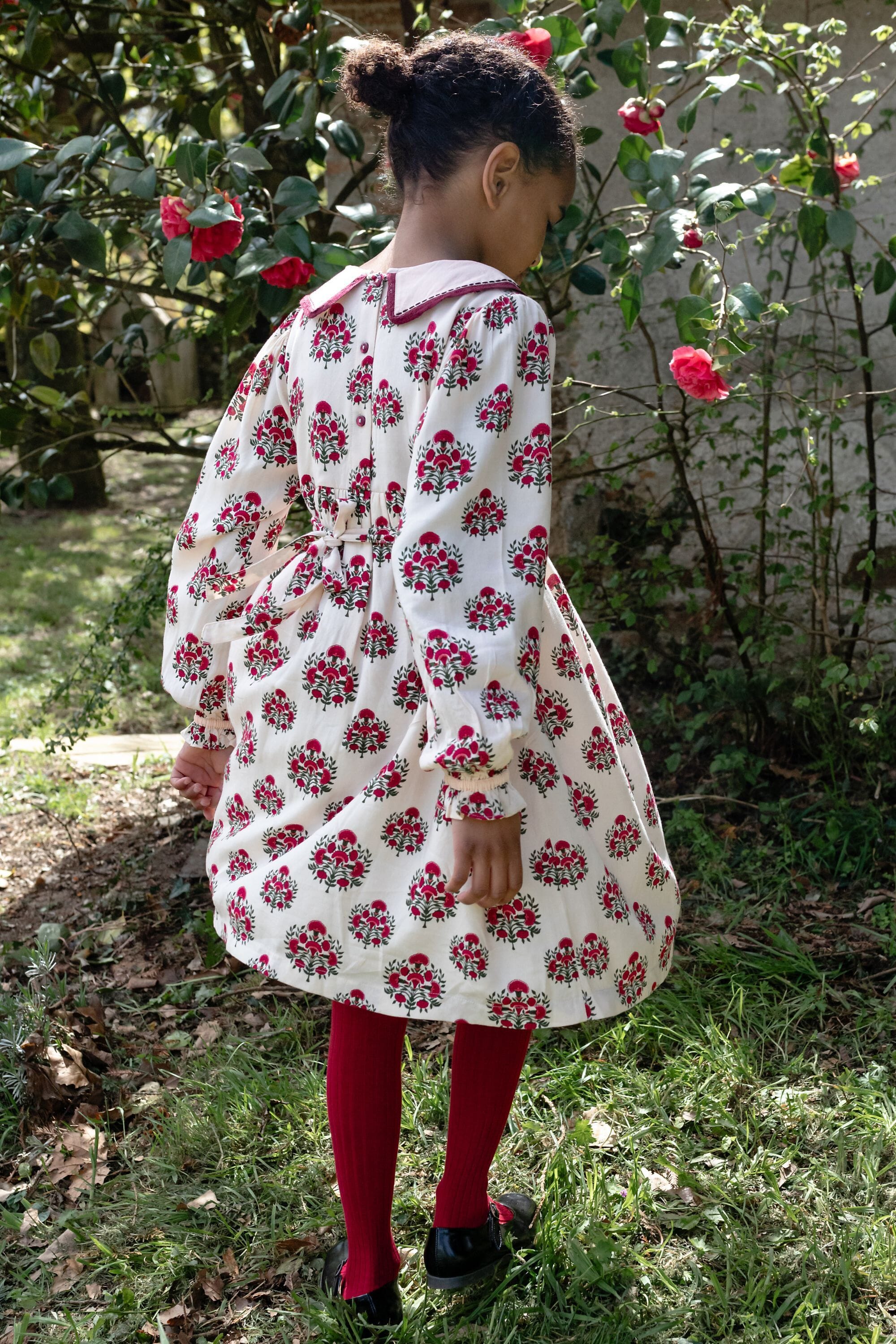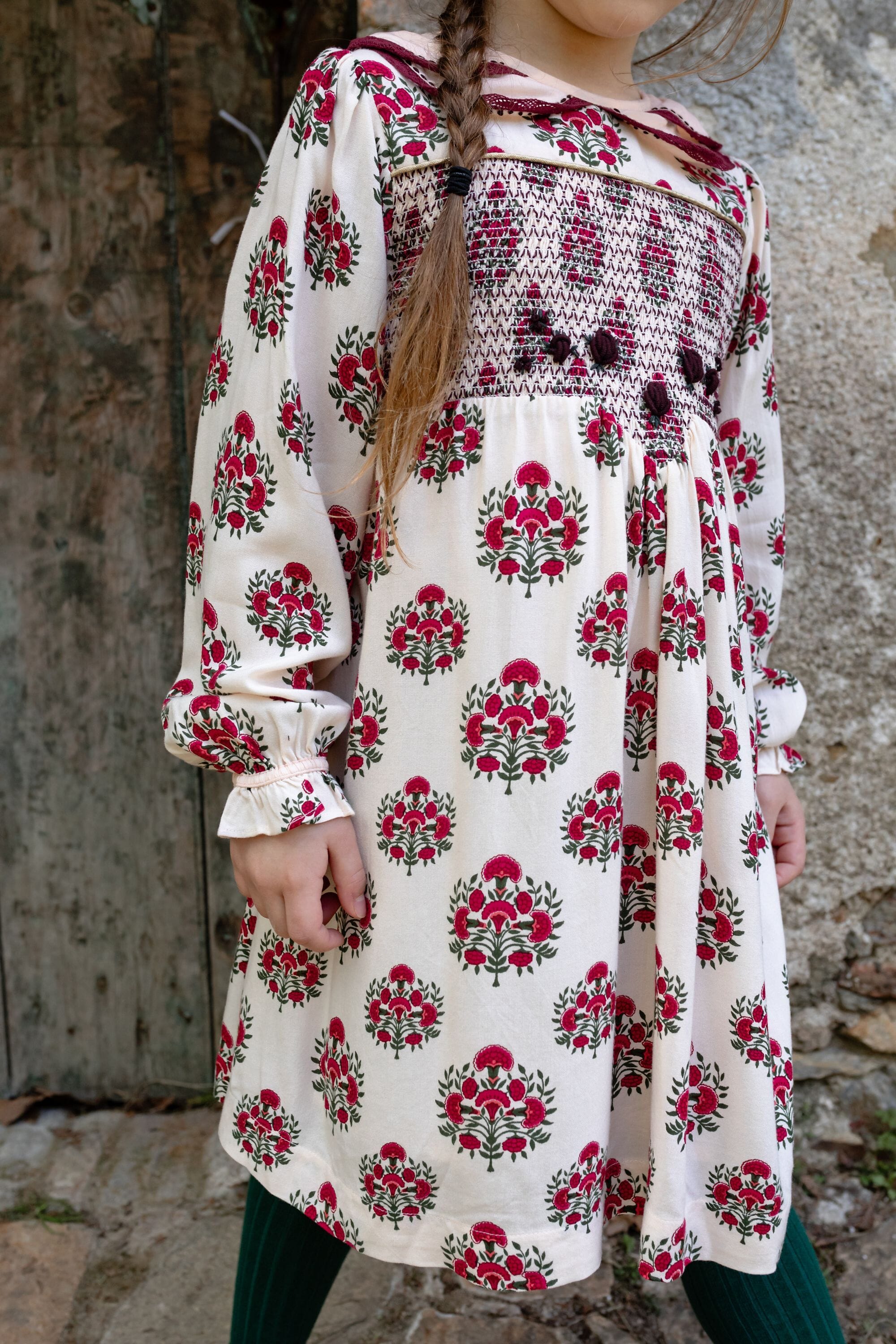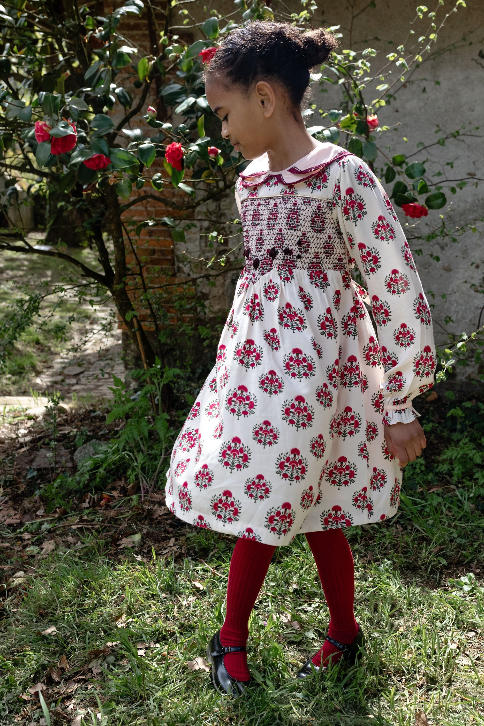 - Robe, 100% Viscose ECOVERO®, Block print, Doublure unie en voile de coton bio, Double col Claudine surpiqué main finition dentelle, Smocks, Passepoil doré et fleurs brodées main sur le devant, Boutons dorés et ceinture dans le dos.