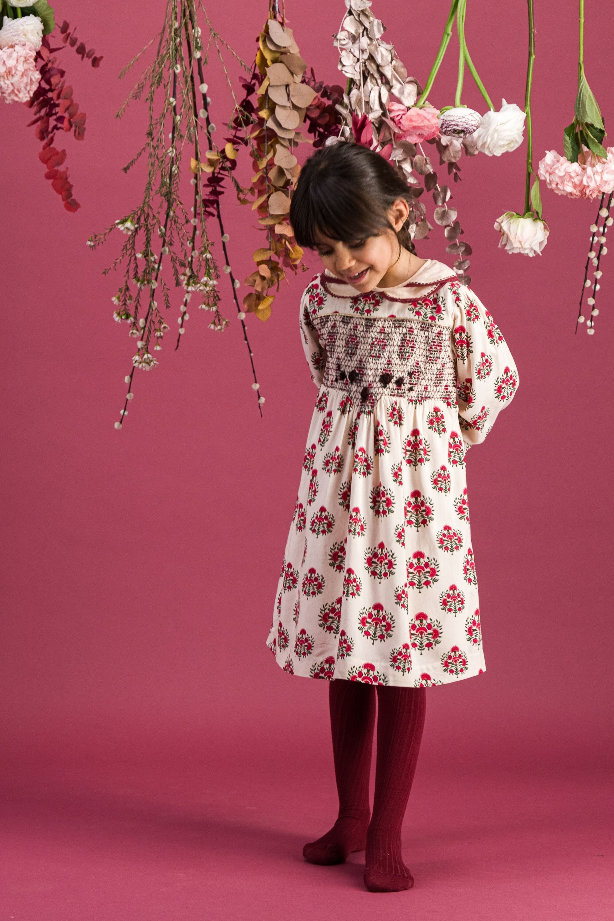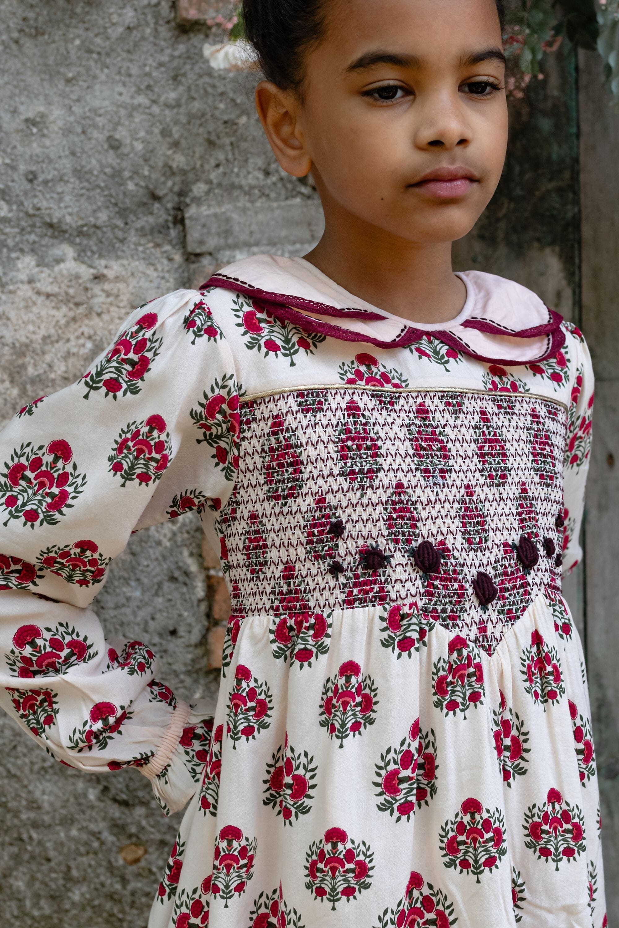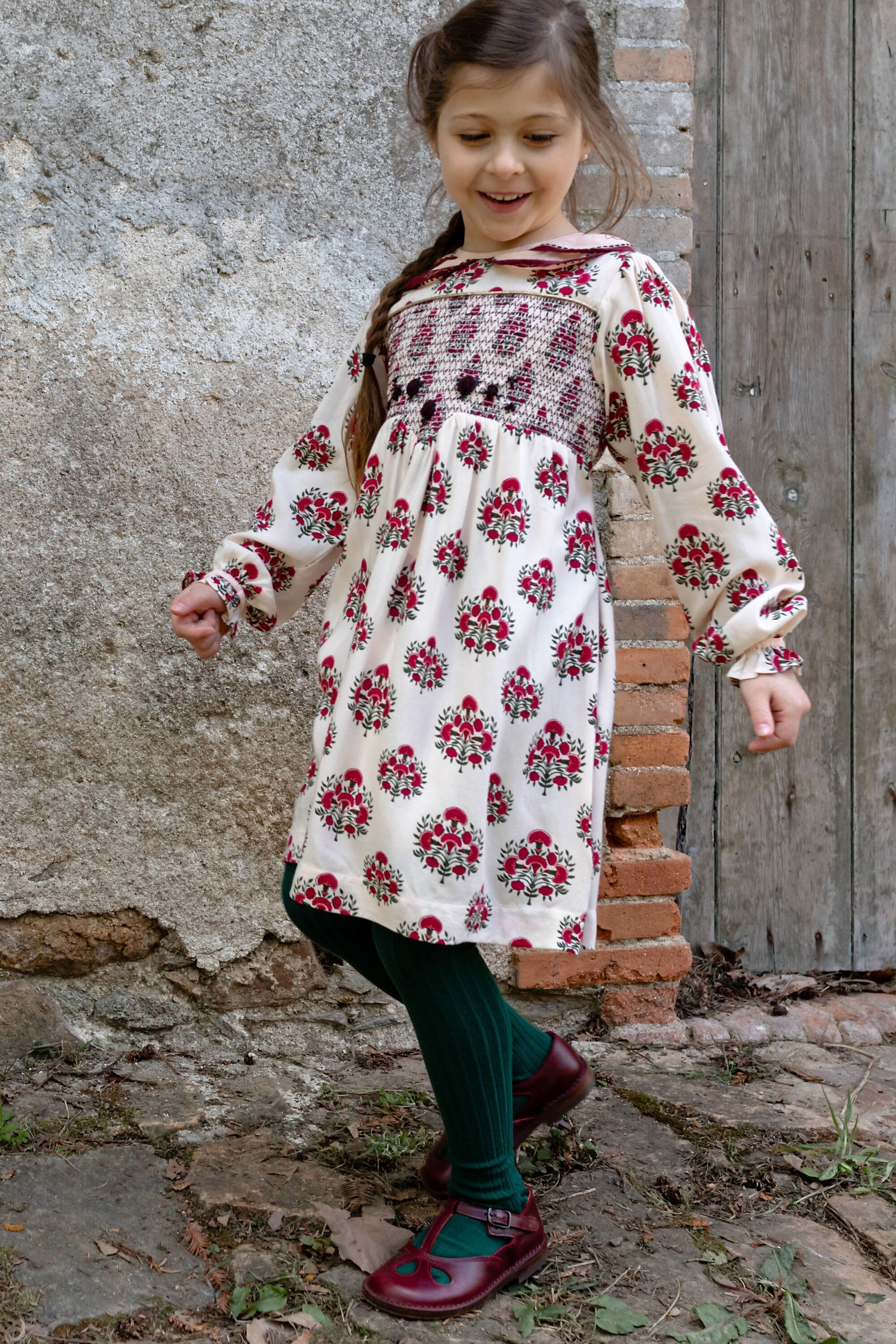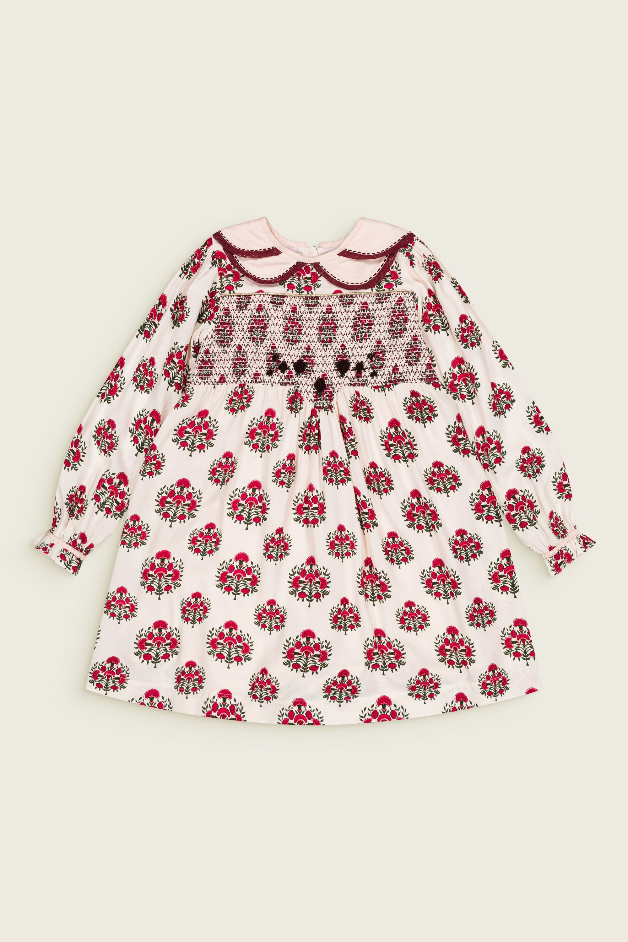 - Robe, 100% Viscose ECOVERO®, Block print, Doublure unie en voile de coton bio, Double col Claudine surpiqué main finition dentelle, Smocks, Passepoil doré et fleurs brodées main sur le devant, Boutons dorés et ceinture dans le dos.