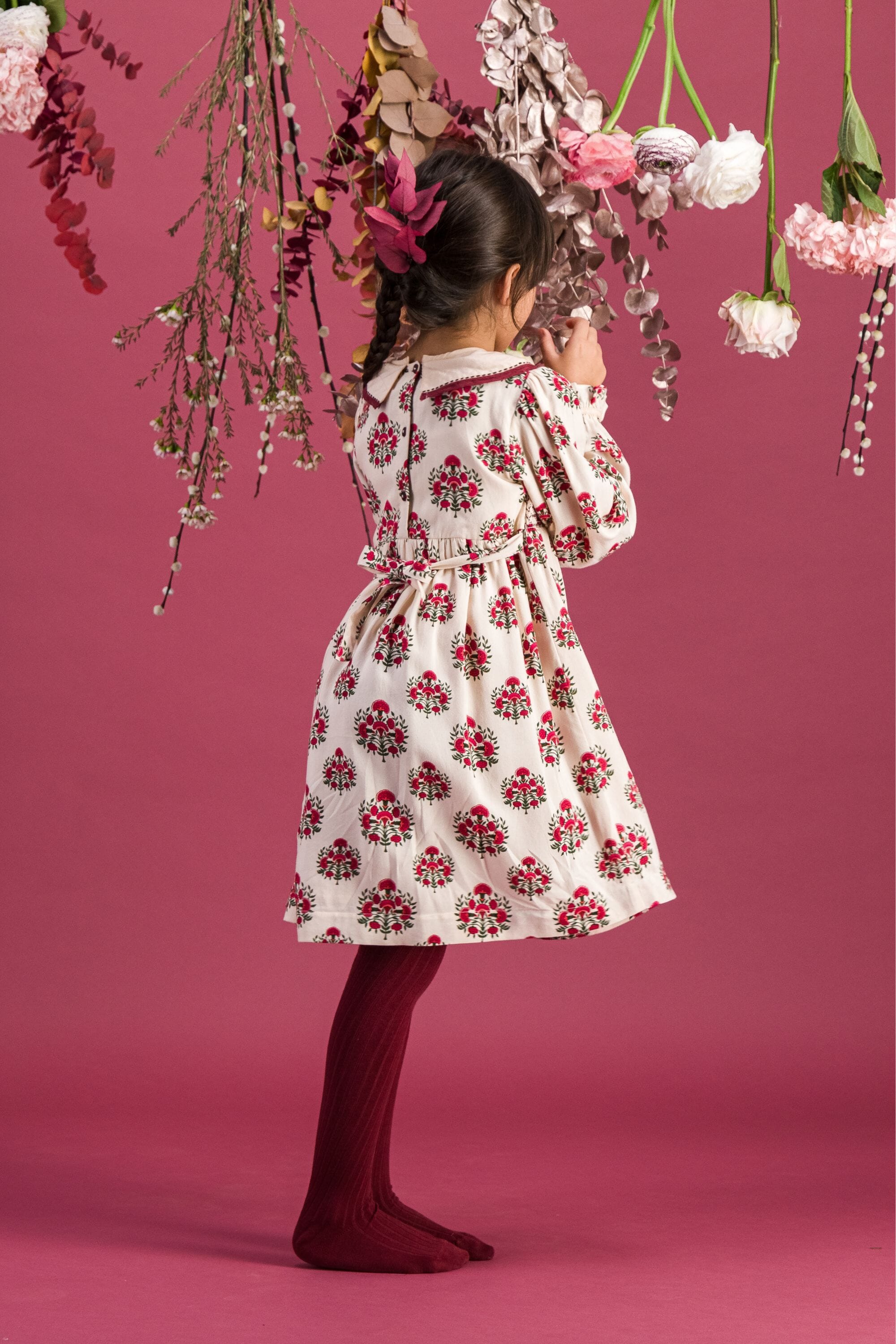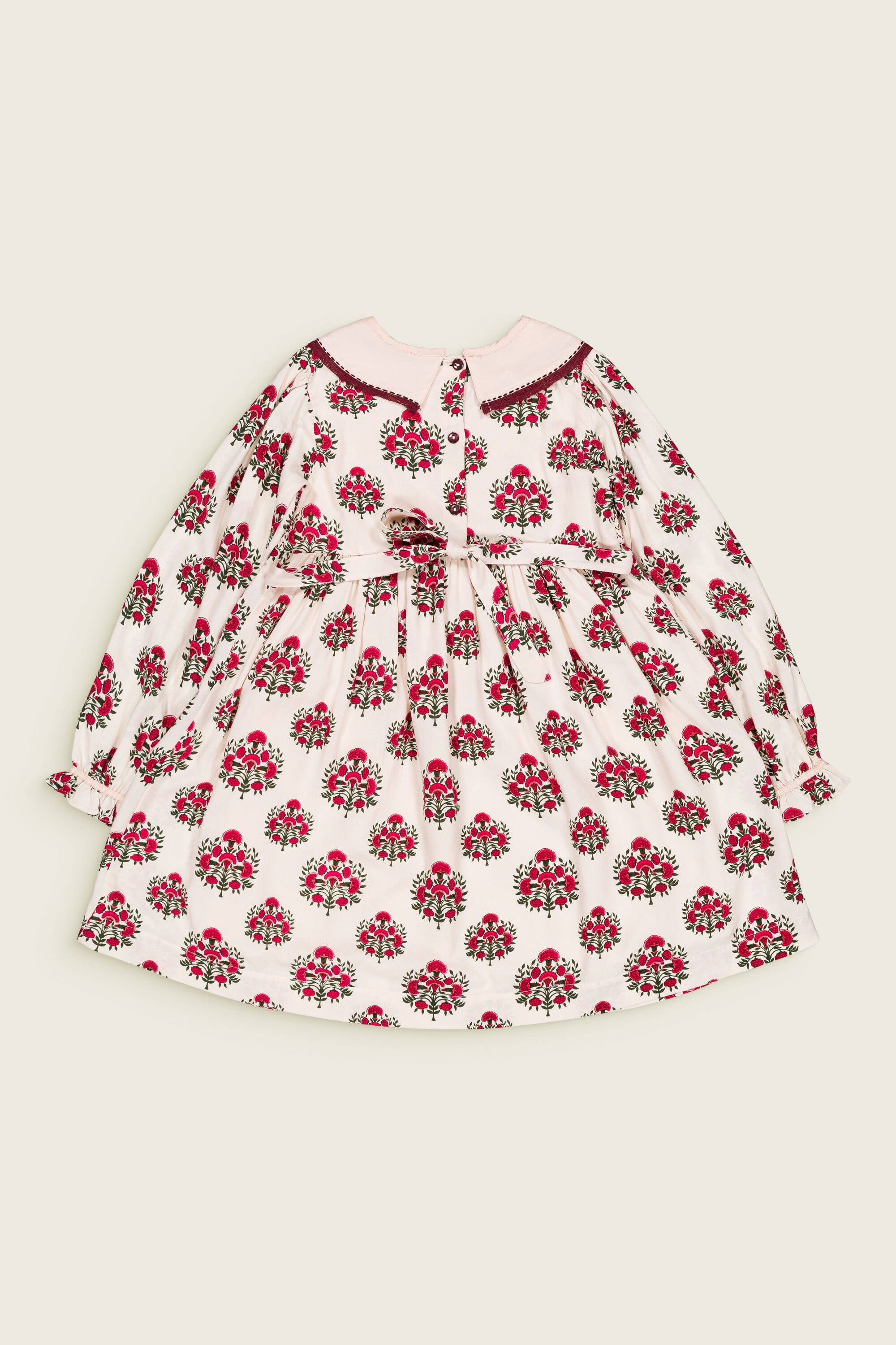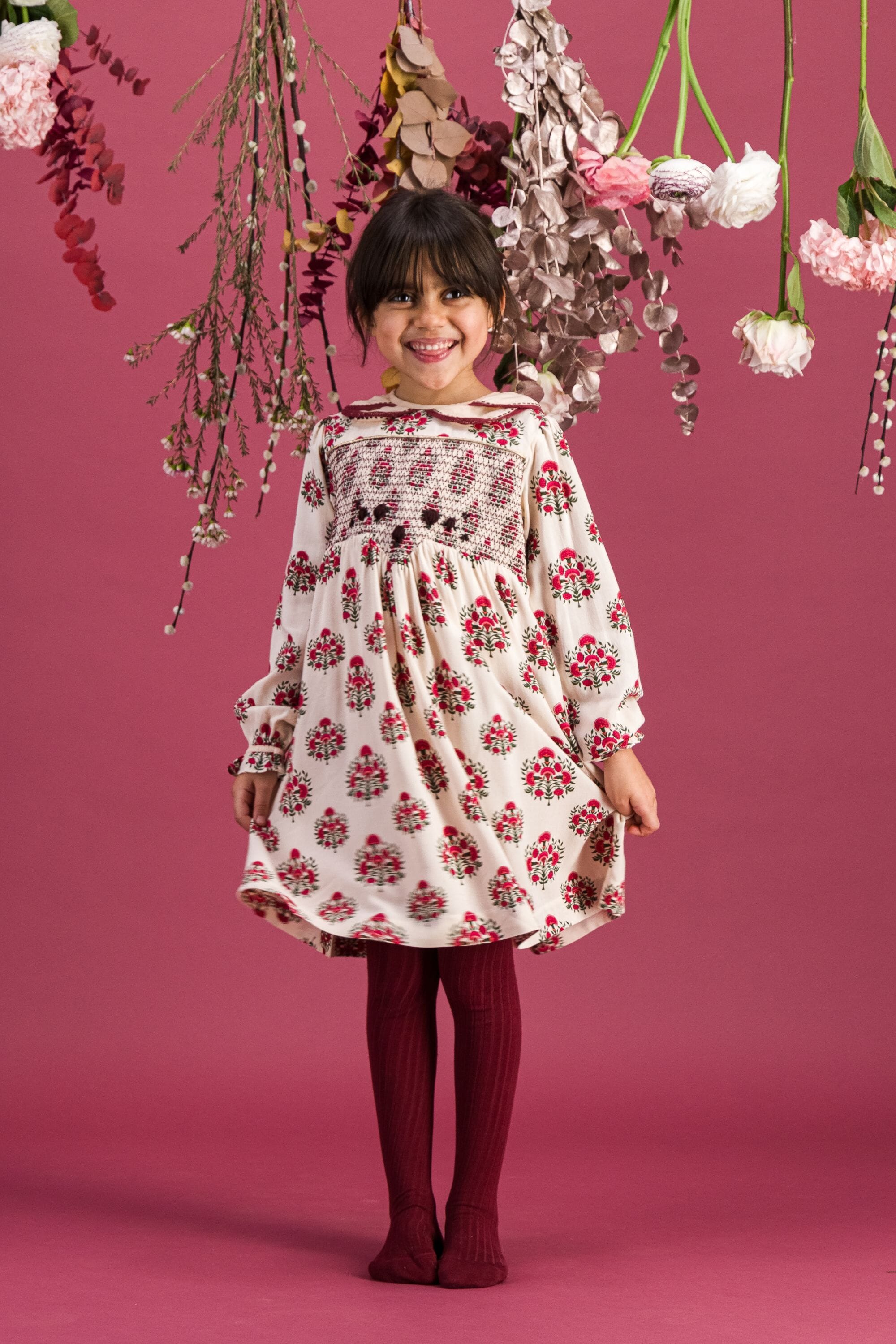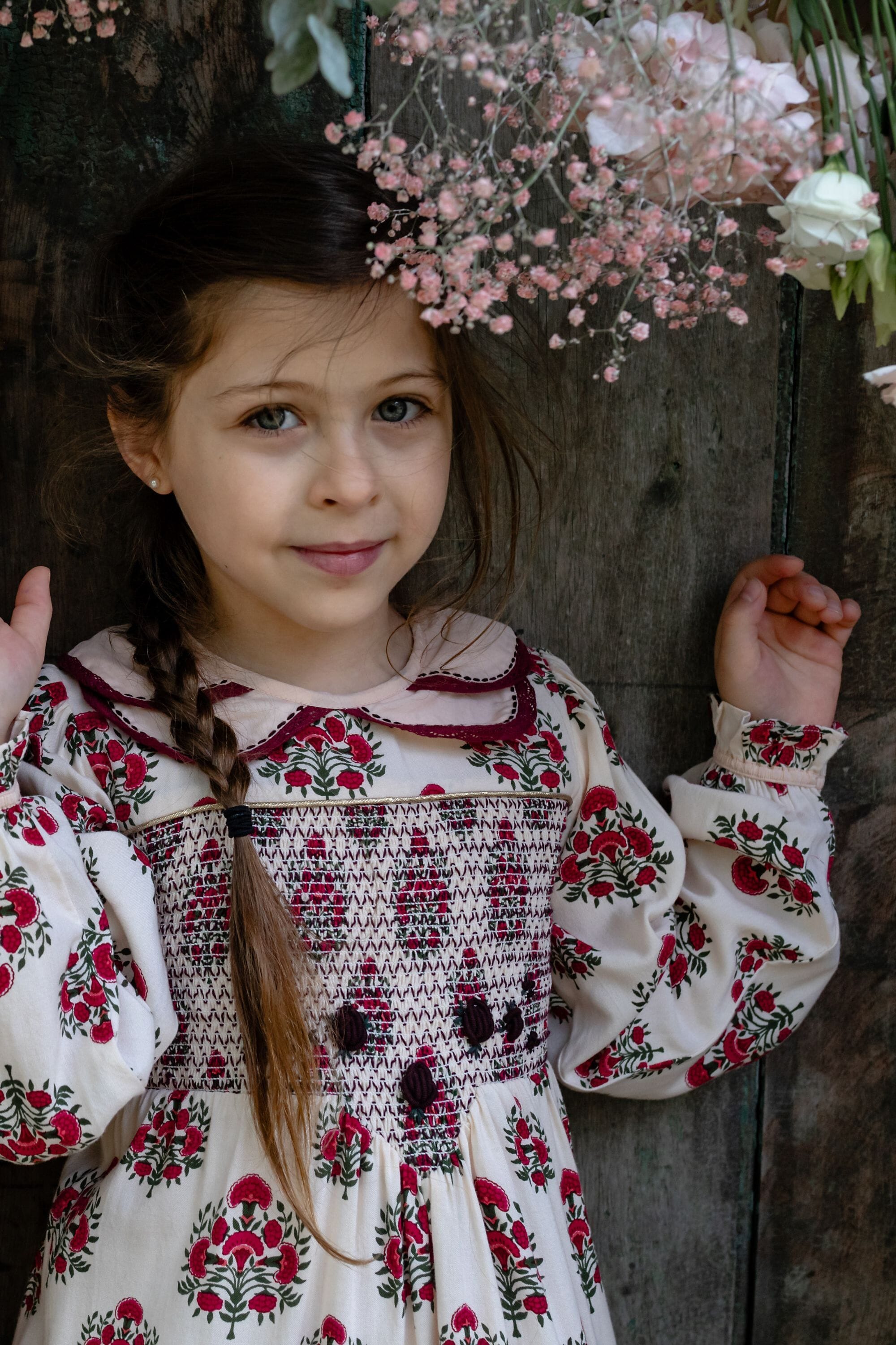- Robe, 100% Viscose ECOVERO®, Block print, Doublure unie en voile de coton bio, Double col Claudine surpiqué main finition dentelle, Smocks, Passepoil doré et fleurs brodées main sur le devant, Boutons dorés et ceinture dans le dos.