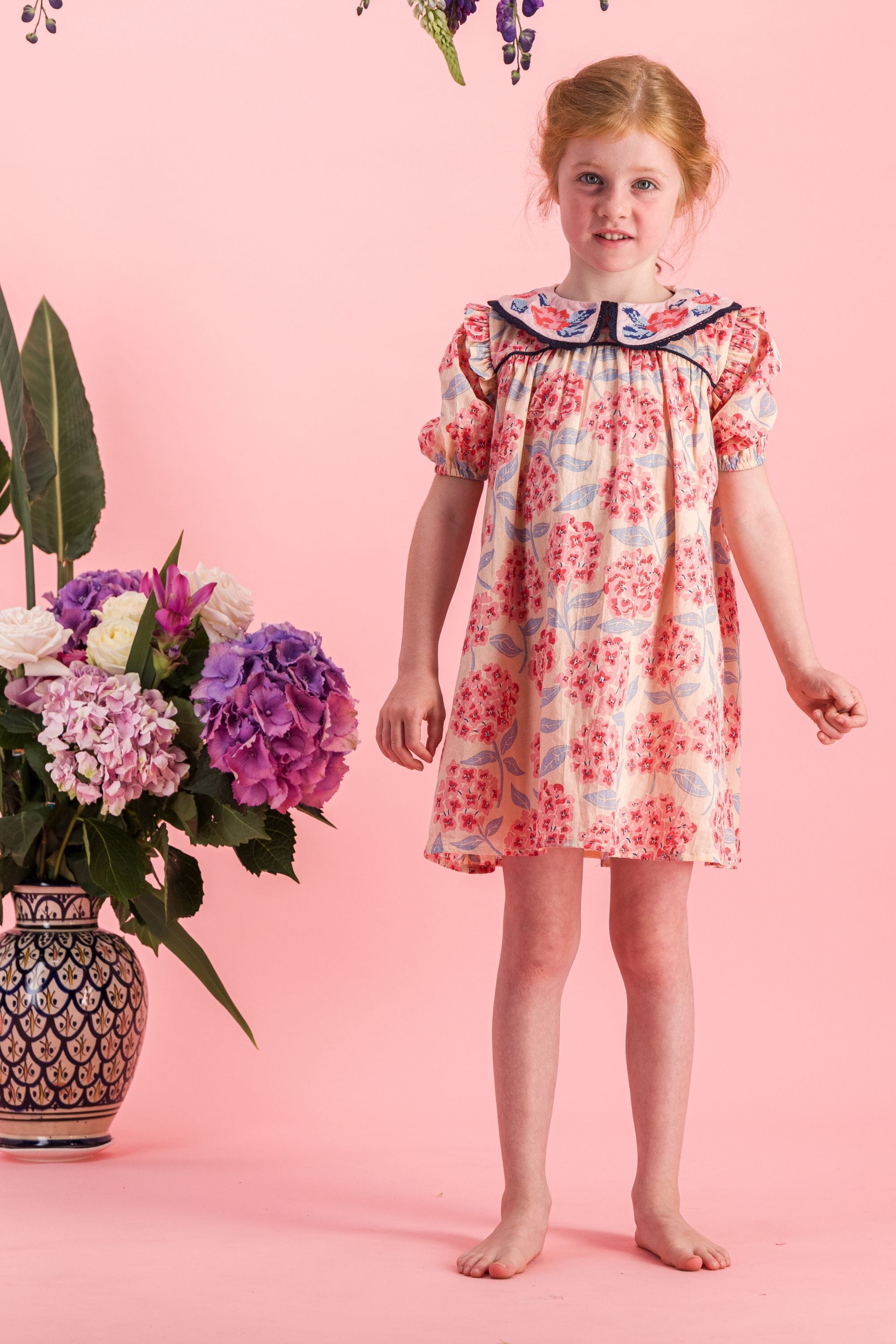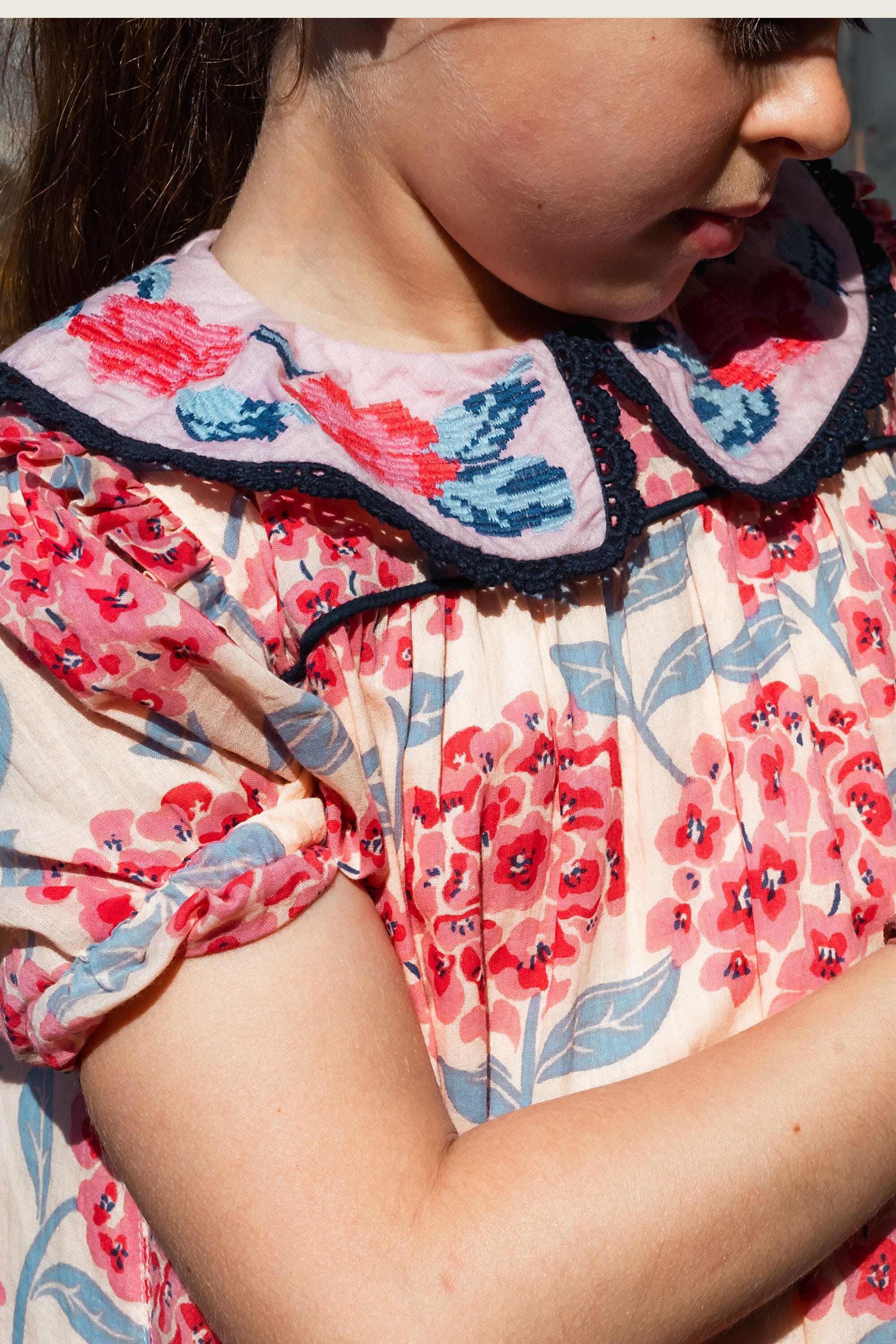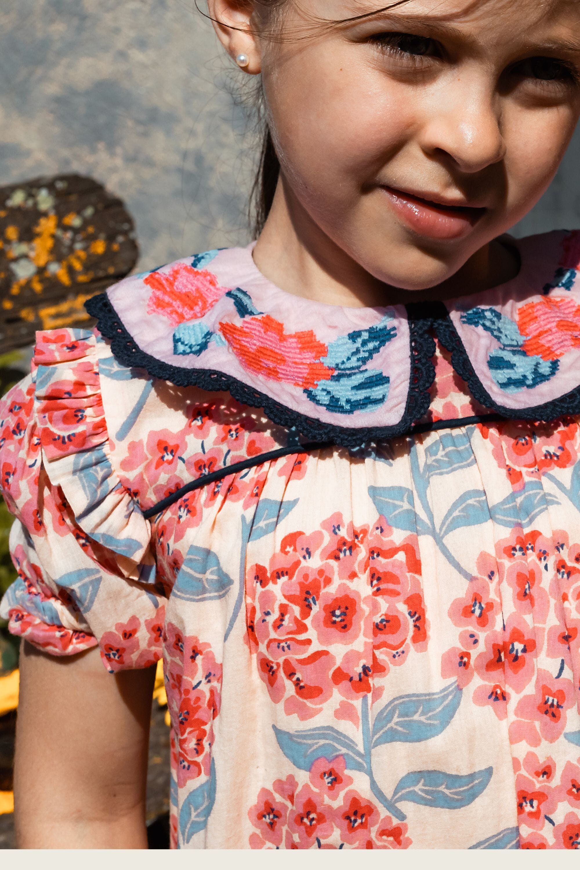 - Robe, 100% coton bio, Imprimé Block Print, Doublure unie en voile de coton bio, Broderies et dentelles sur le col, Passepoil contrasté sur le devant, Fronces sur le devant et dans le dos, Boutons contrastés.
