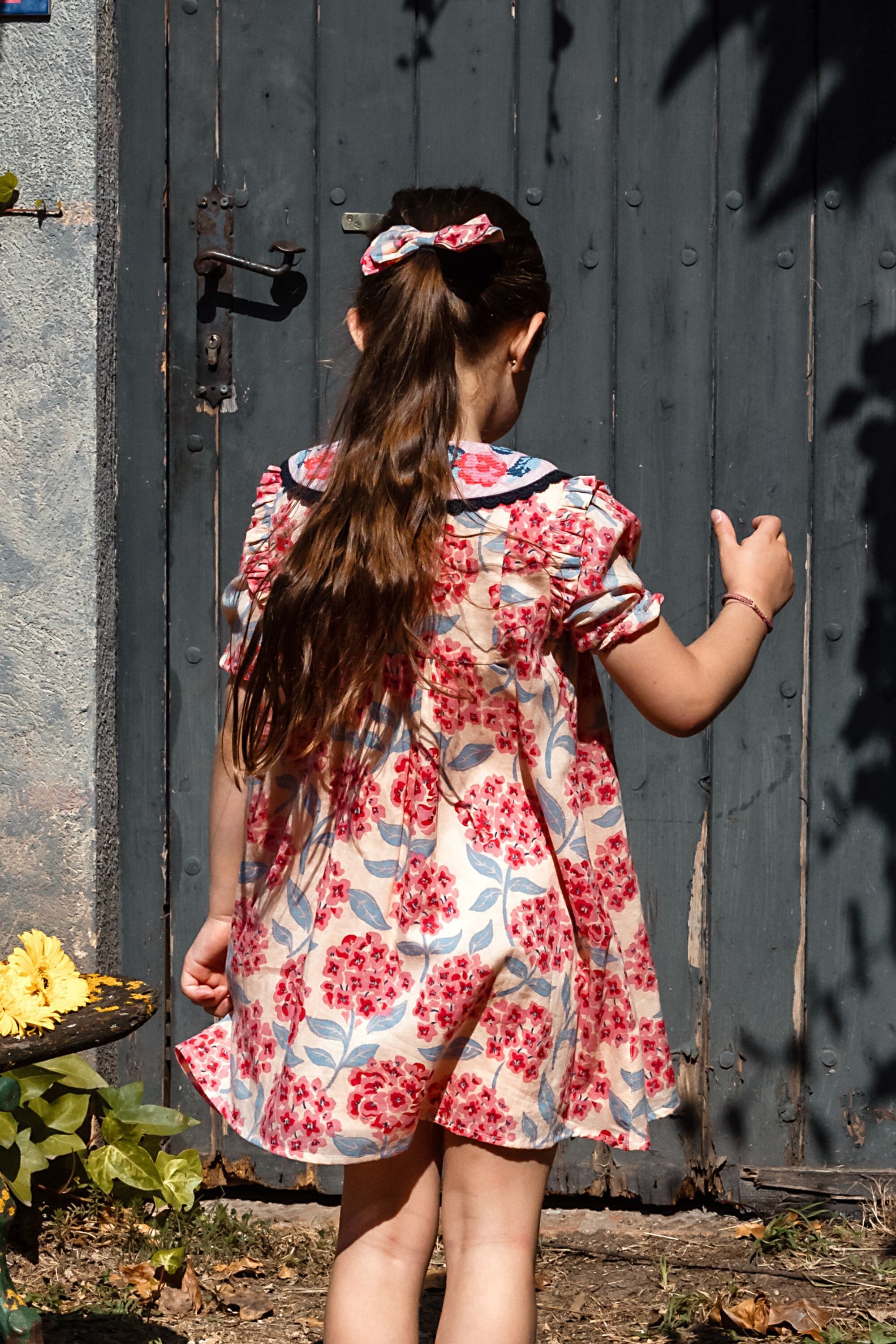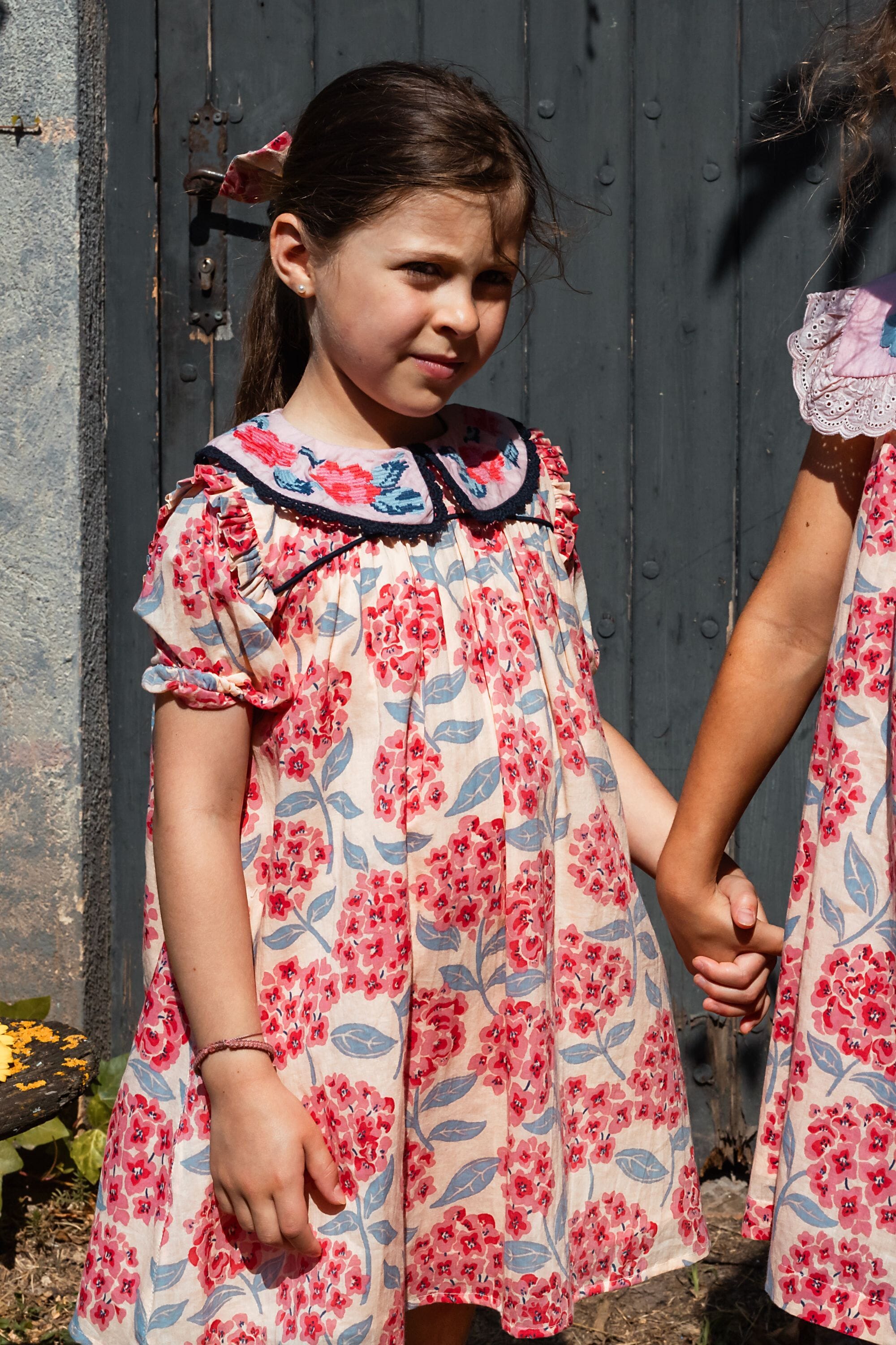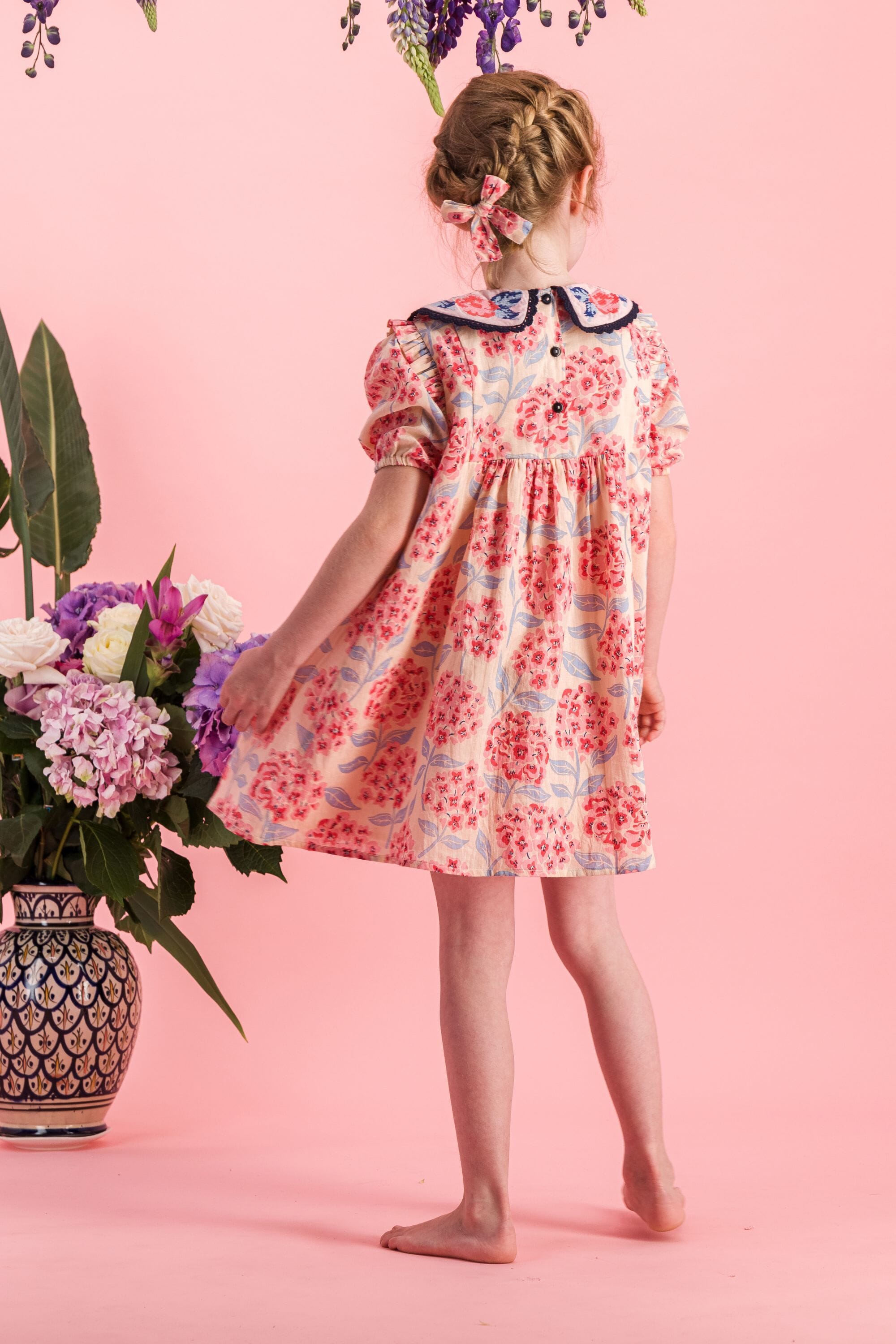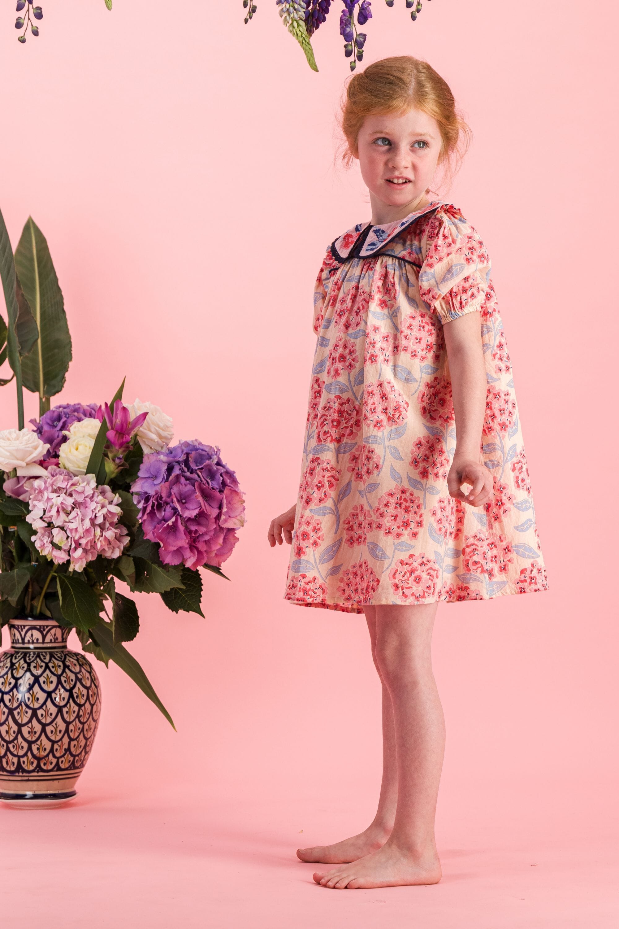 - Robe, 100% coton bio, Imprimé Block Print, Doublure unie en voile de coton bio, Broderies et dentelles sur le col, Passepoil contrasté sur le devant, Fronces sur le devant et dans le dos, Boutons contrastés.