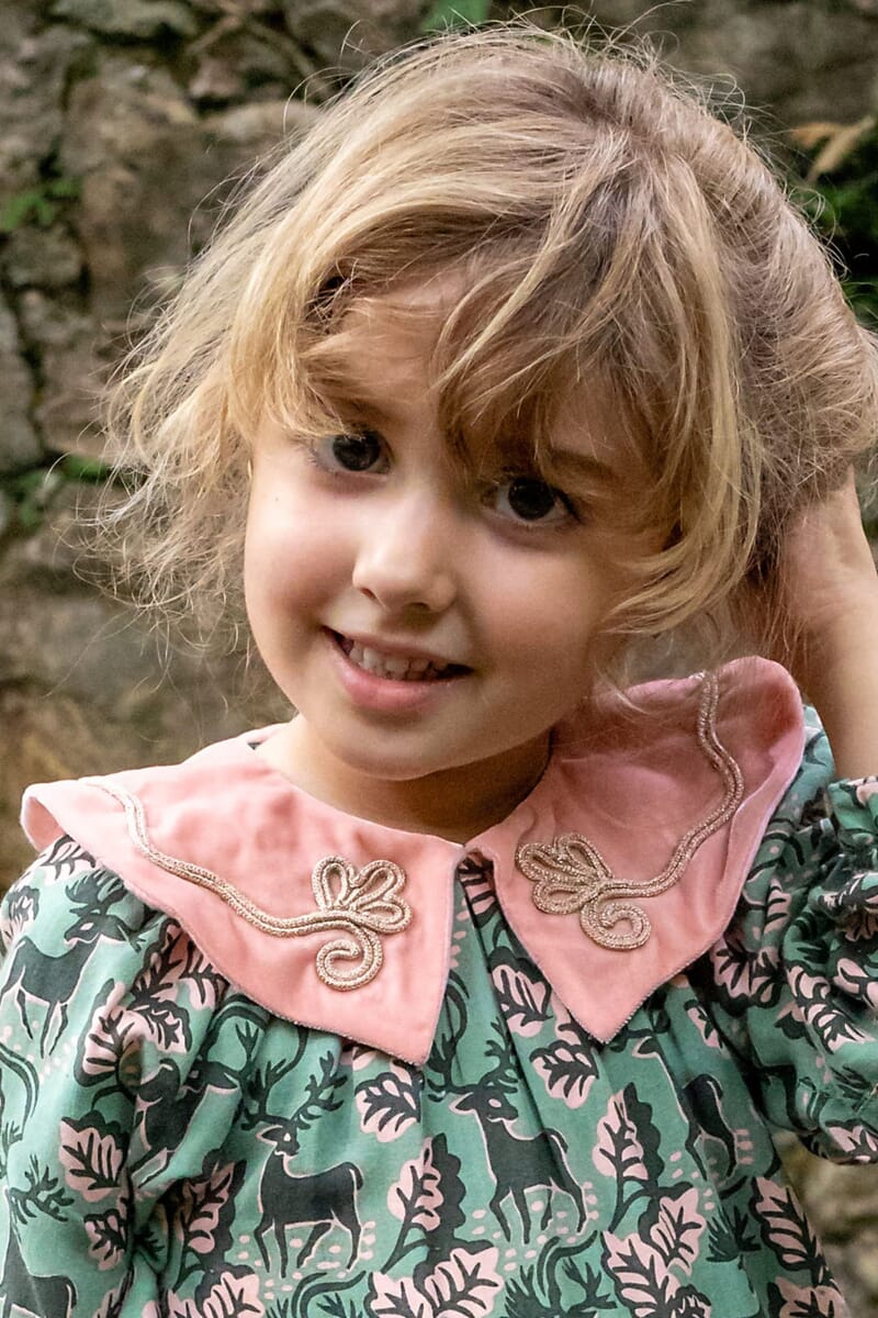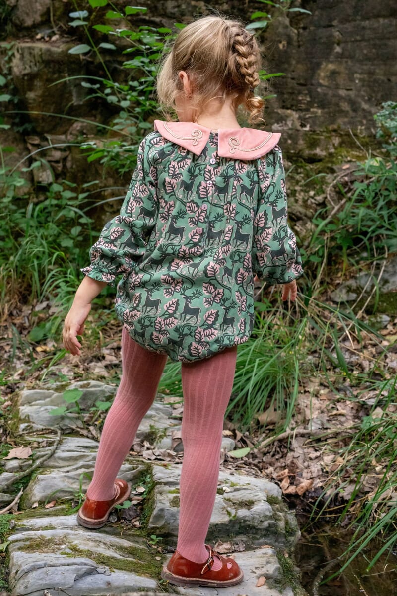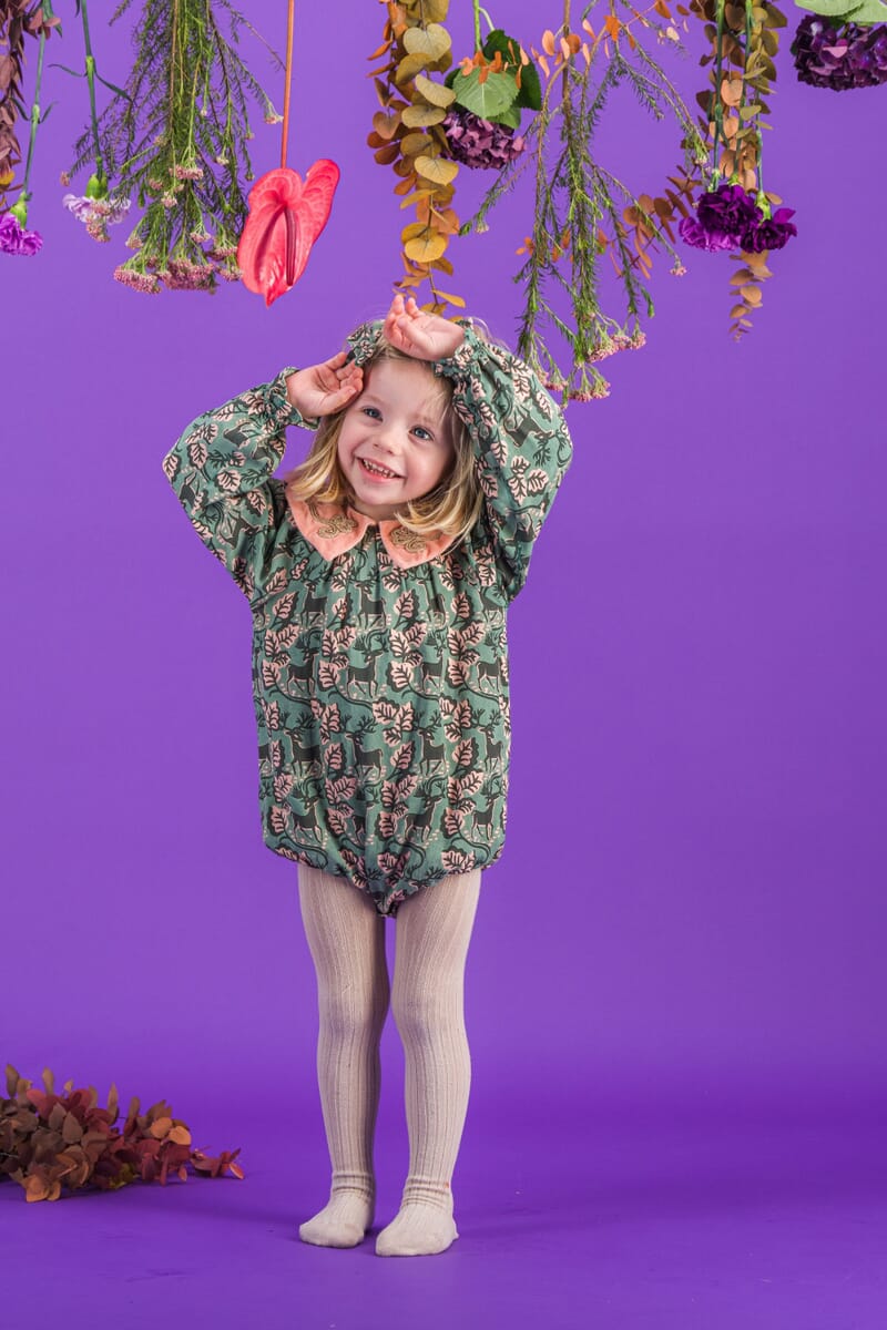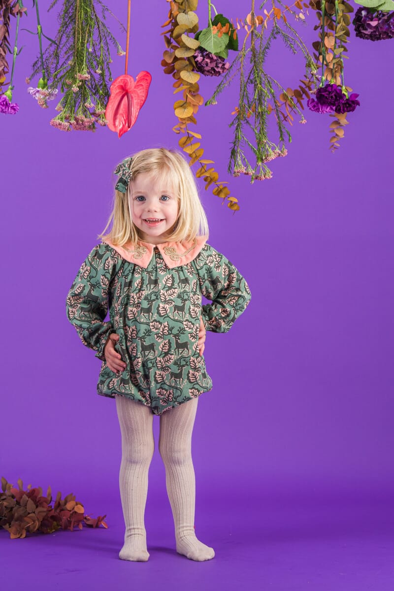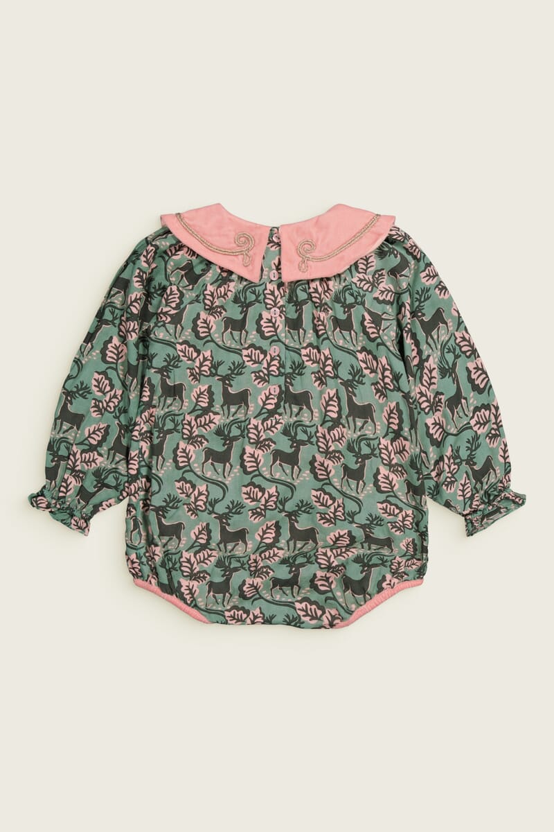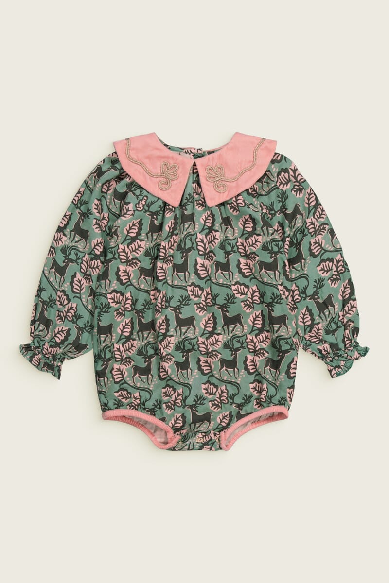 - Barboteuse, 100% Viscose ECOVERO®, Imprimé Block Print, Doublure unie en coton bio, Col en velours couleur Light rose avec des broderies main dorées, Manches longues élastiquées, Boutons pression dorés à l’entrejambe, Boutons contrastés dans le dos.