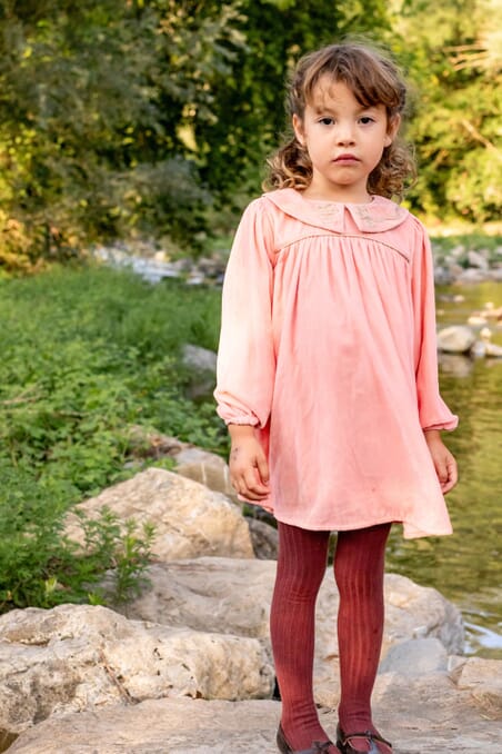 Une barboteuse en Viscose ECOVERO® avec des broderies main dorées sur un col en velours.
