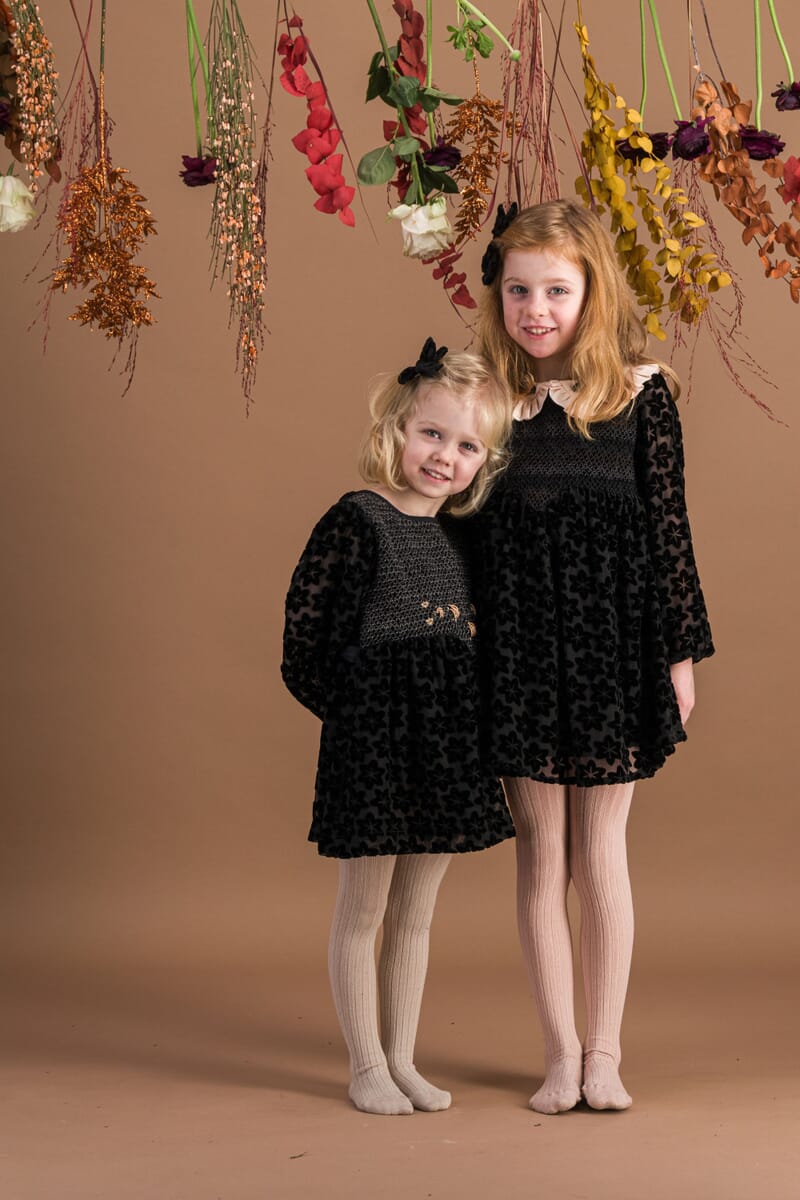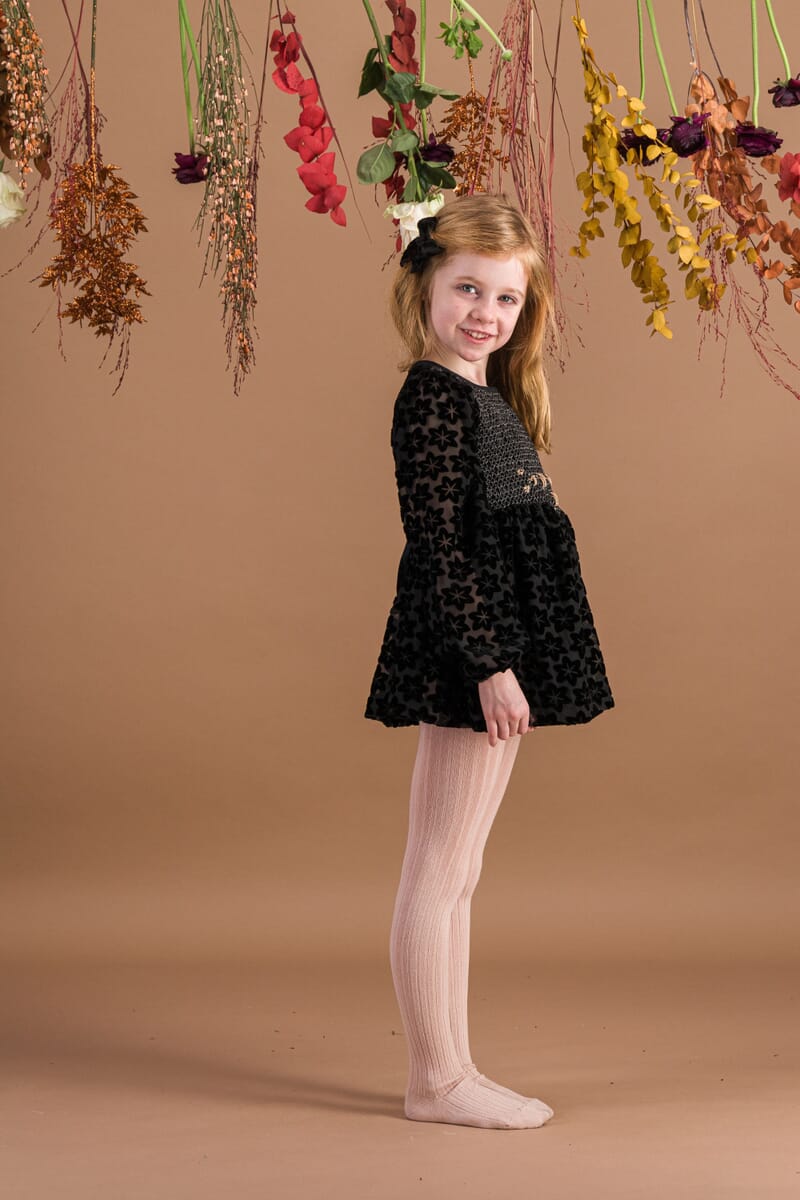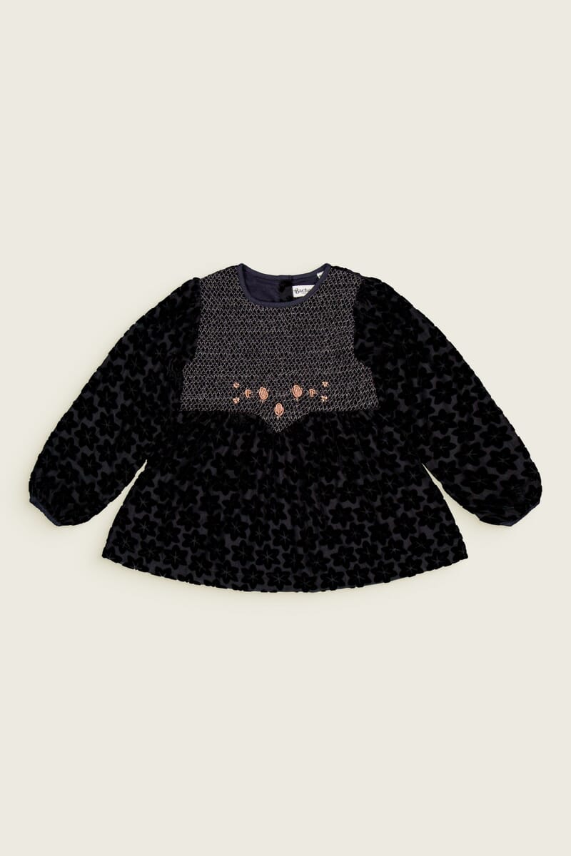 - Blouse/Robe courte, Velours dévoré, Couleur Noir, Doublure unie en voile de coton bio, Entièrement smockée sur le devant, Broderies main, Manches longues élastiquées, Boutons dorés et ceinture dans le dos.