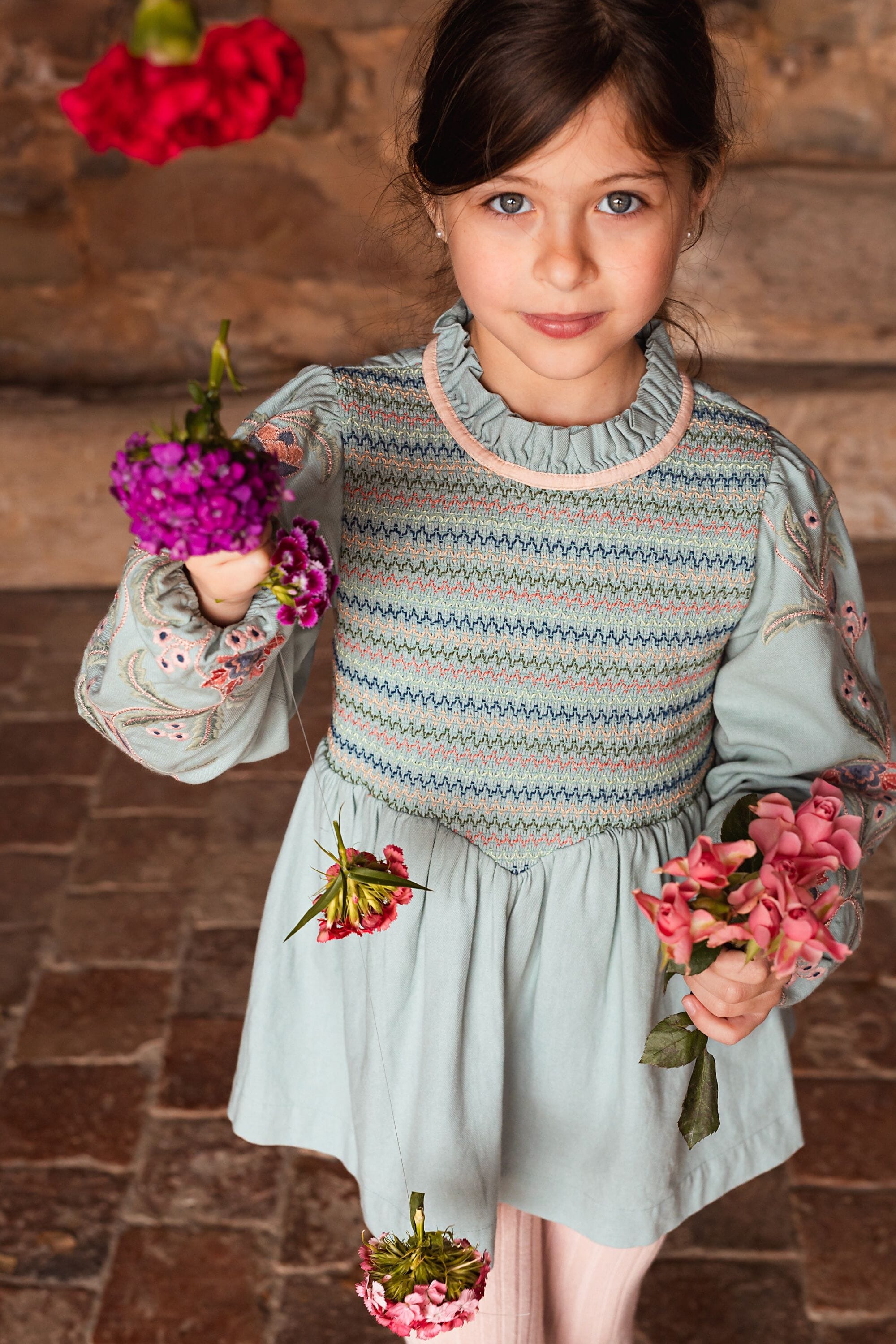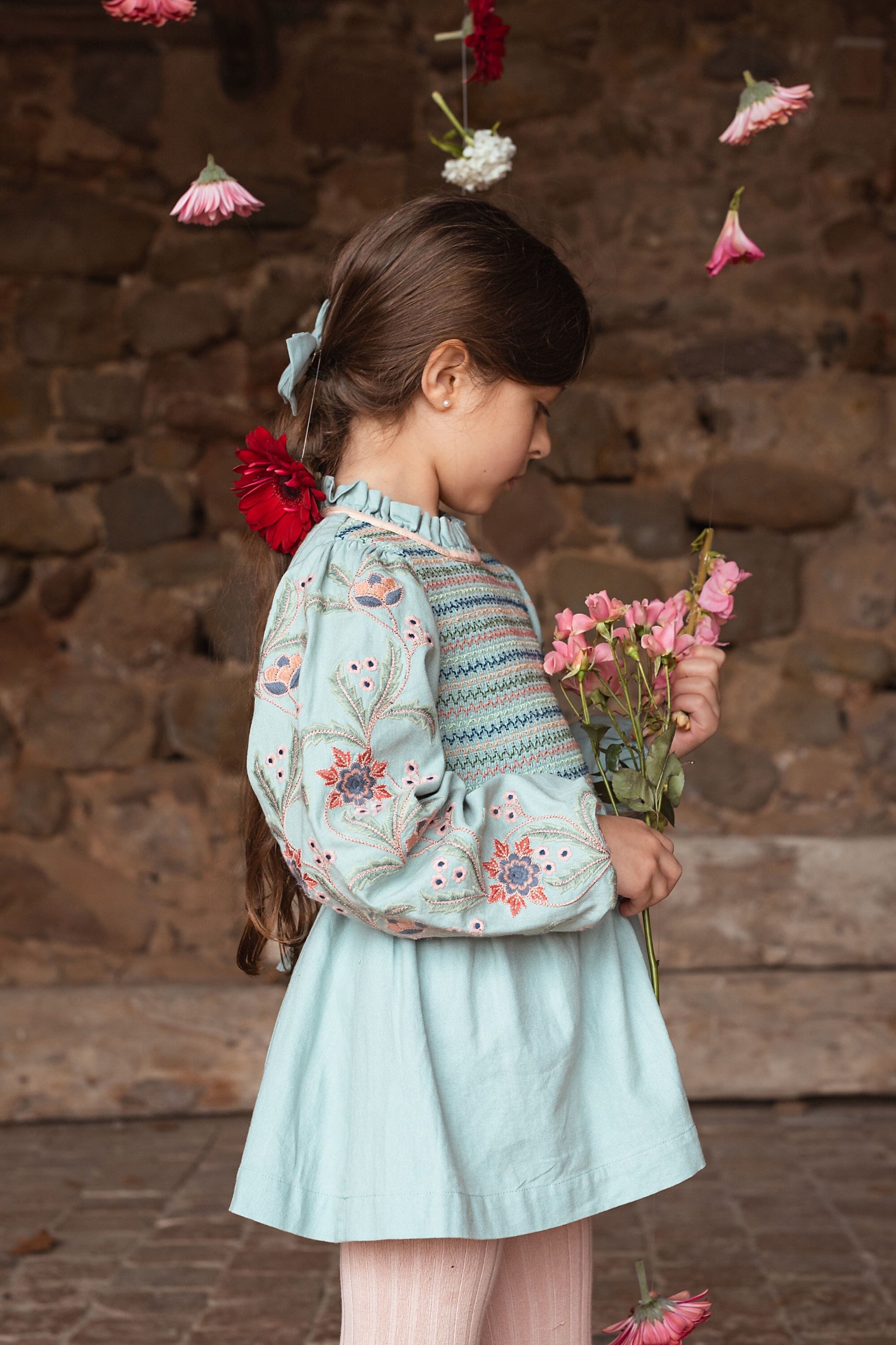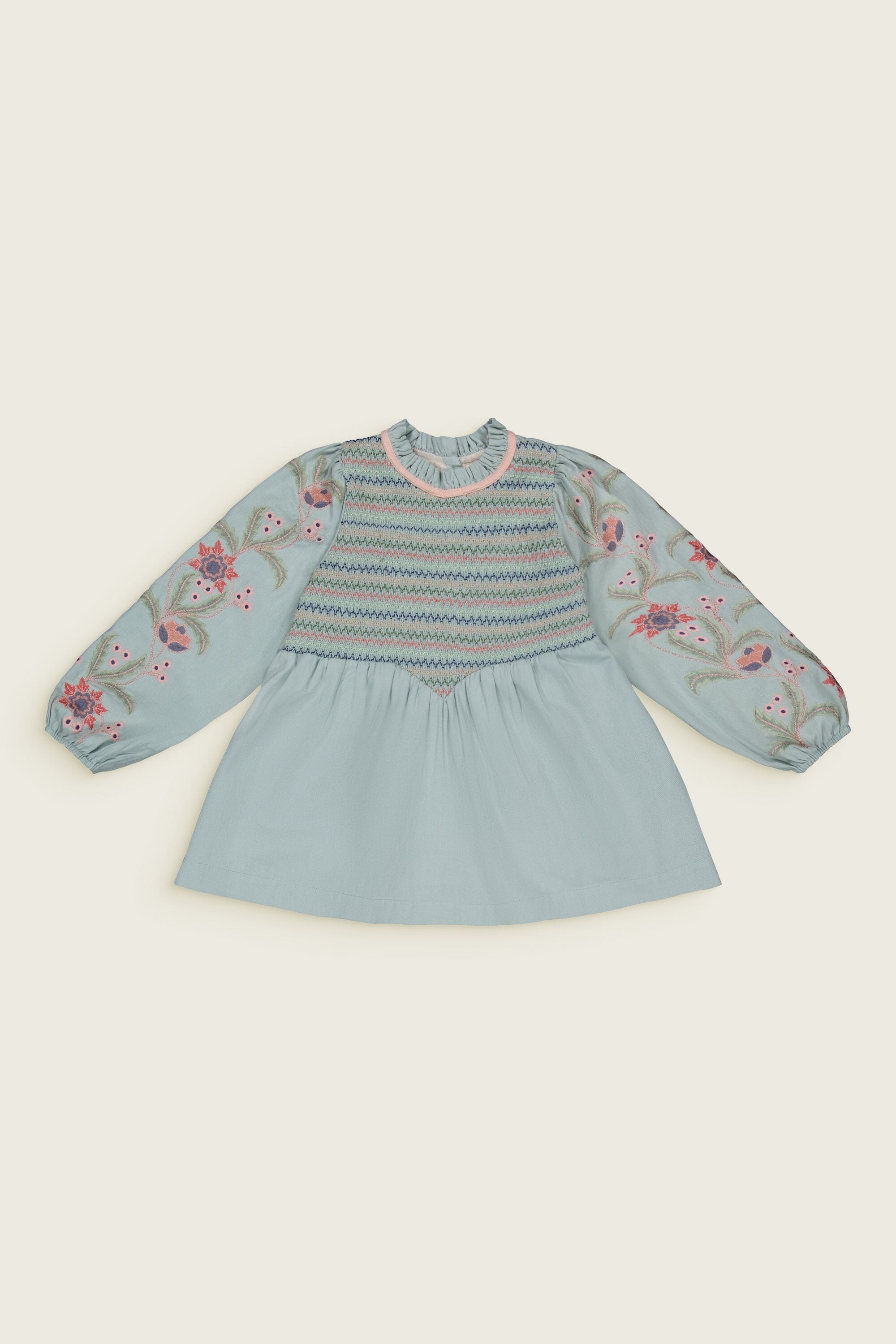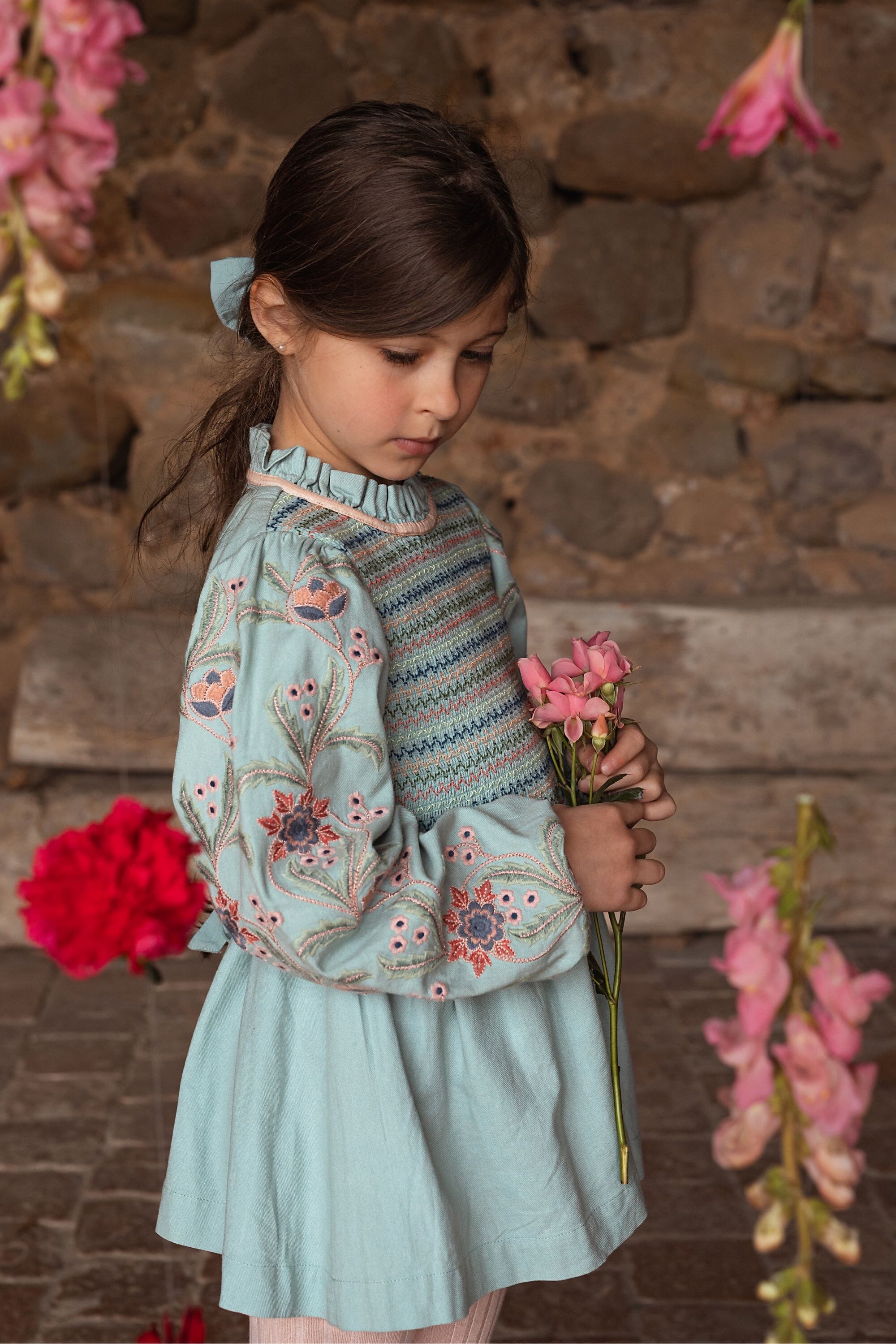 - Blouse/Robe courte, Couleur Bleu, Twill de coton bio (167 g/m2), Doublure unie en voile de coton bio, Manches longues brodées et élastiquées, Smocks sur la poitrine, Volant sur le col, Boutons et ceinture ton sur ton dans le dos.