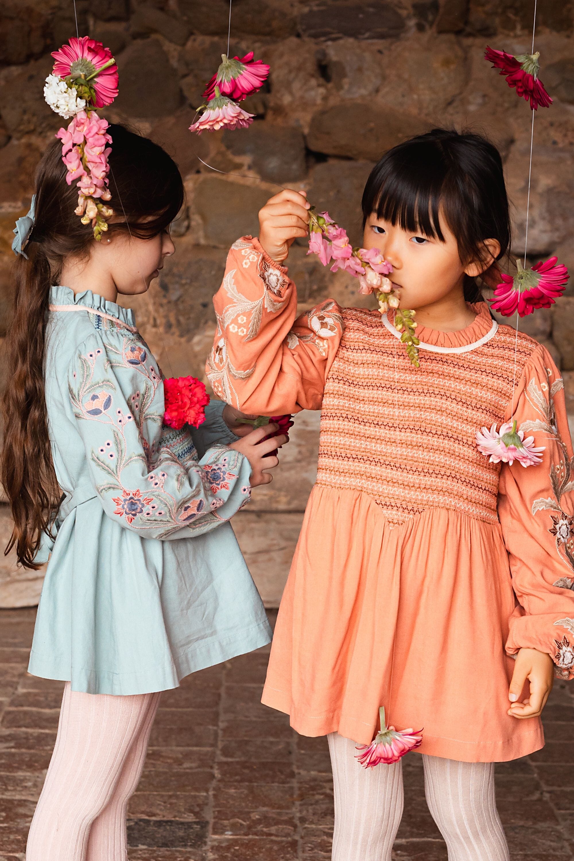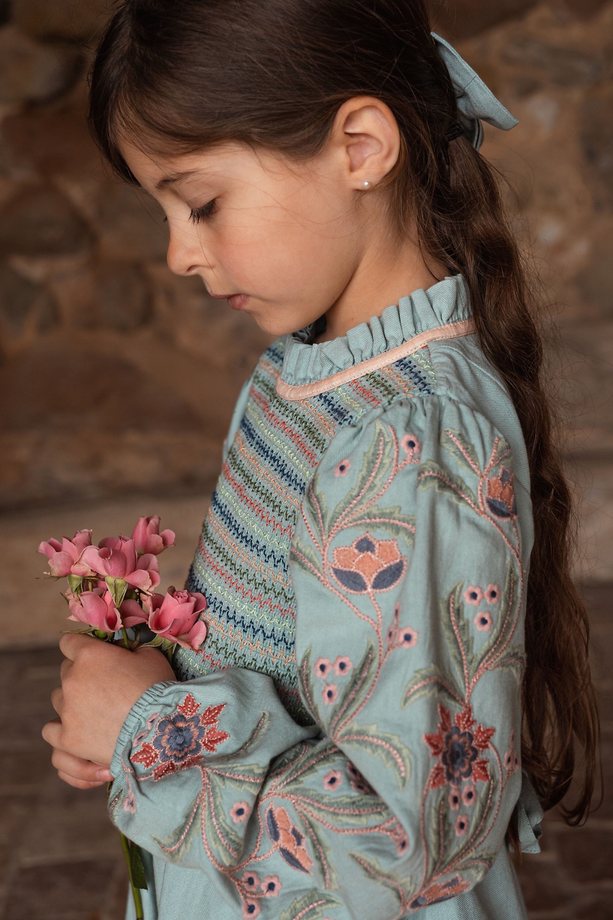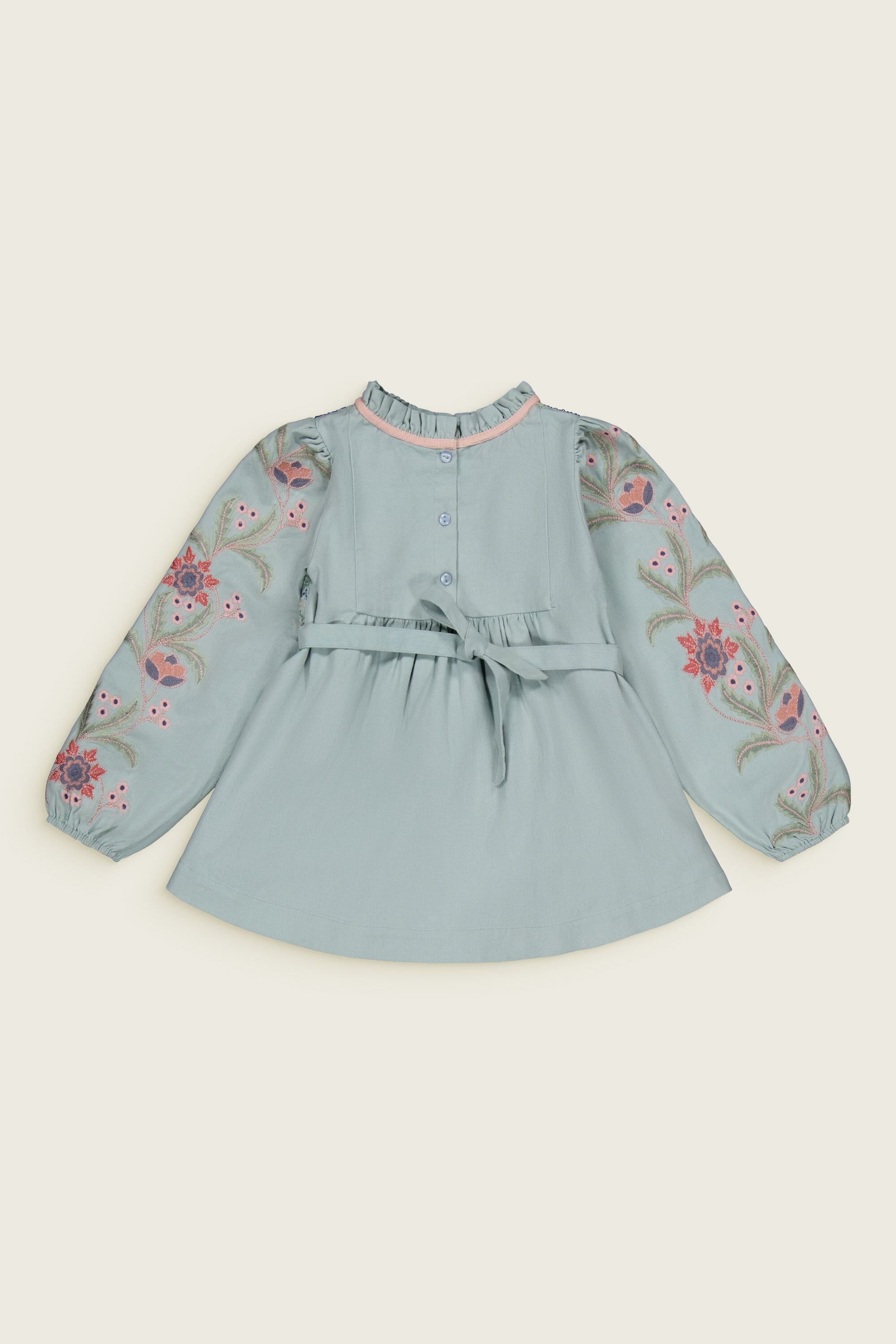 - Blouse/Robe courte, Couleur Bleu, Twill de coton bio (167 g/m2), Doublure unie en voile de coton bio, Manches longues brodées et élastiquées, Smocks sur la poitrine, Volant sur le col, Boutons et ceinture ton sur ton dans le dos.