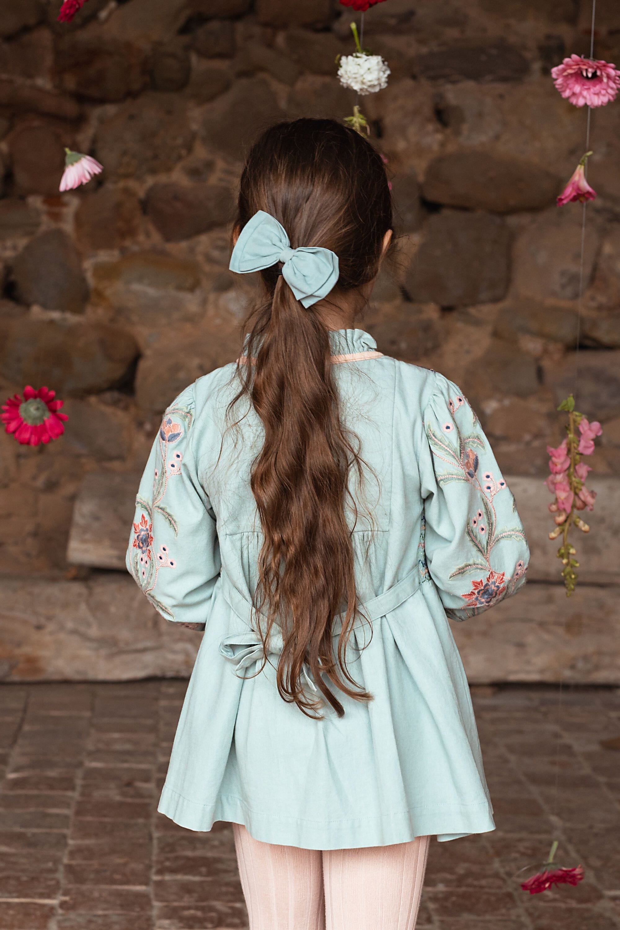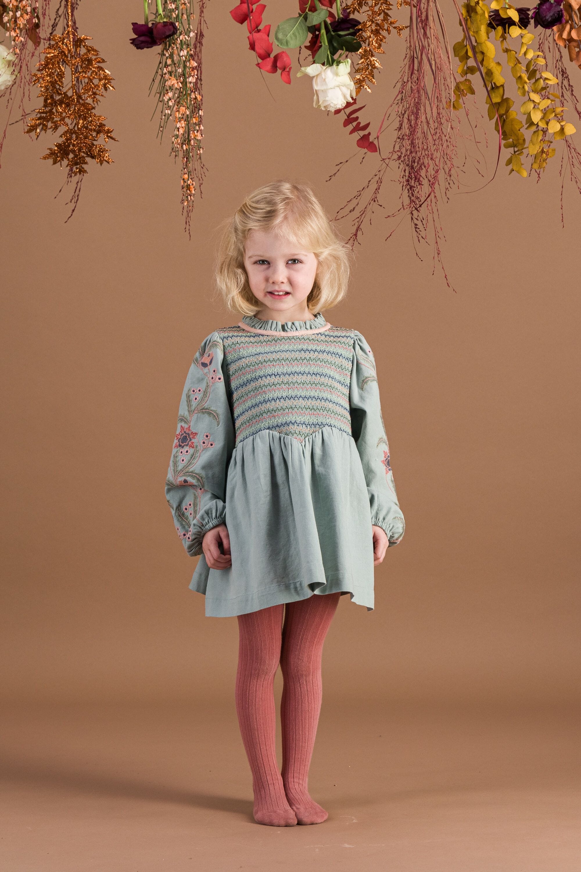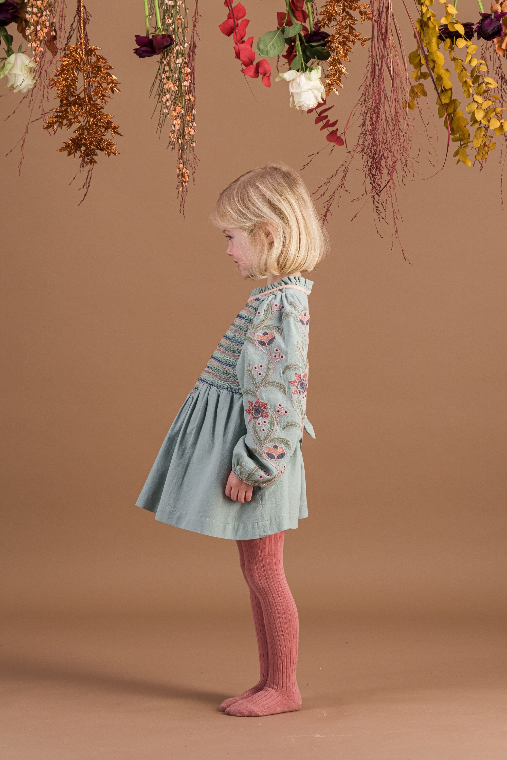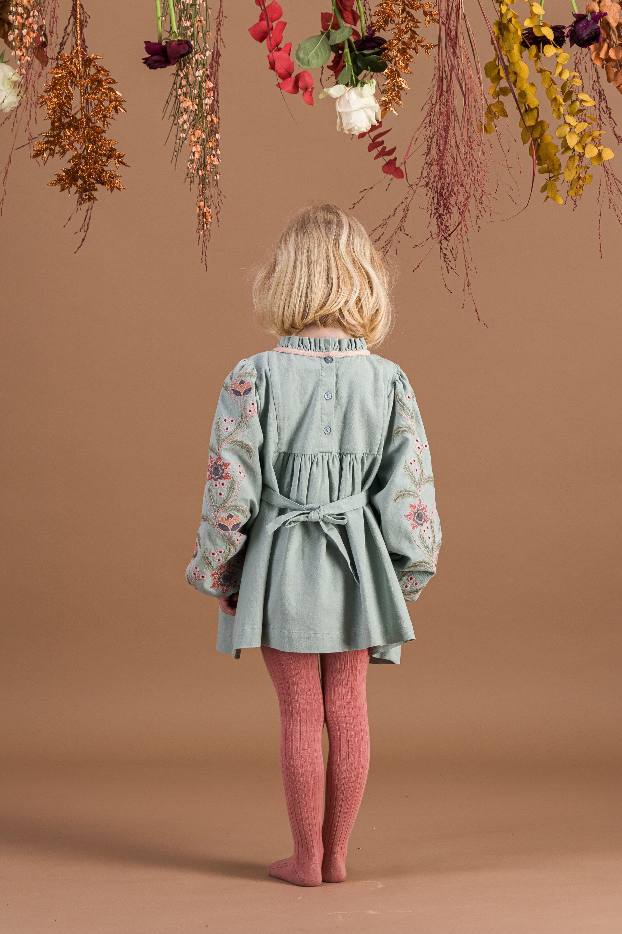 - Blouse/Robe courte, Couleur Bleu, Twill de coton bio (167 g/m2), Doublure unie en voile de coton bio, Manches longues brodées et élastiquées, Smocks sur la poitrine, Volant sur le col, Boutons et ceinture ton sur ton dans le dos.
