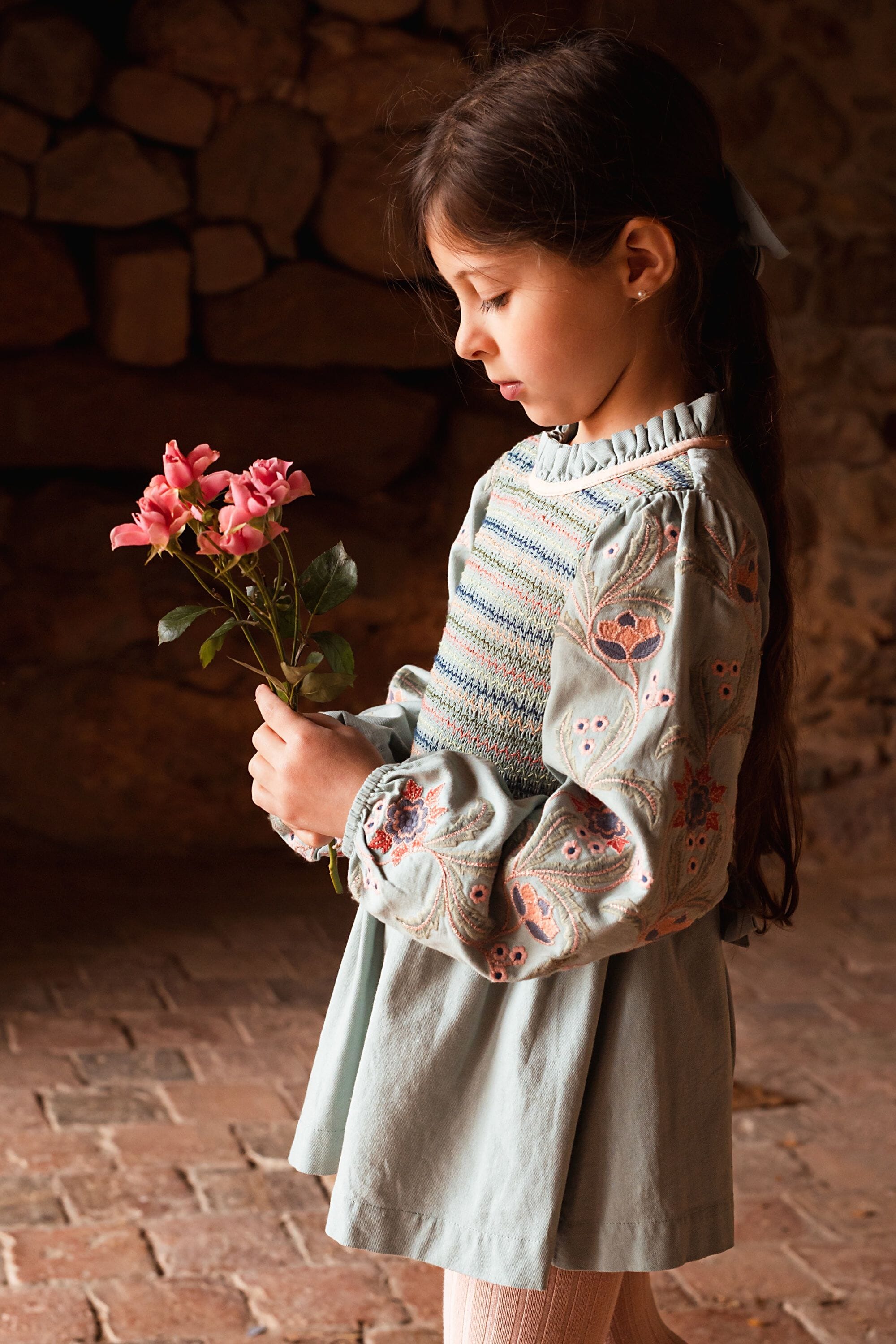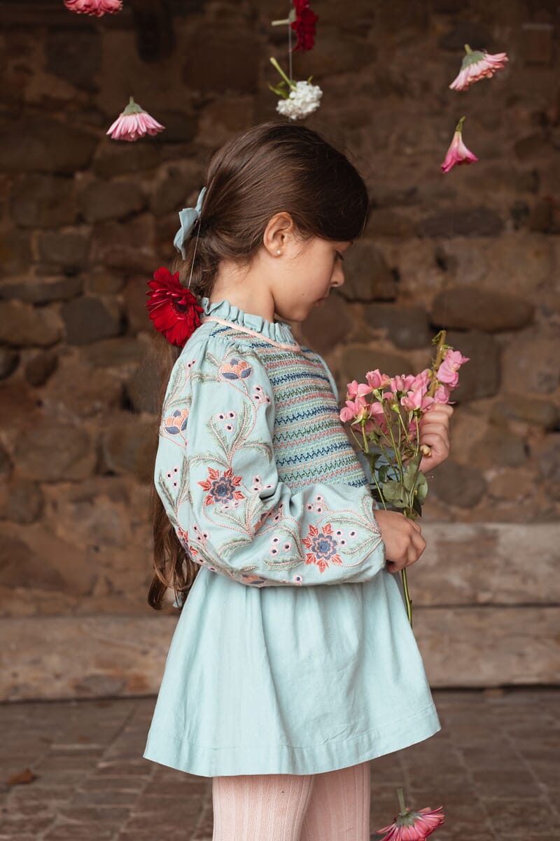 Une blouse faite d’un épais twill de coton bio (167 g/m2) avec des manches entièrement brodées, des smocks sur la poitrine et un volant sur le col.
