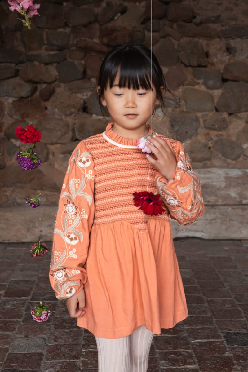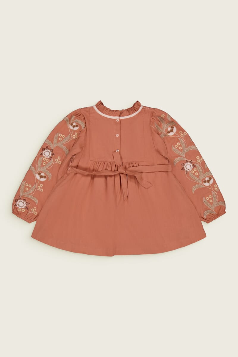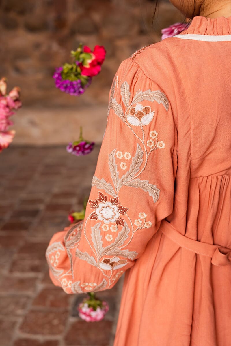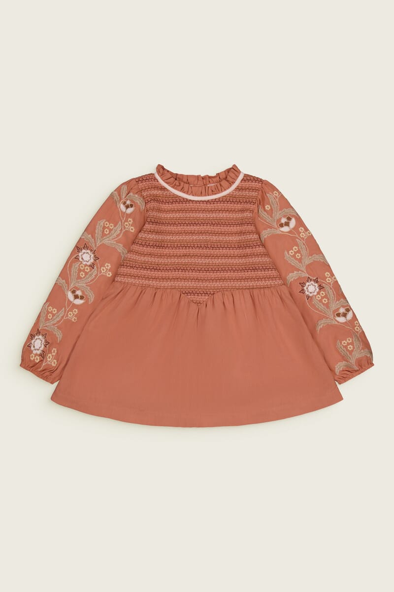 - Blouse/Robe courte, Couleur Blush, 100% Viscose ECOVERO®, Doublure unie en voile de coton bio, Manches longues brodées et élastiquées, Smocks sur la poitrine, Volant sur le col, Boutons et ceinture ton sur ton dans le dos.