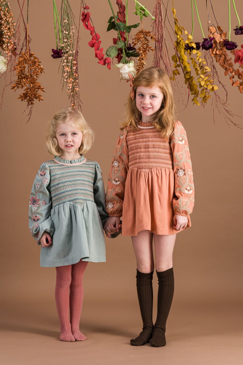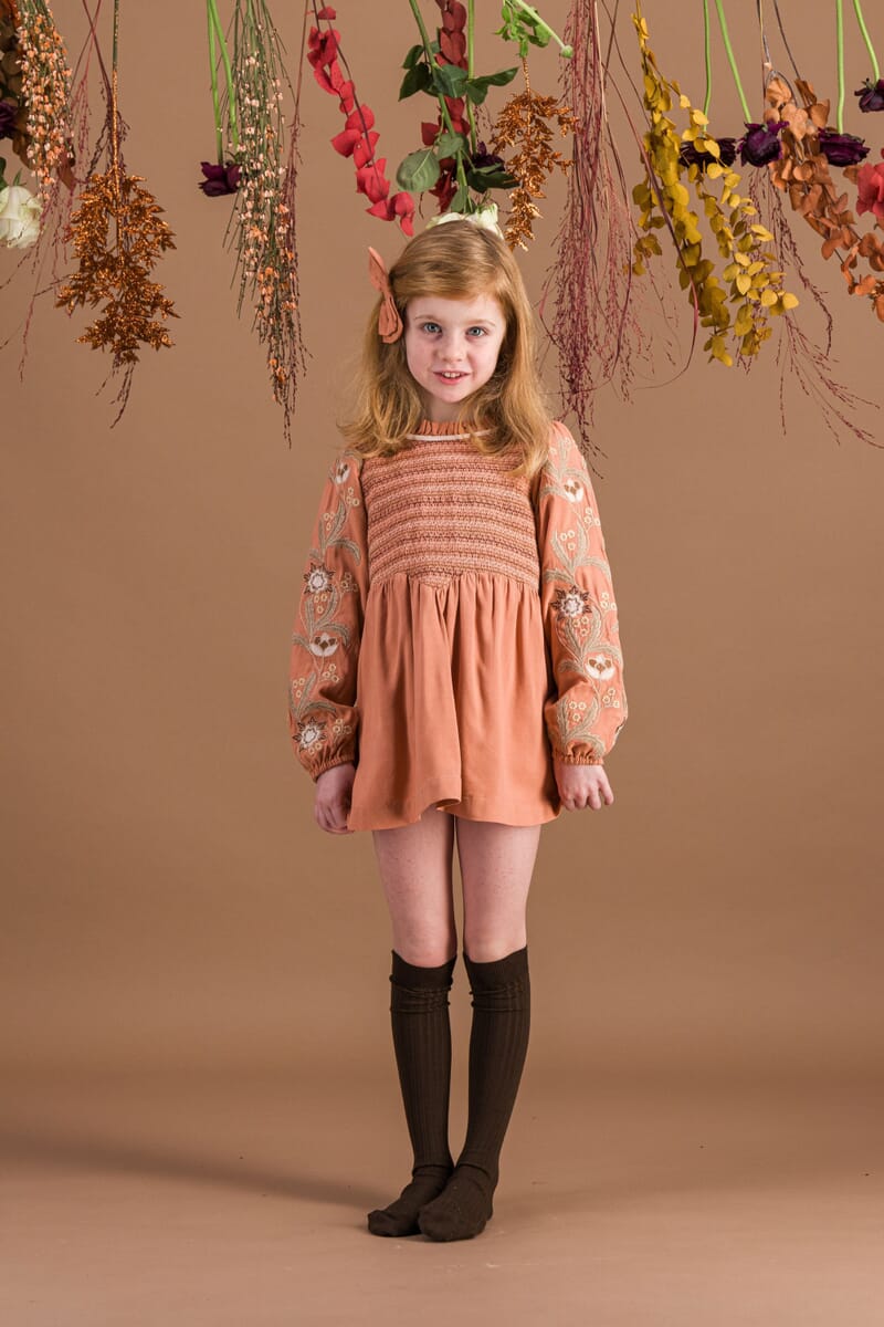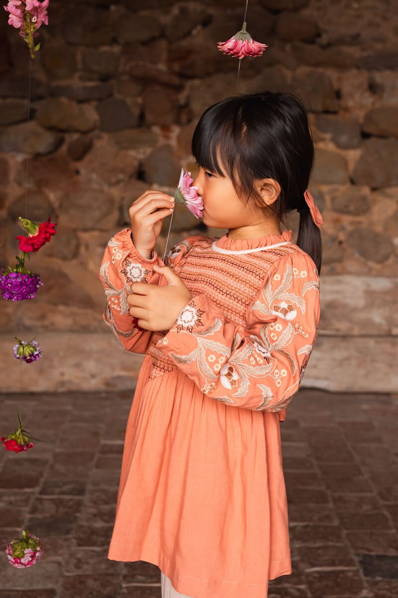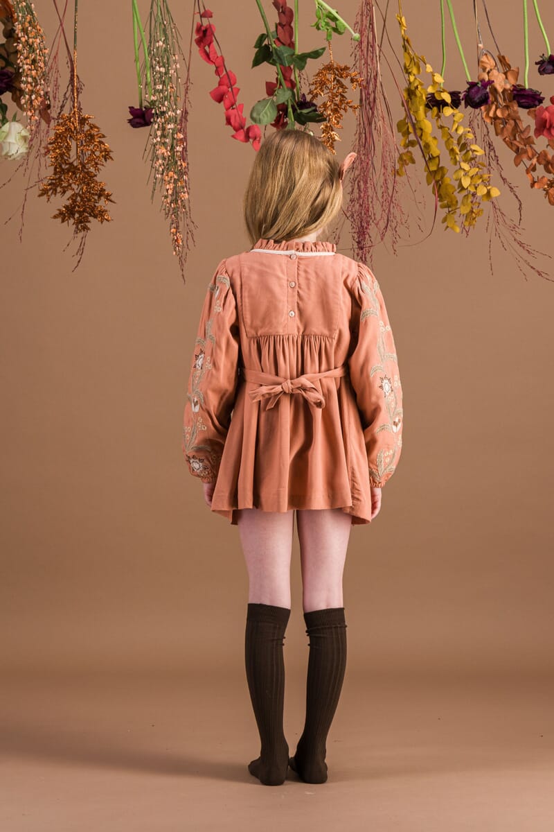 - Blouse/Robe courte, Couleur Blush, 100% Viscose ECOVERO®, Doublure unie en voile de coton bio, Manches longues brodées et élastiquées, Smocks sur la poitrine, Volant sur le col, Boutons et ceinture ton sur ton dans le dos.