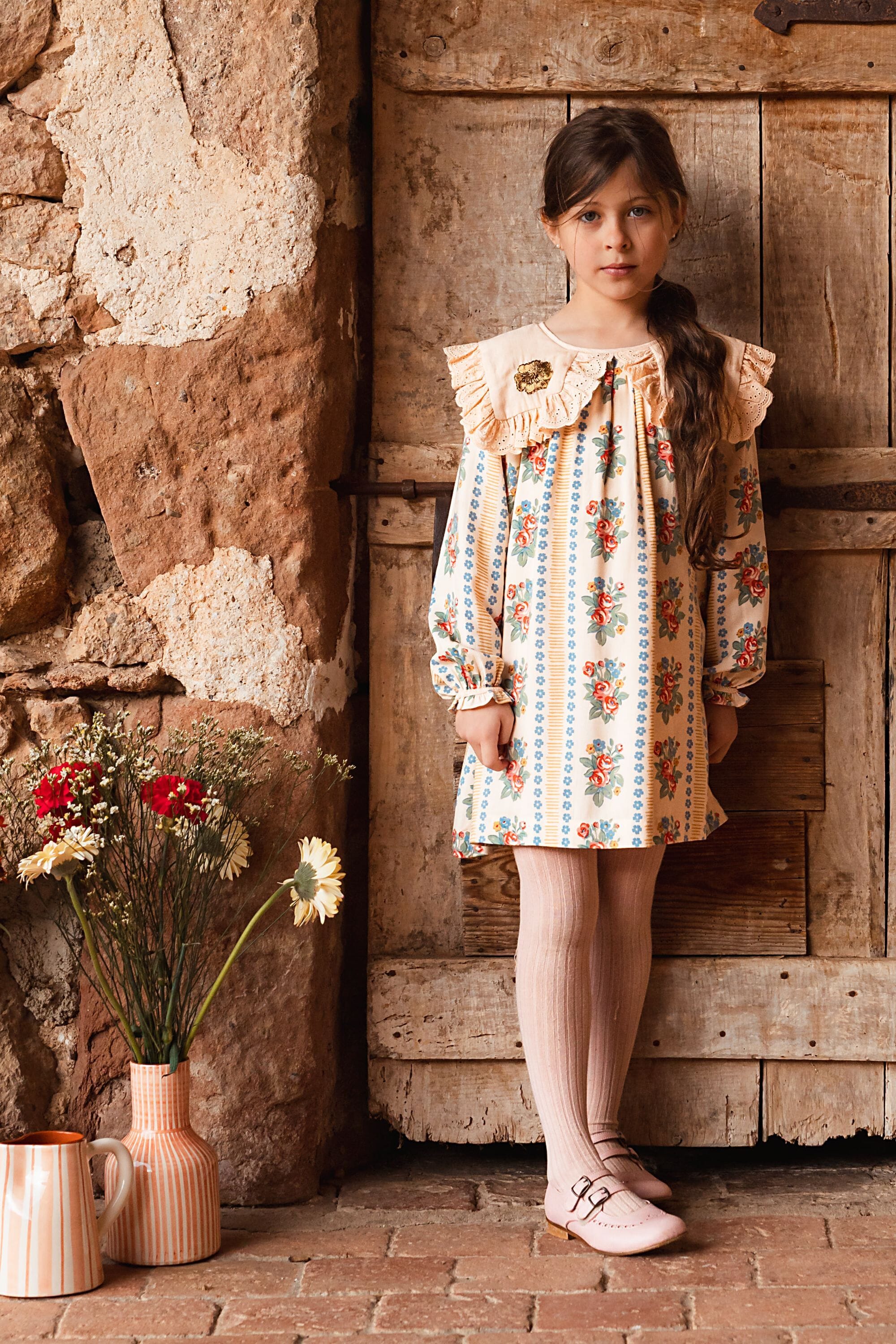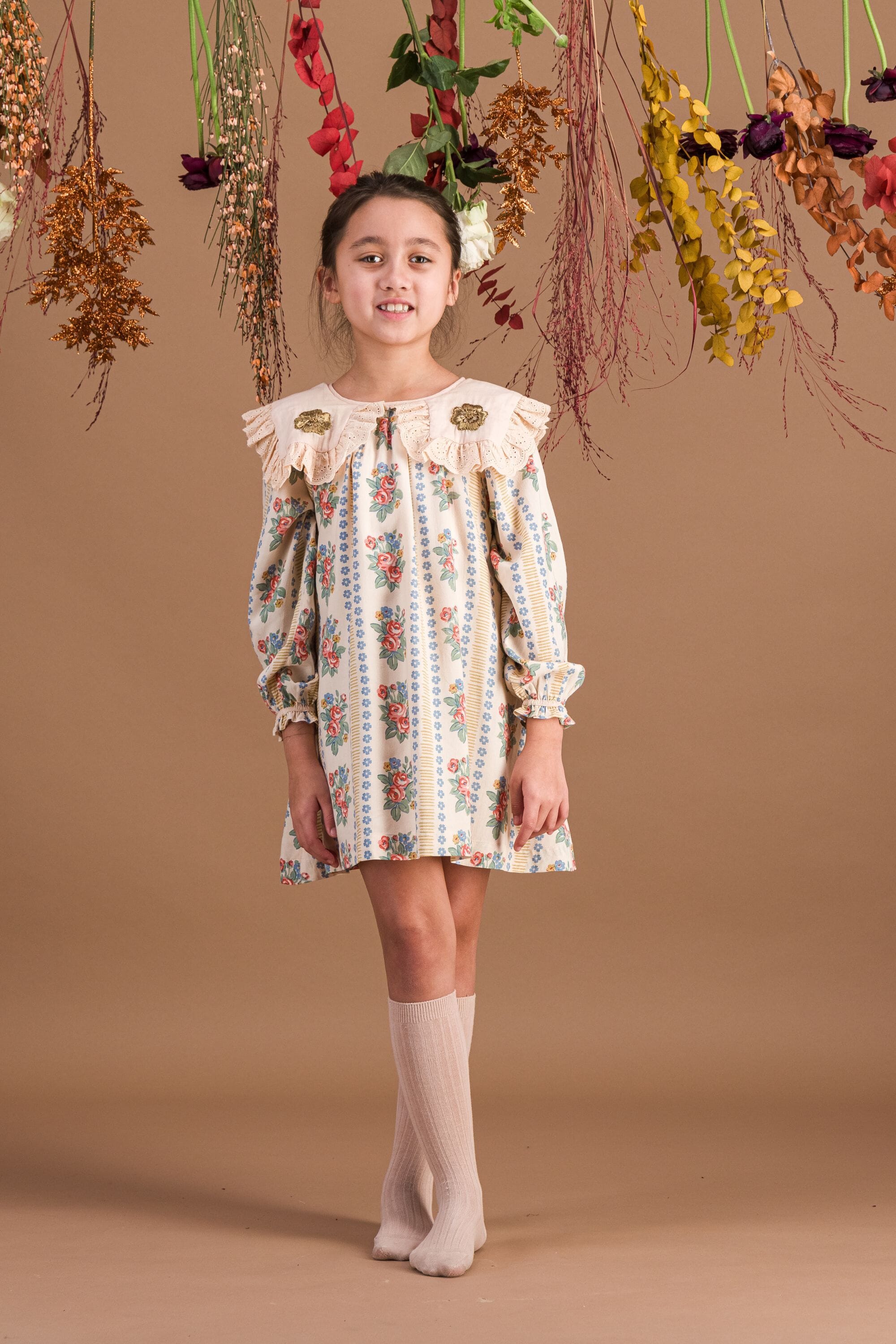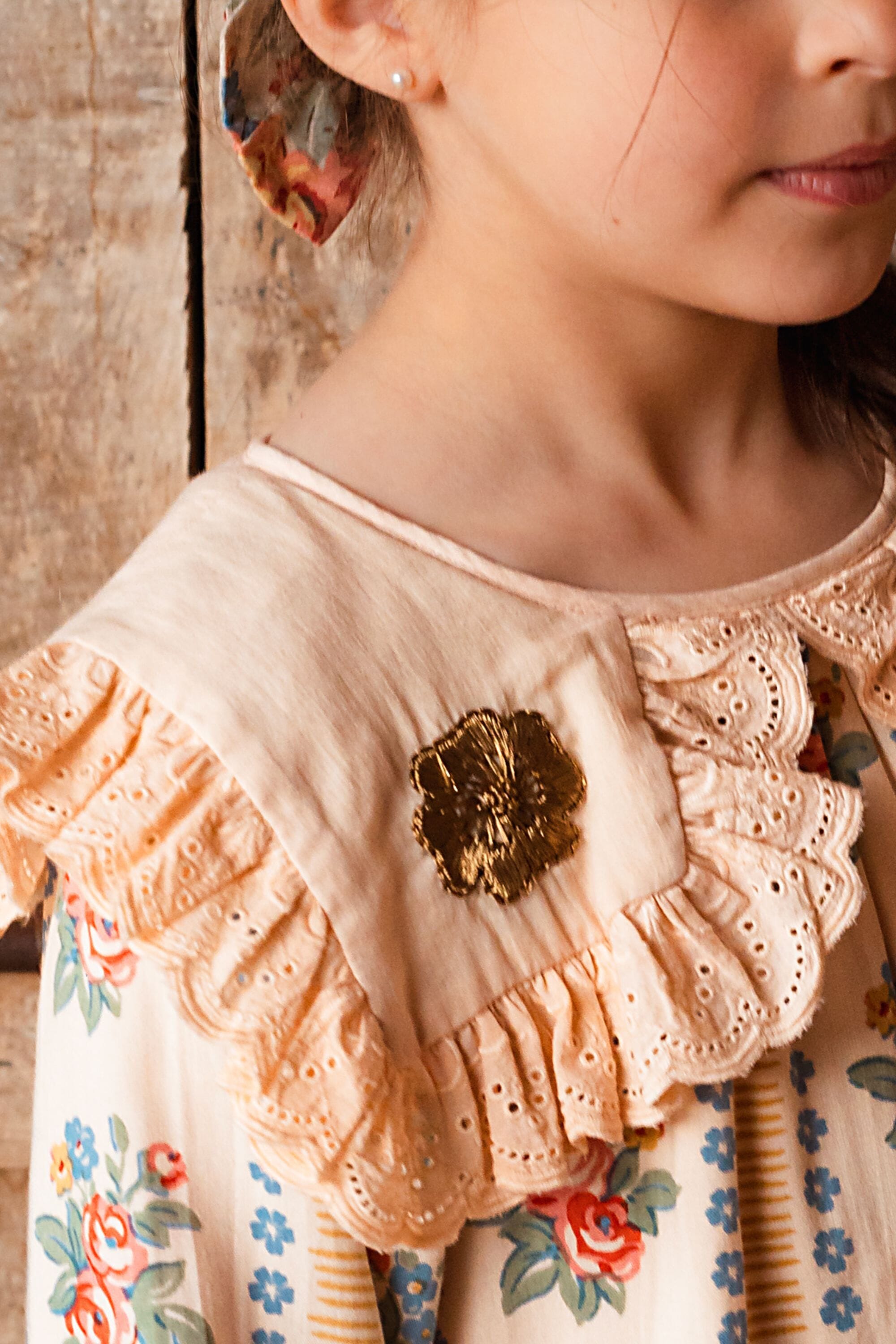 Une Robe en Viscose ECOVERO® avec des broderies main dorées et des broderies anglaises sur le col.