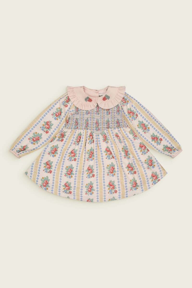 Robe, 100% Viscose ECOVERO®, Block print, Doublure unie en voile de coton bio, Broderies main sur le col, Smocks sur le devant, Manches longues élastiquées.