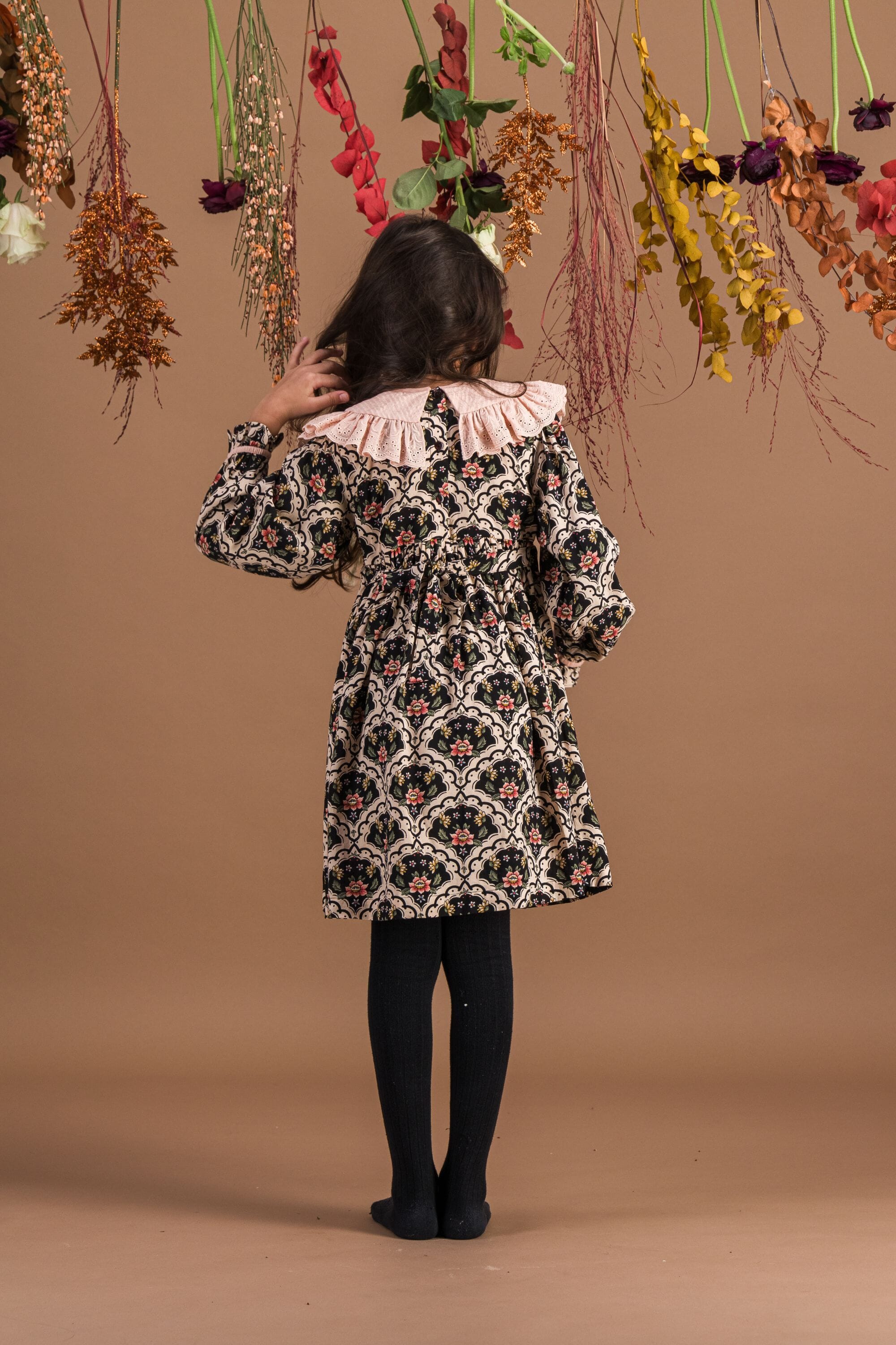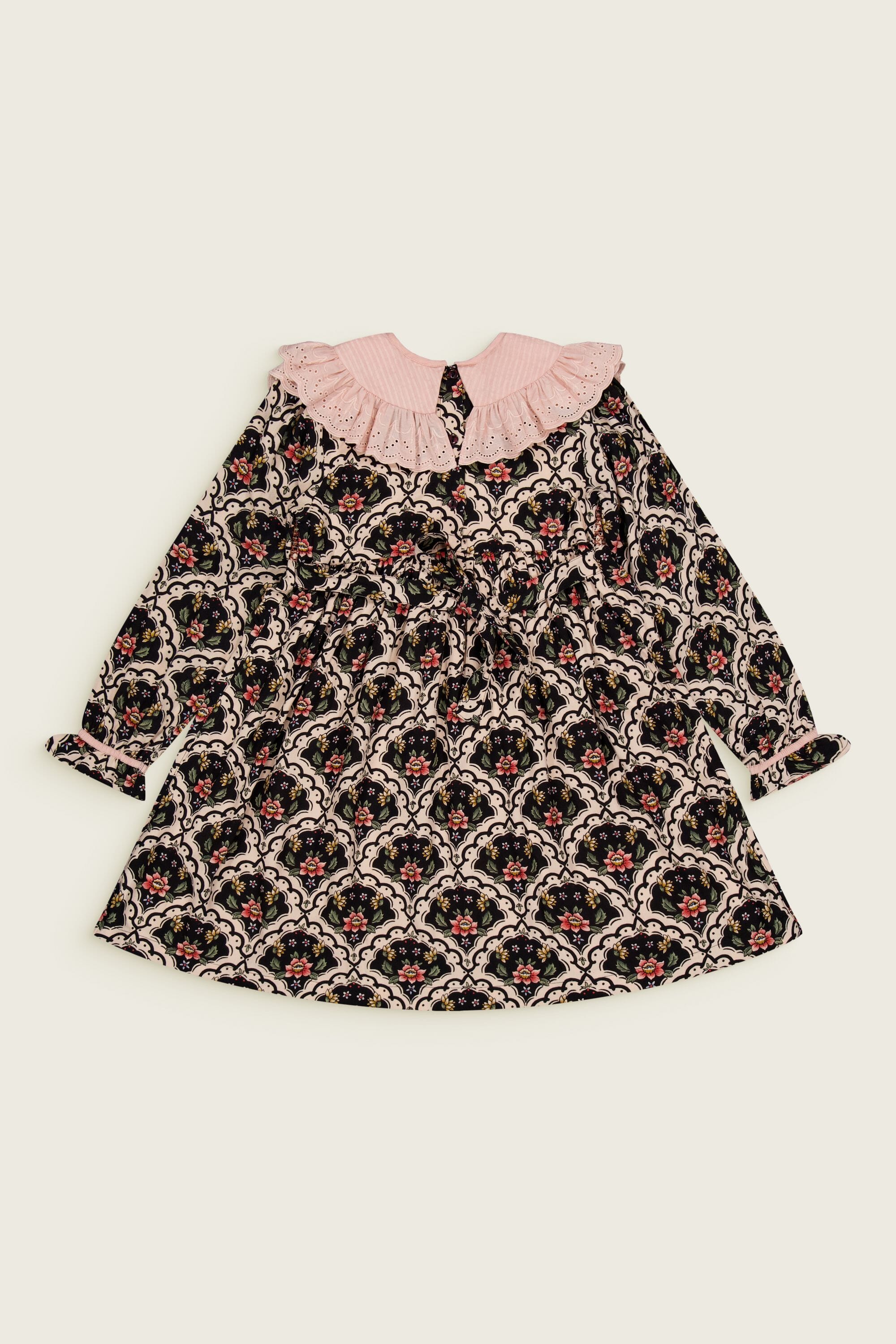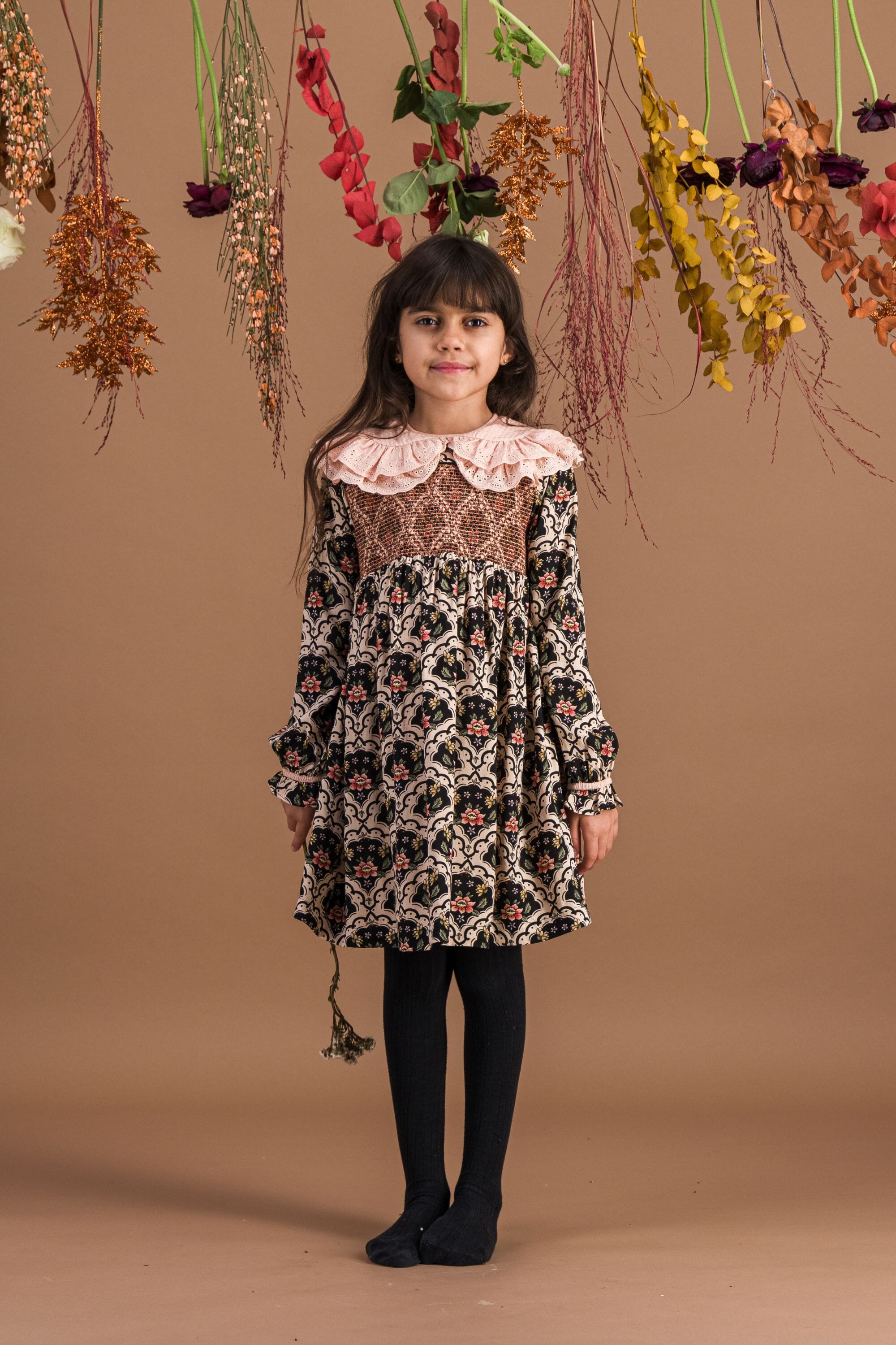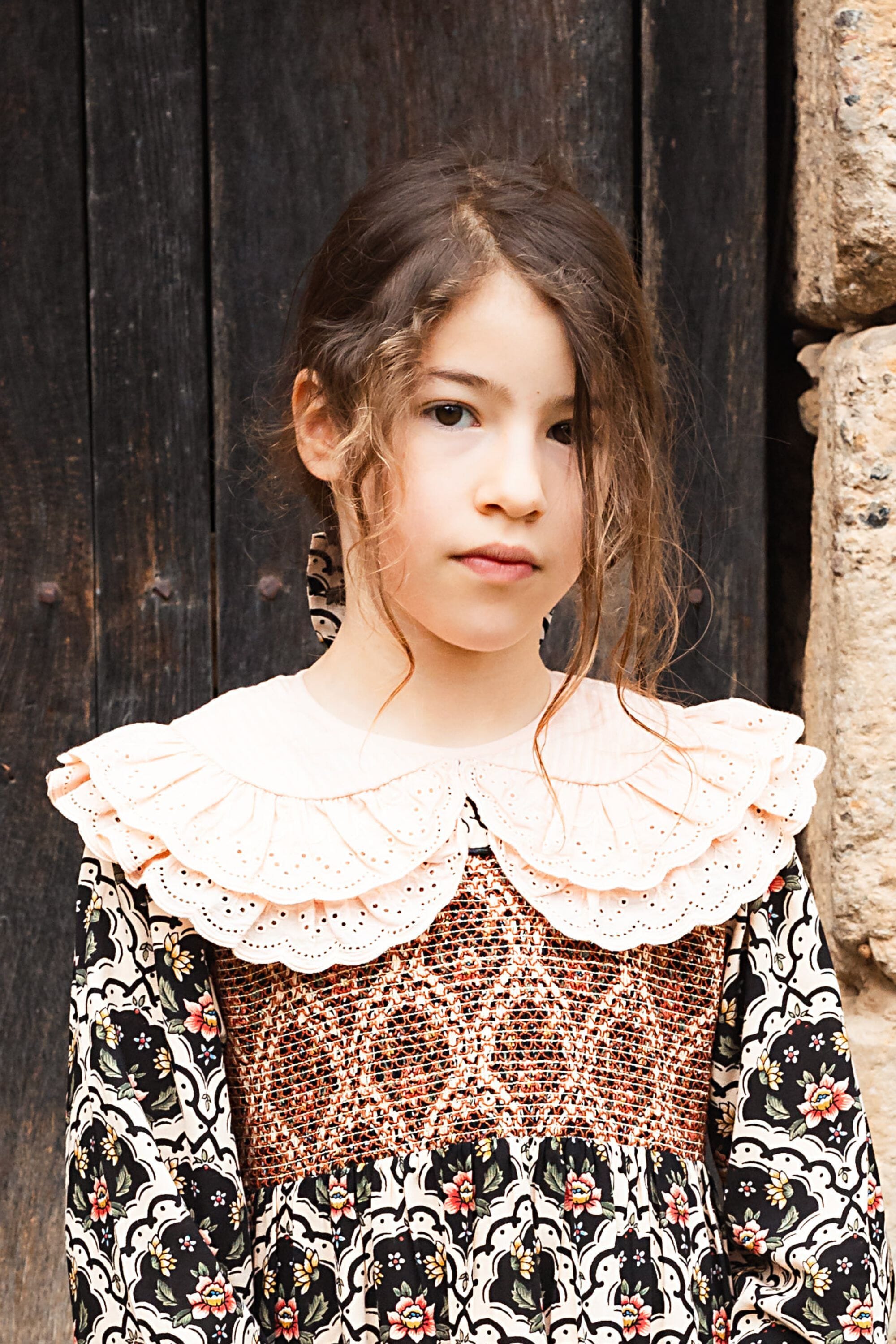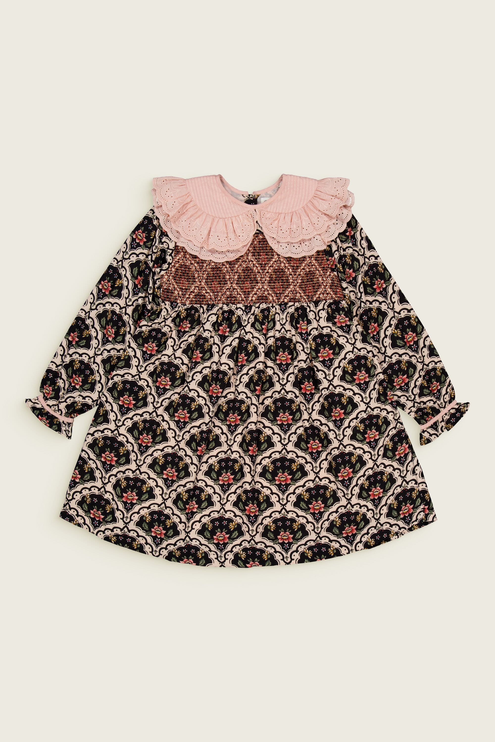 Une Robe en Viscose ECOVERO® avec un double col Claudine orné de broderies anglaises et un empiècement joliment smocké sur le devant fini d’un passepoil doré.