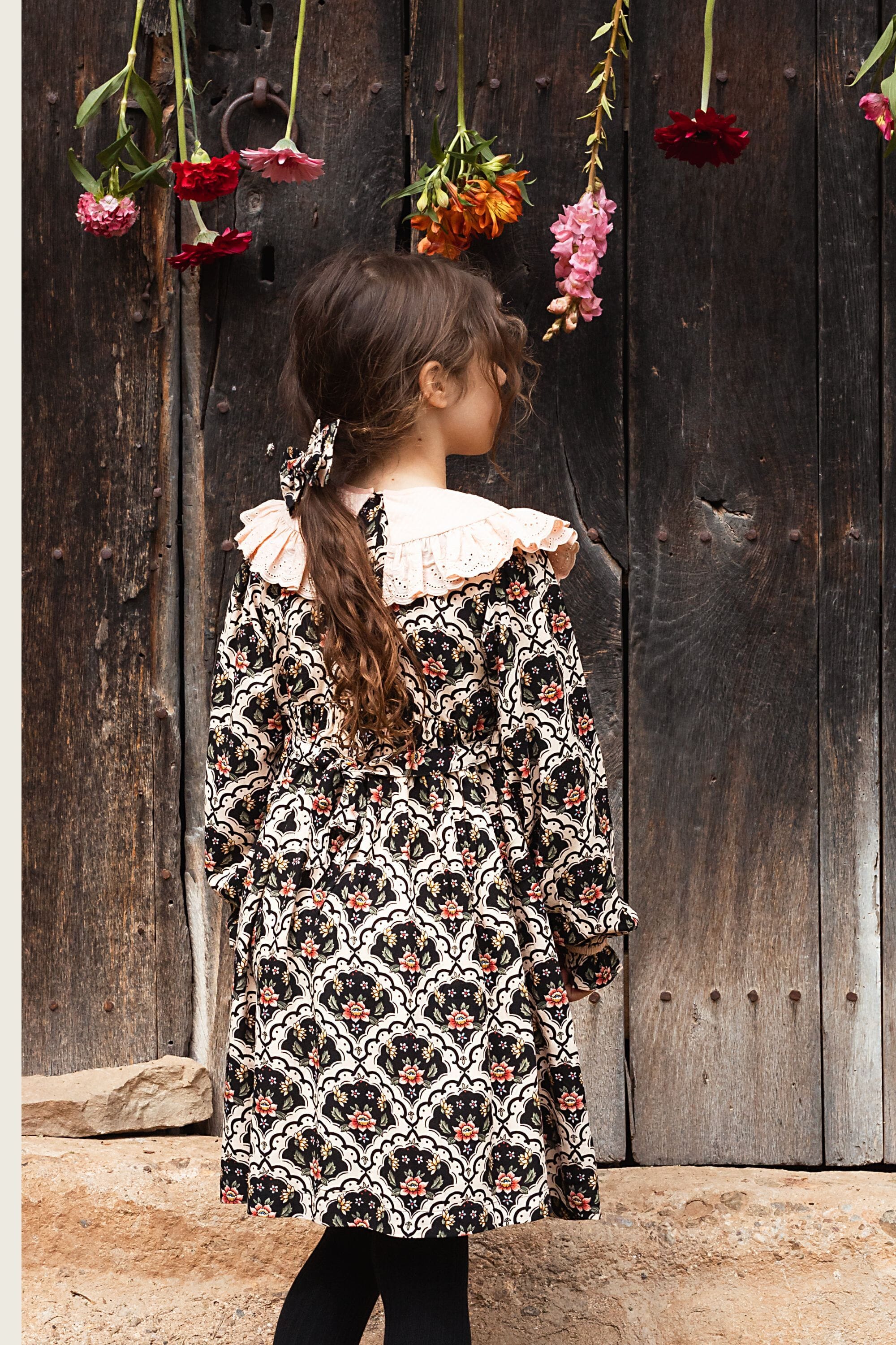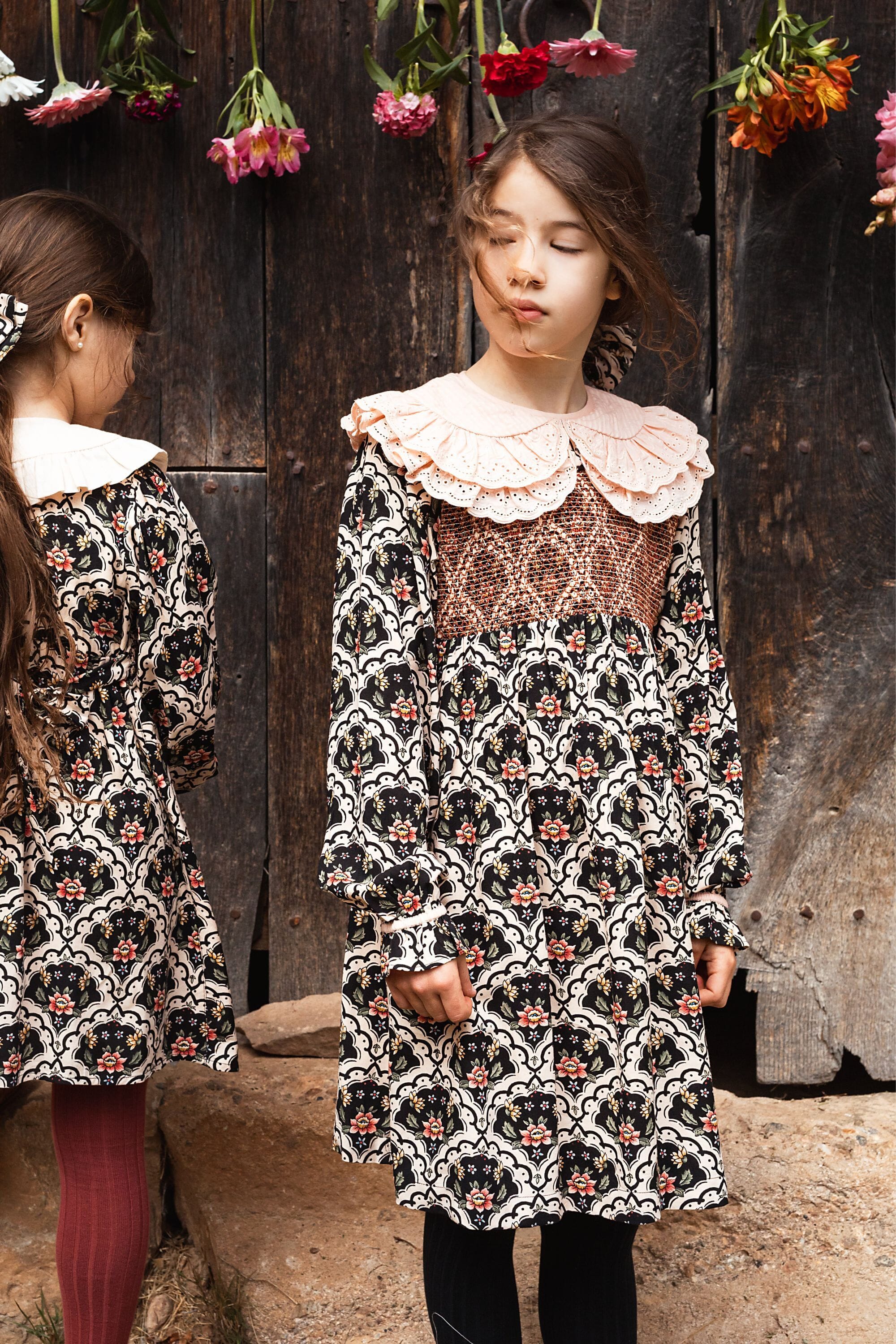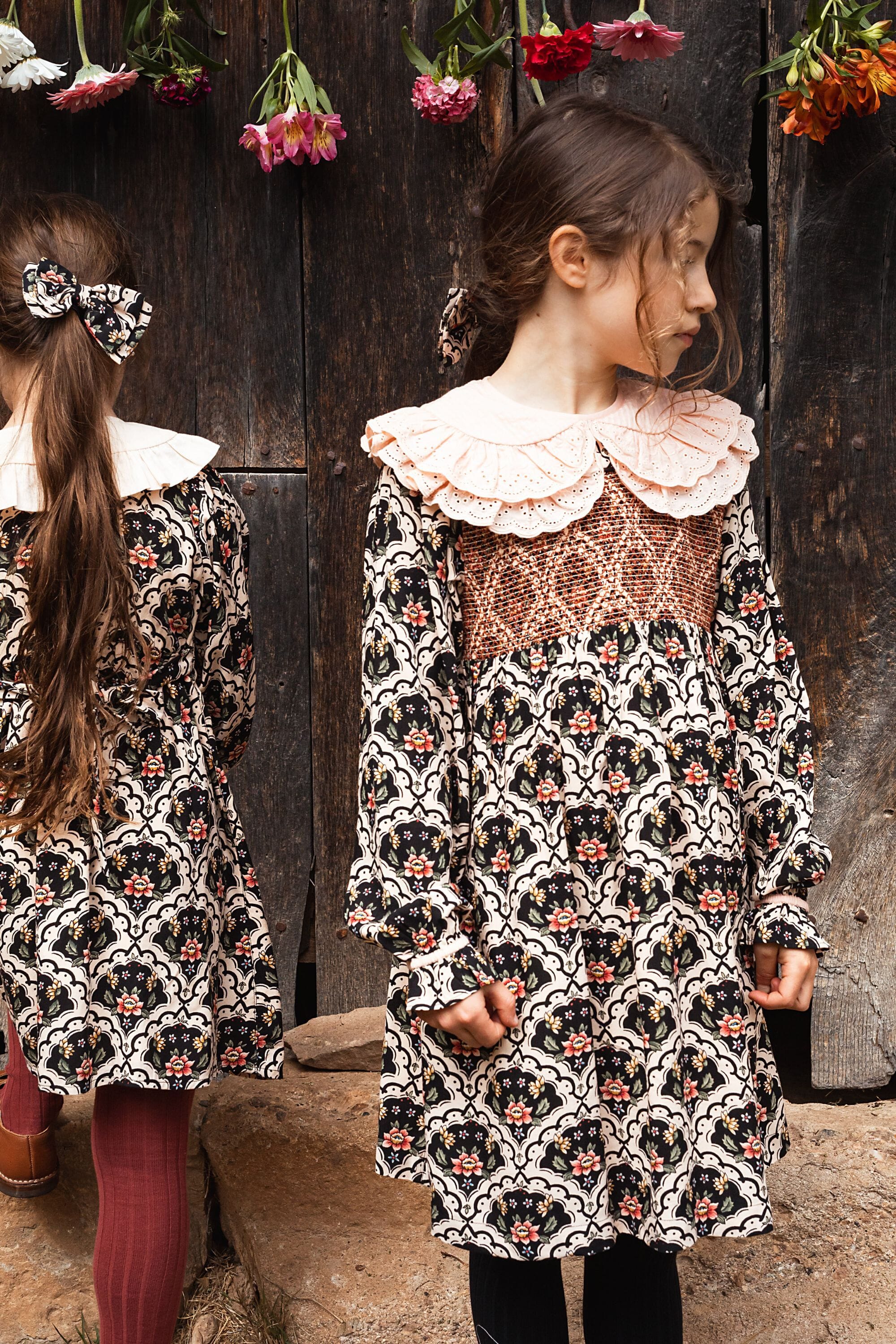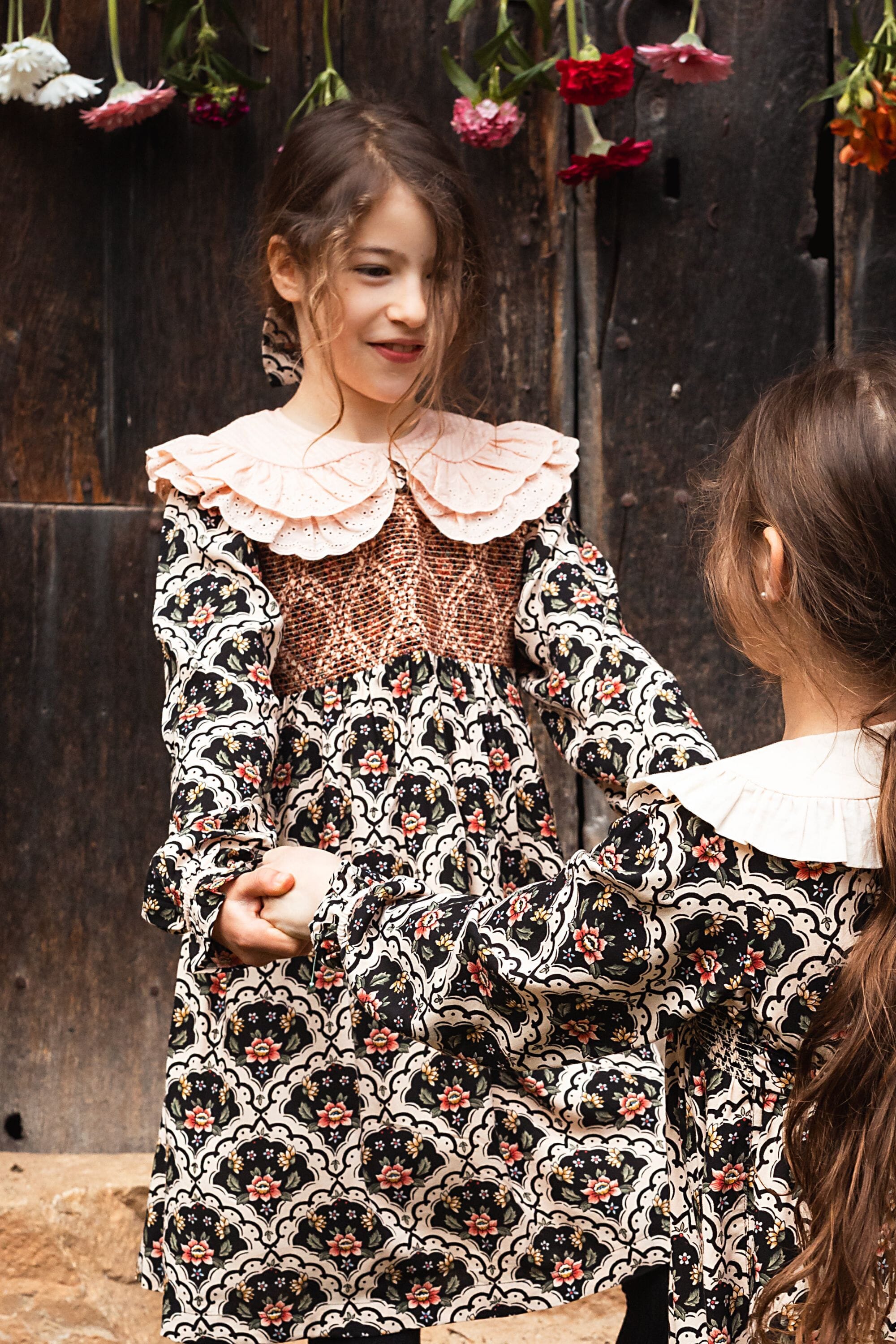 Robe, 100% Viscose ECOVERO®, Doublure unie en voile de coton bio, Block print, Double col Claudine orné de broderies anglaises, Smocks et Passepoil doré sur le devant, Manches longues élastiquées, Boutons contrastés dans le dos.