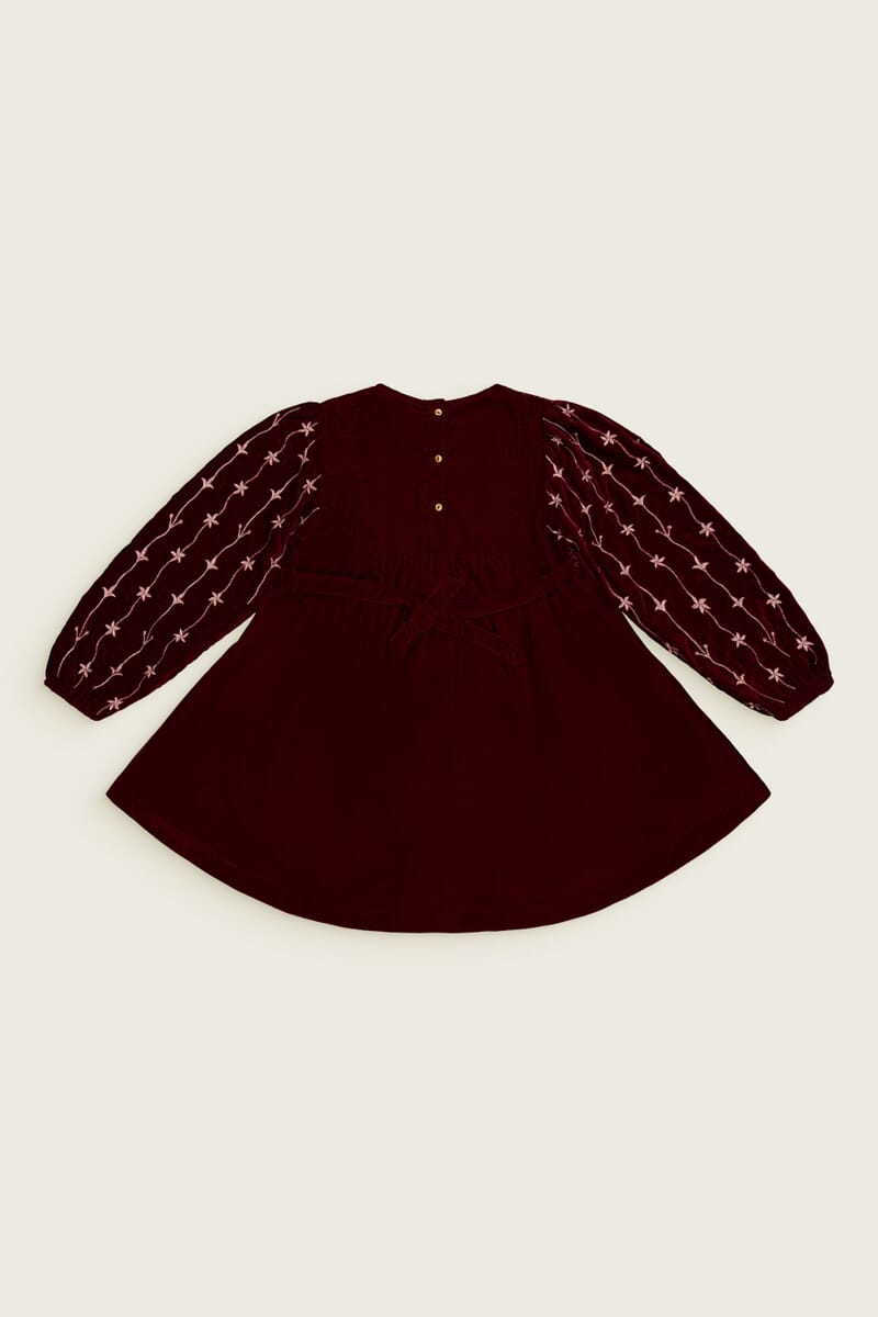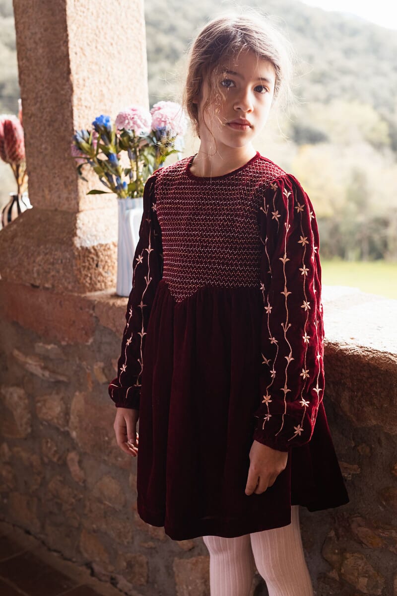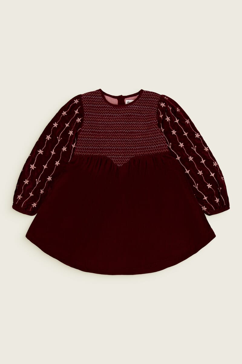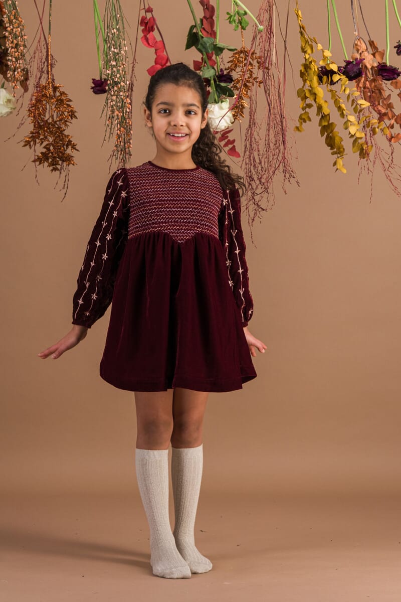 Une Robe en velours de couleur Burgundy entièrement brodée main sur les manches et joliment smockée sur le devant.