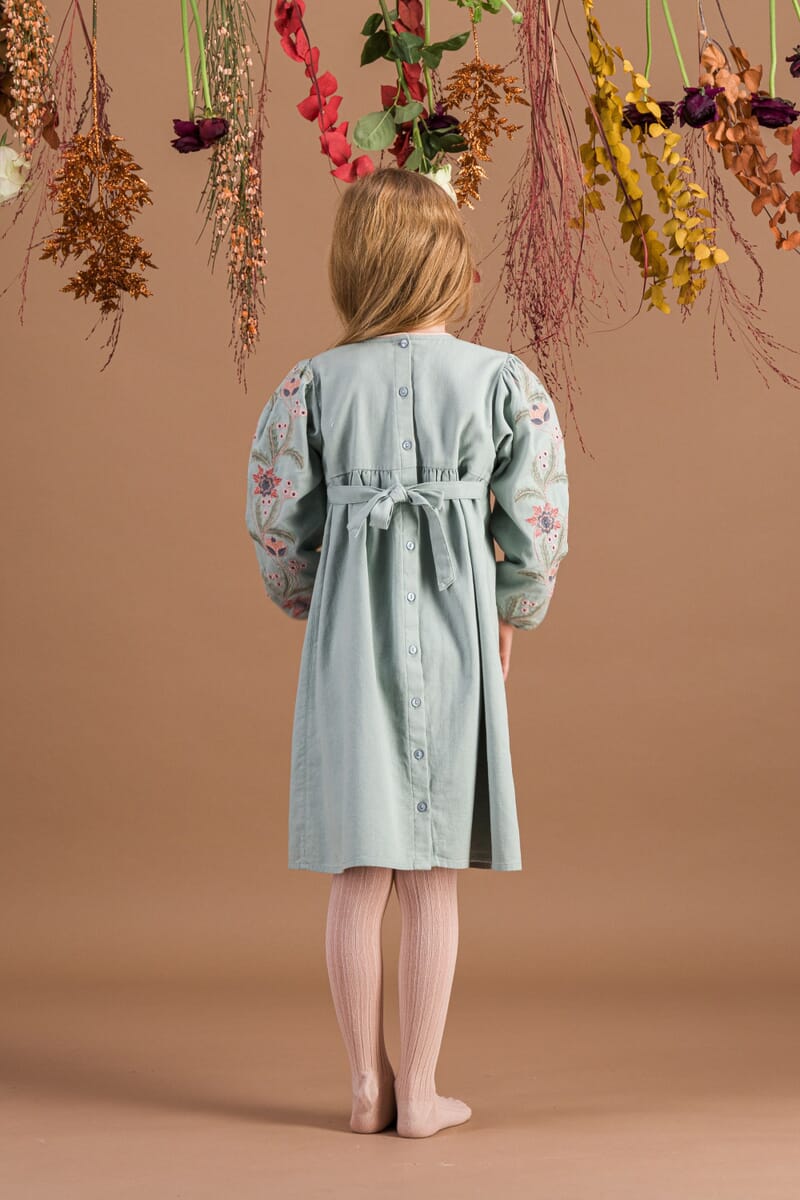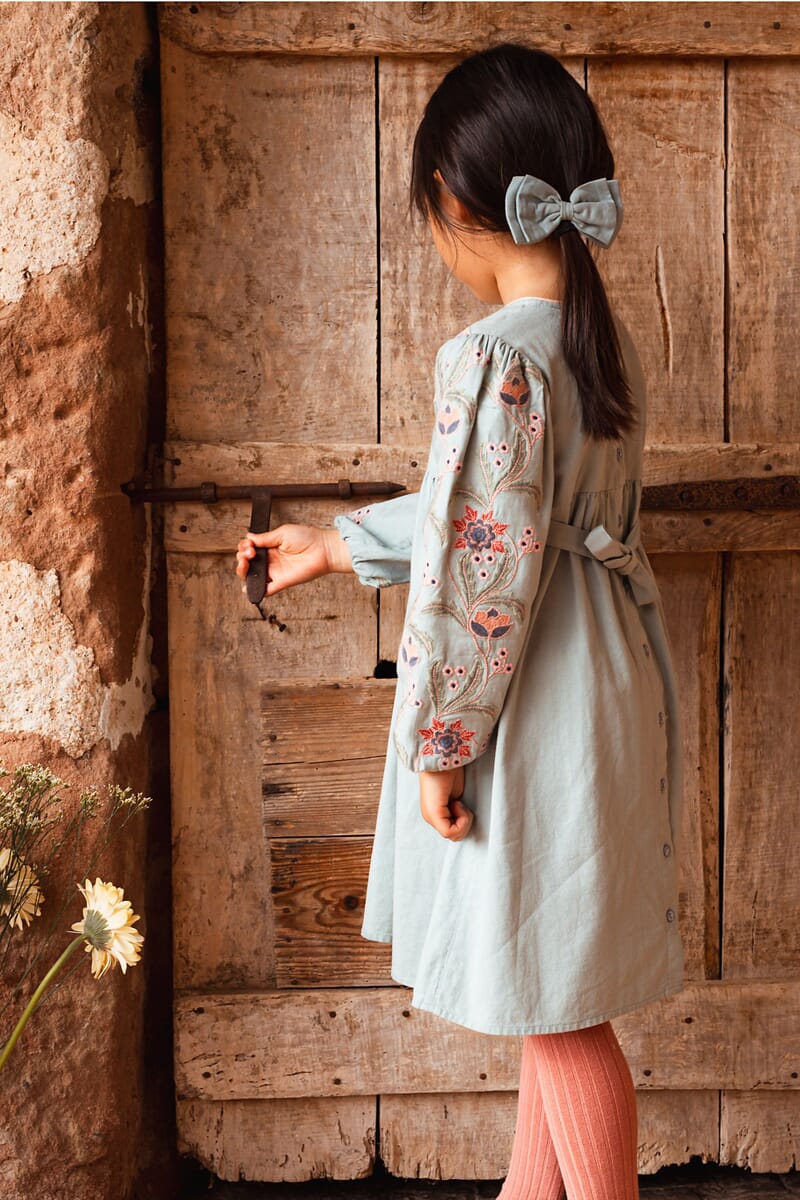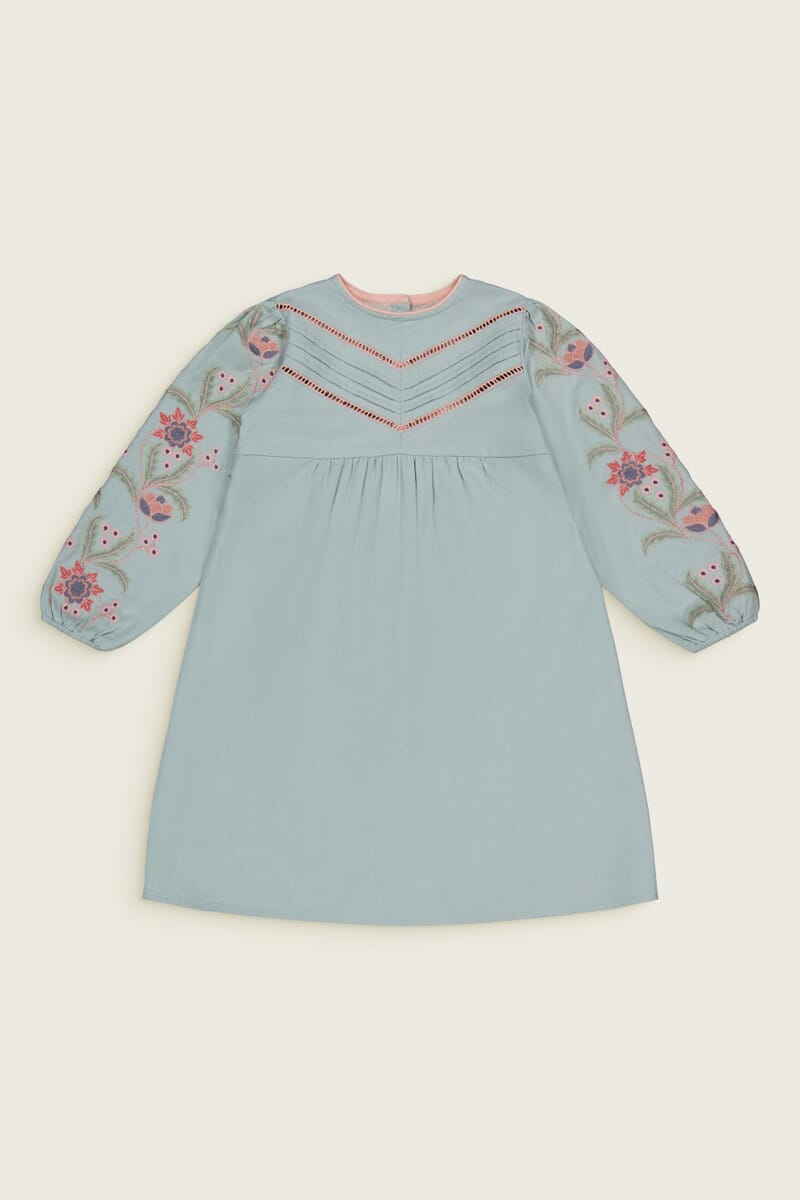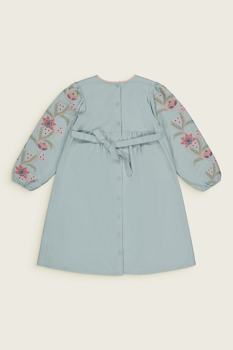 - Robe, Couleur Blue, Twill de coton bio (167 g/m2), Doublure unie en voile de coton bio, Plis nervures, dentelles Jour Echelle et fronces sur le devant, Manches longues brodées et élastiquées, Boutons et ceinture dans le dos.