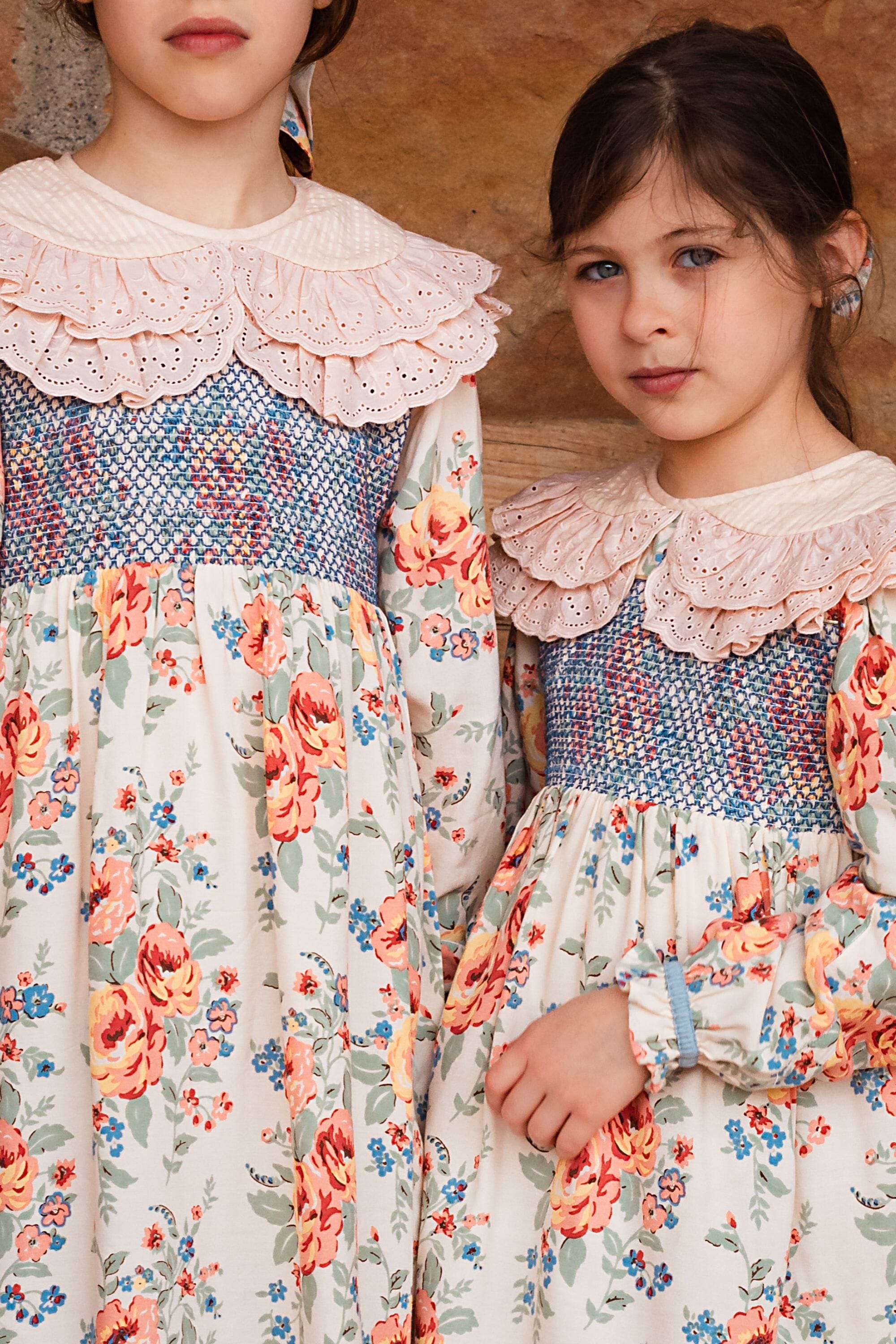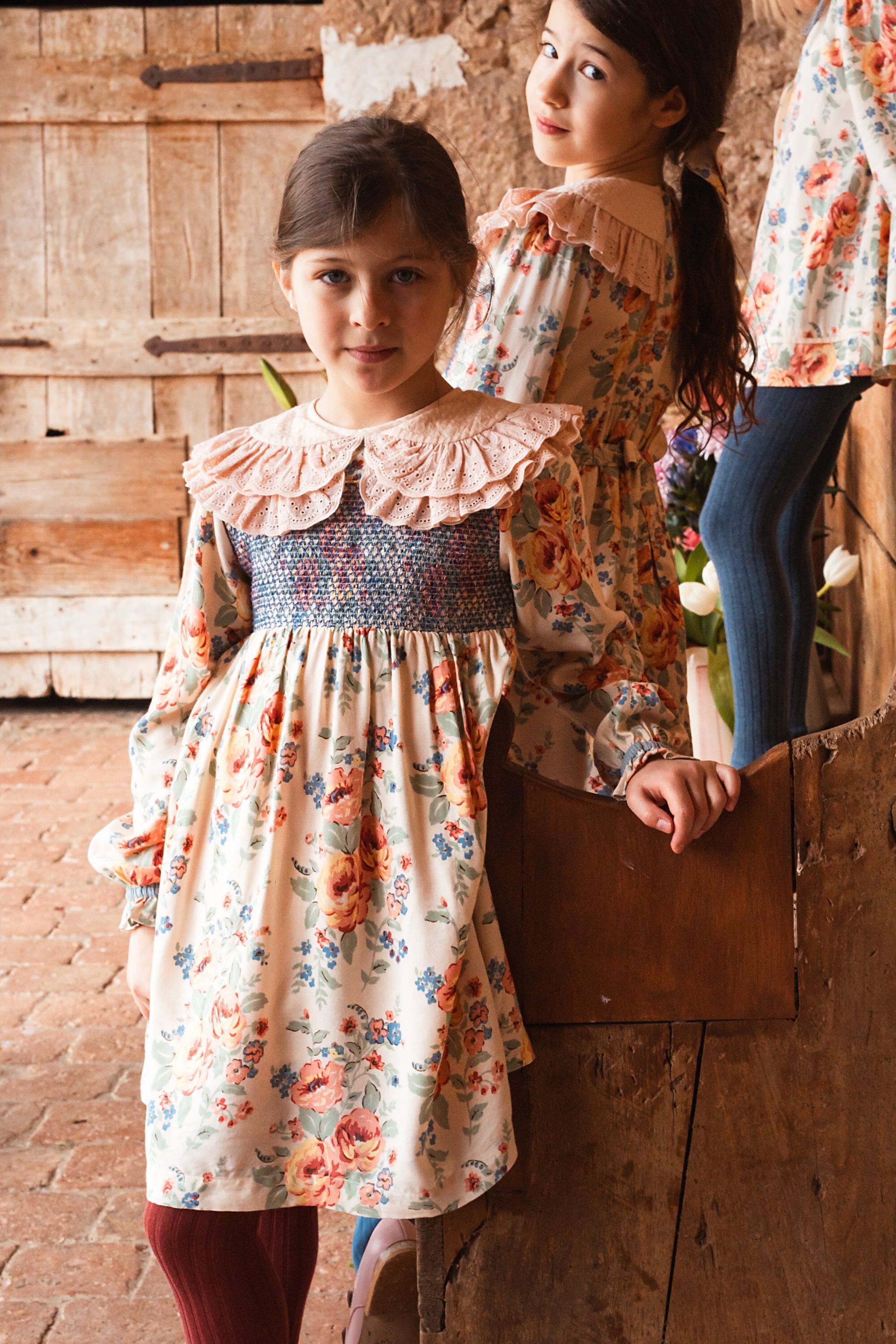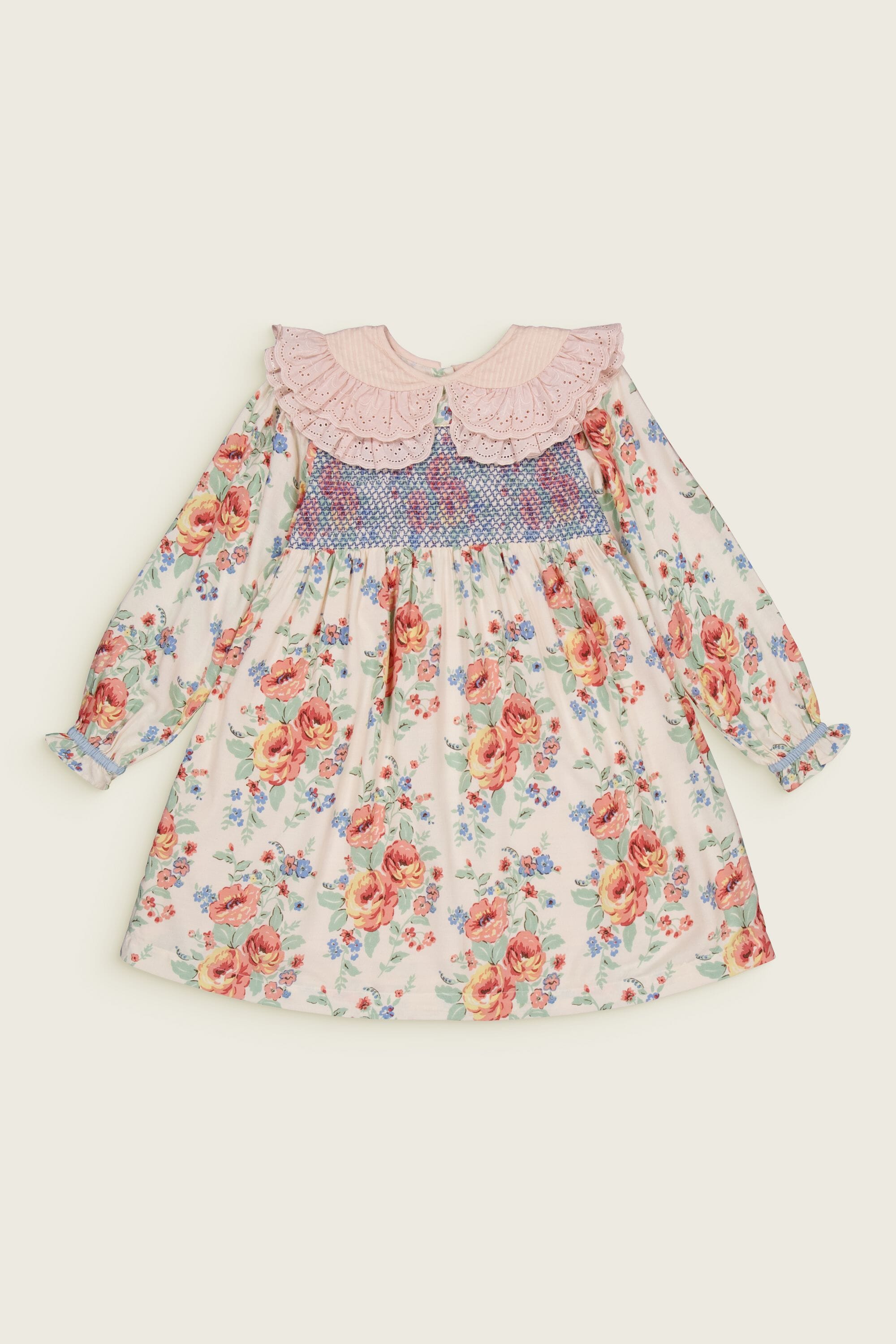Une Robe en Viscose ECOVERO® avec un double col Claudine orné de broderies anglaises et un empiècement joliment smocké sur le devant fini d’un passepoil doré.