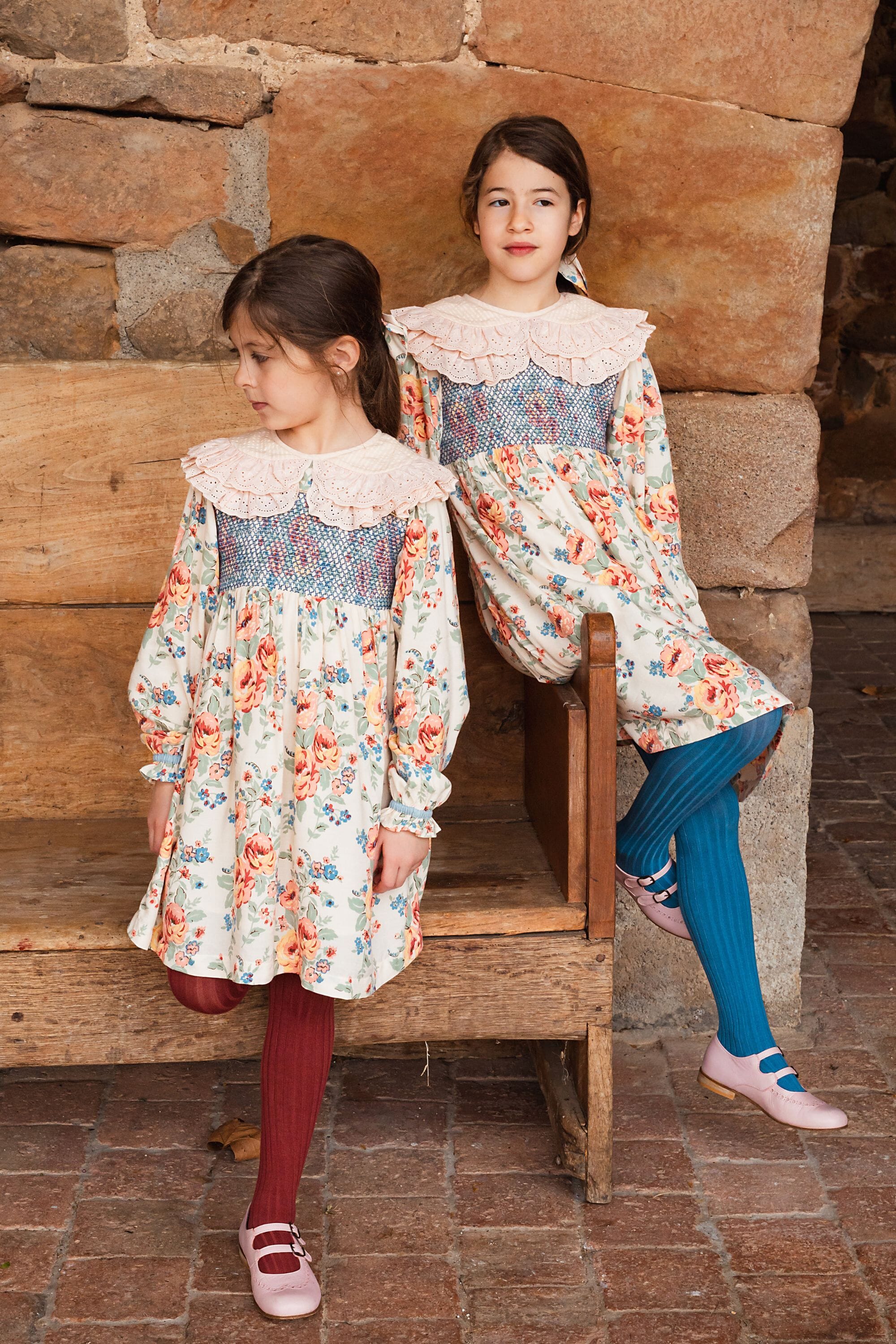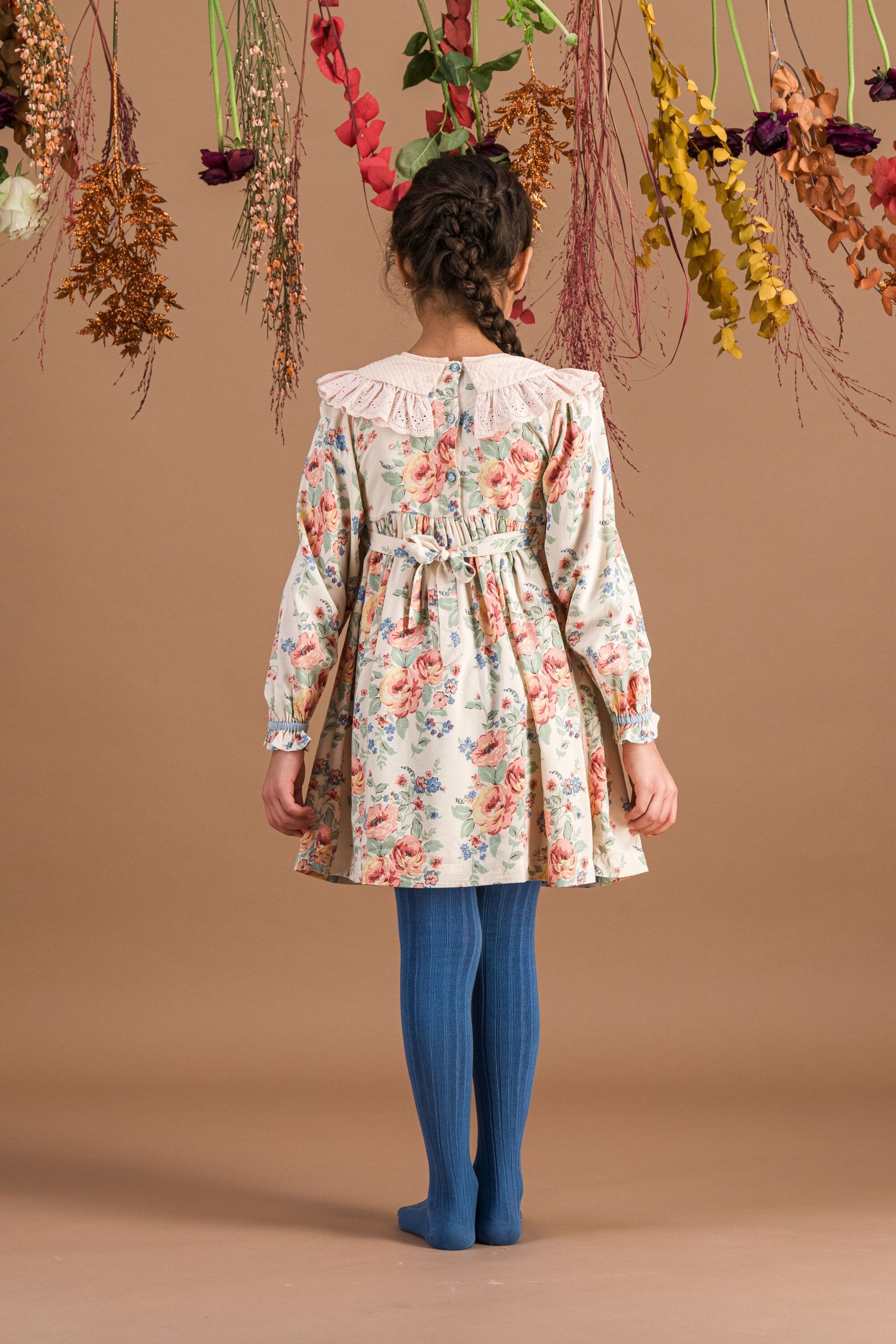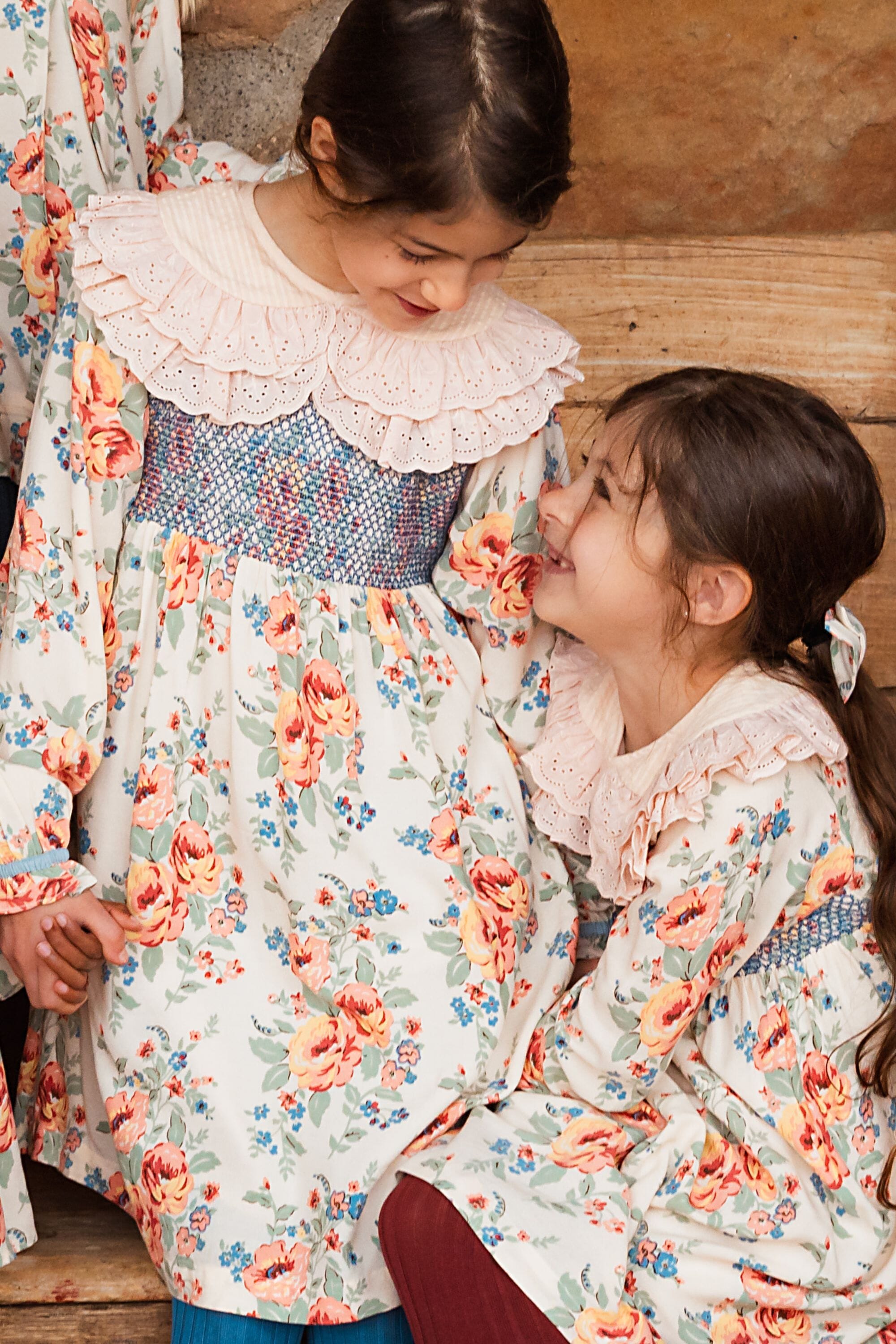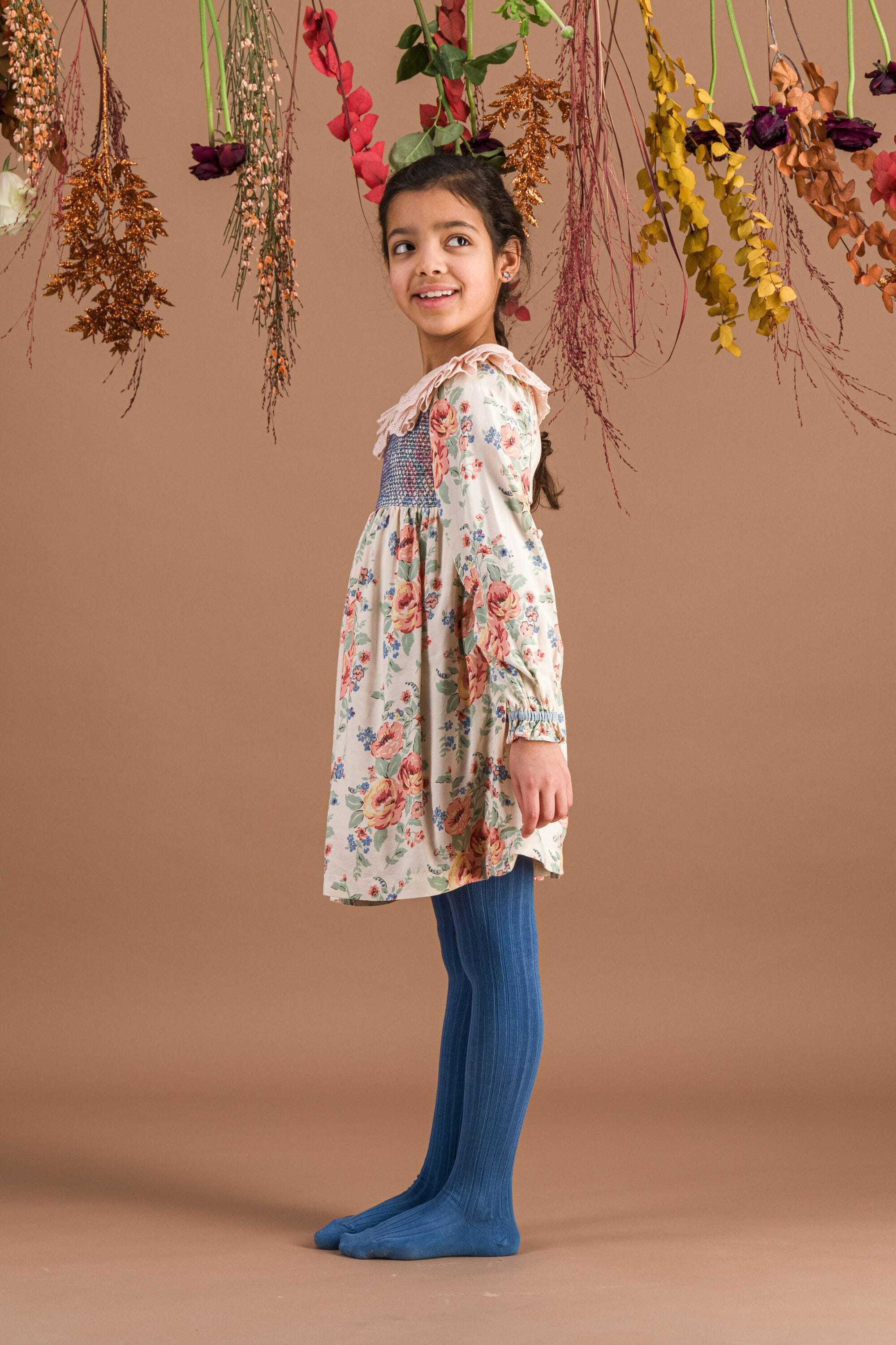 Une Robe en Viscose ECOVERO® avec un double col Claudine orné de broderies anglaises et un empiècement joliment smocké sur le devant fini d’un passepoil doré.