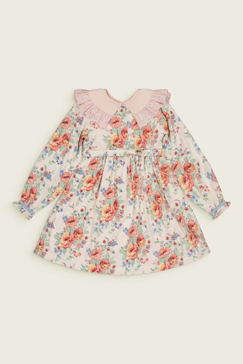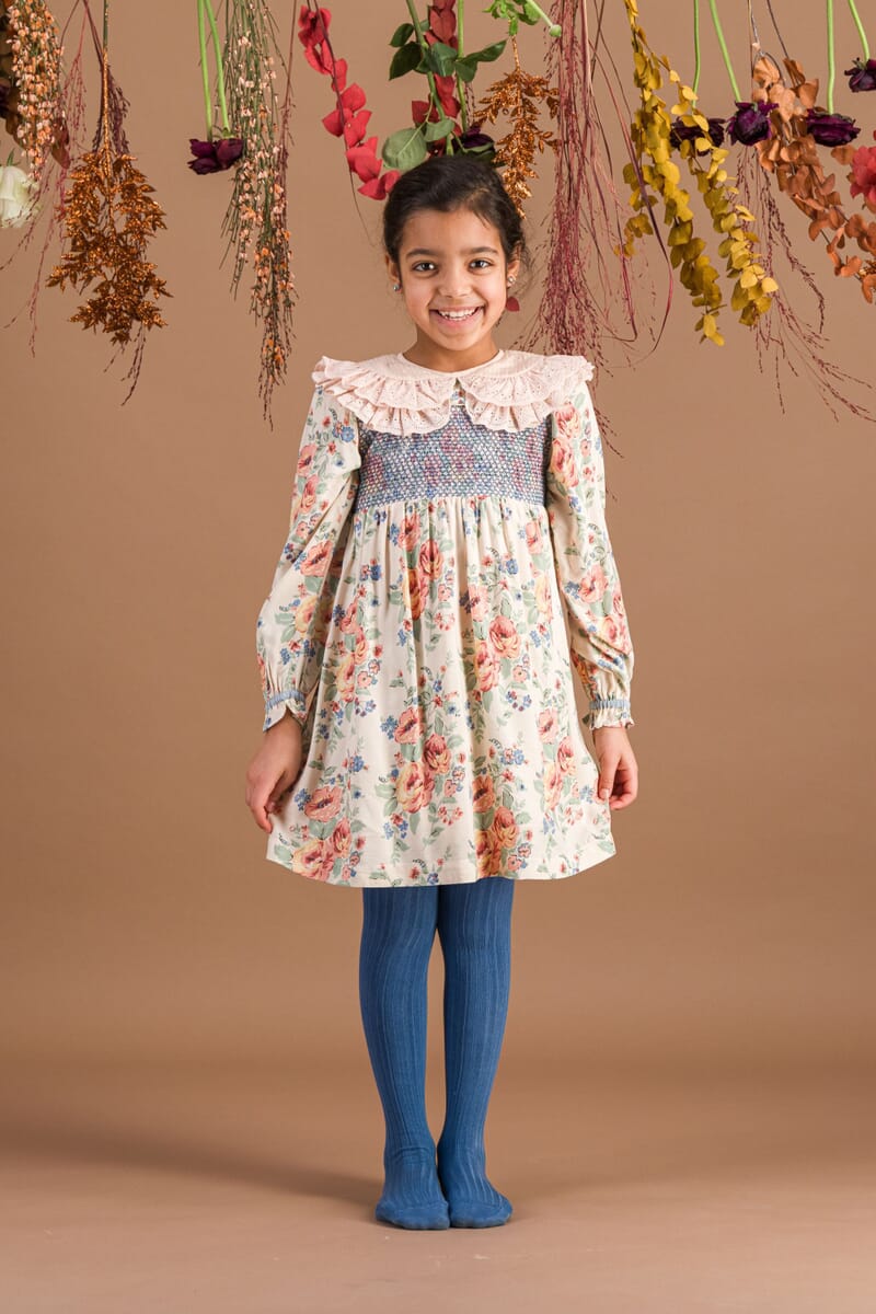 Une Robe en Viscose ECOVERO® avec un double col Claudine orné de broderies anglaises et un empiècement joliment smocké sur le devant fini d’un passepoil doré.