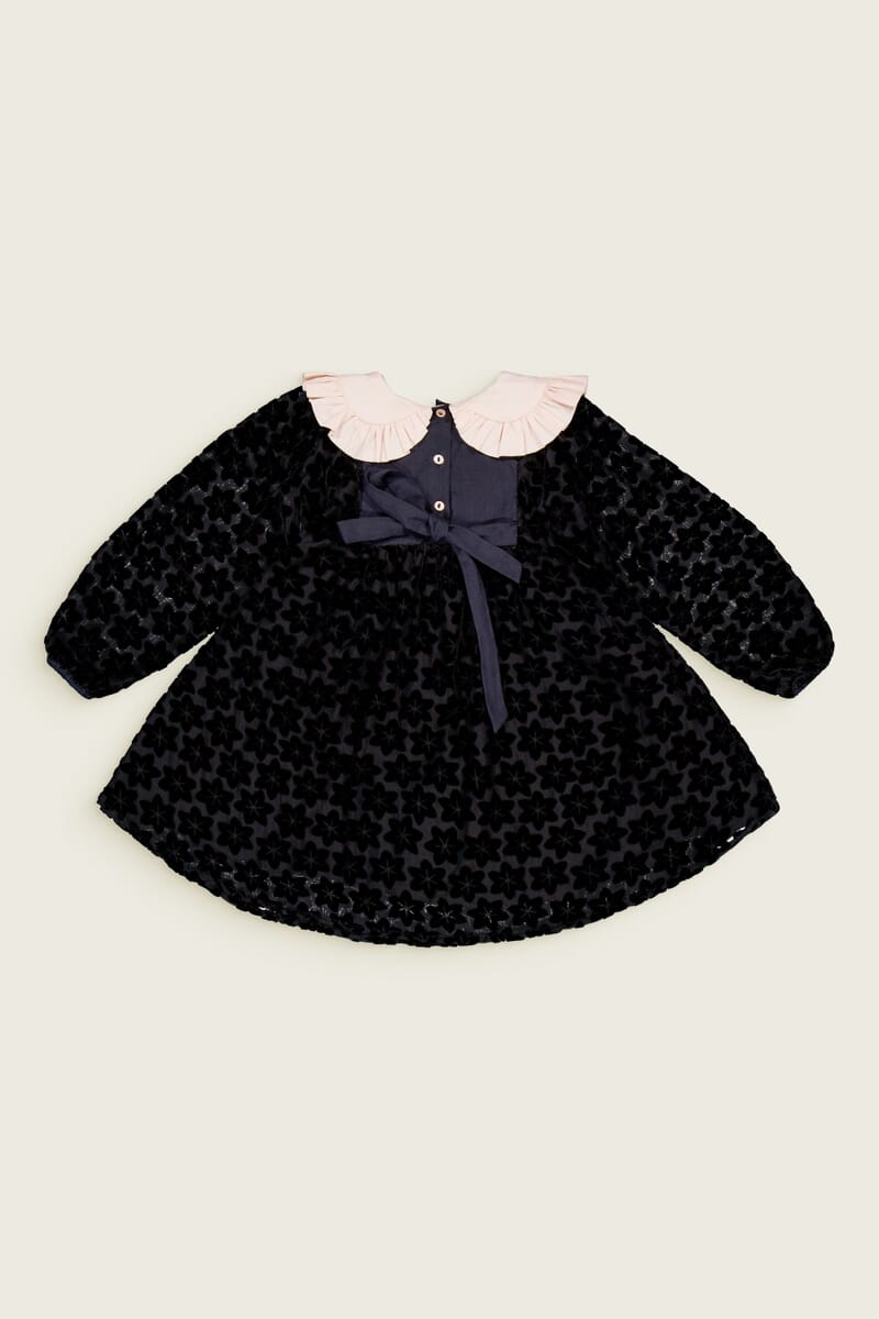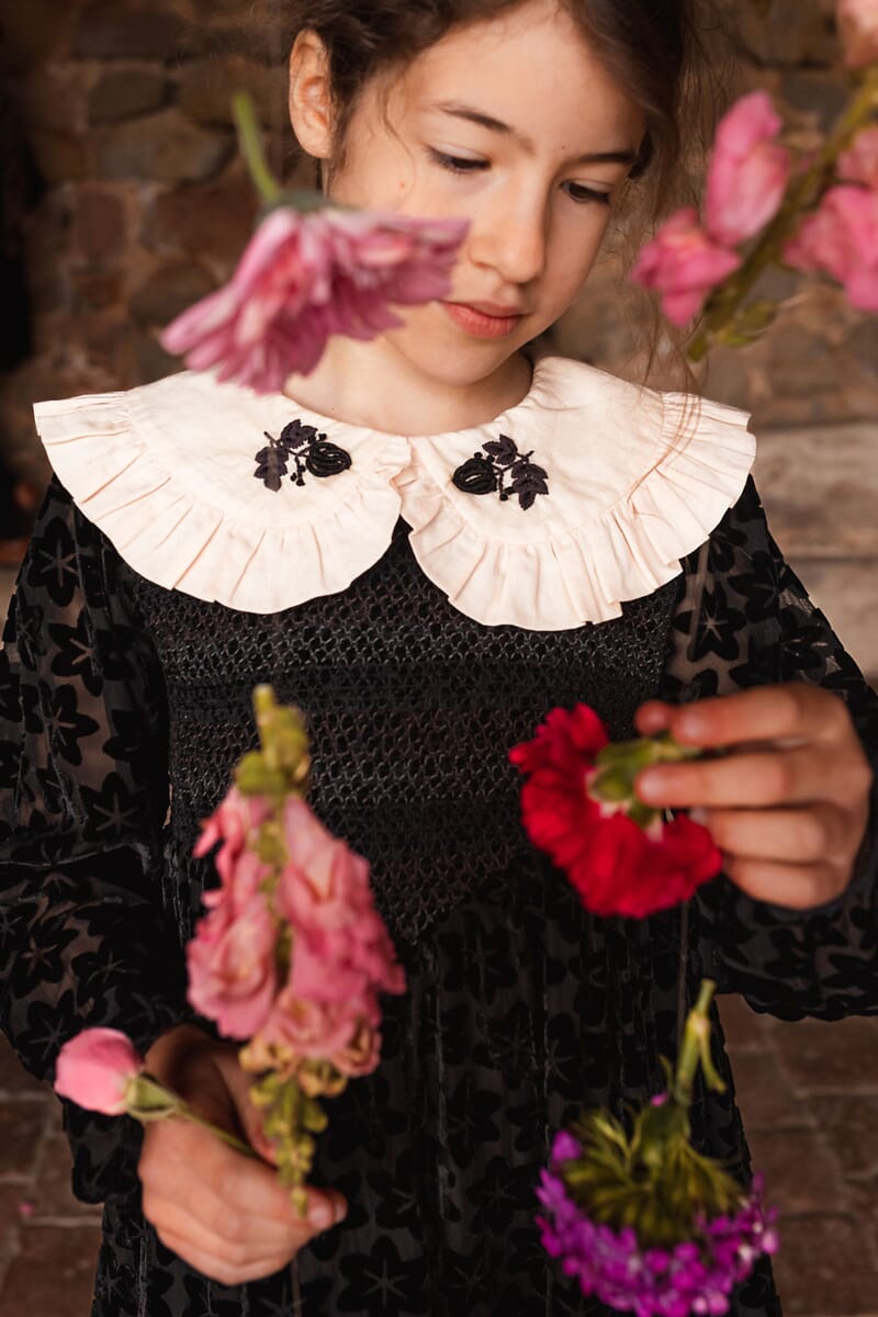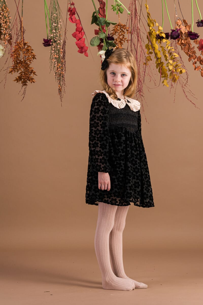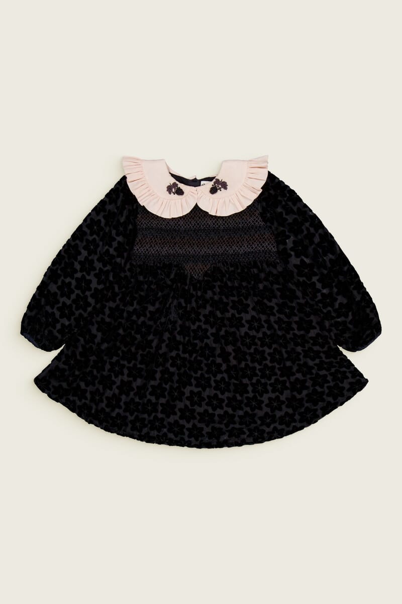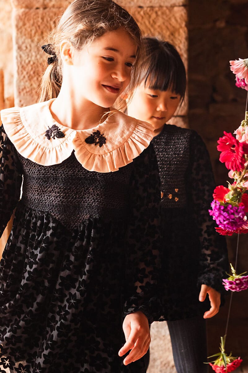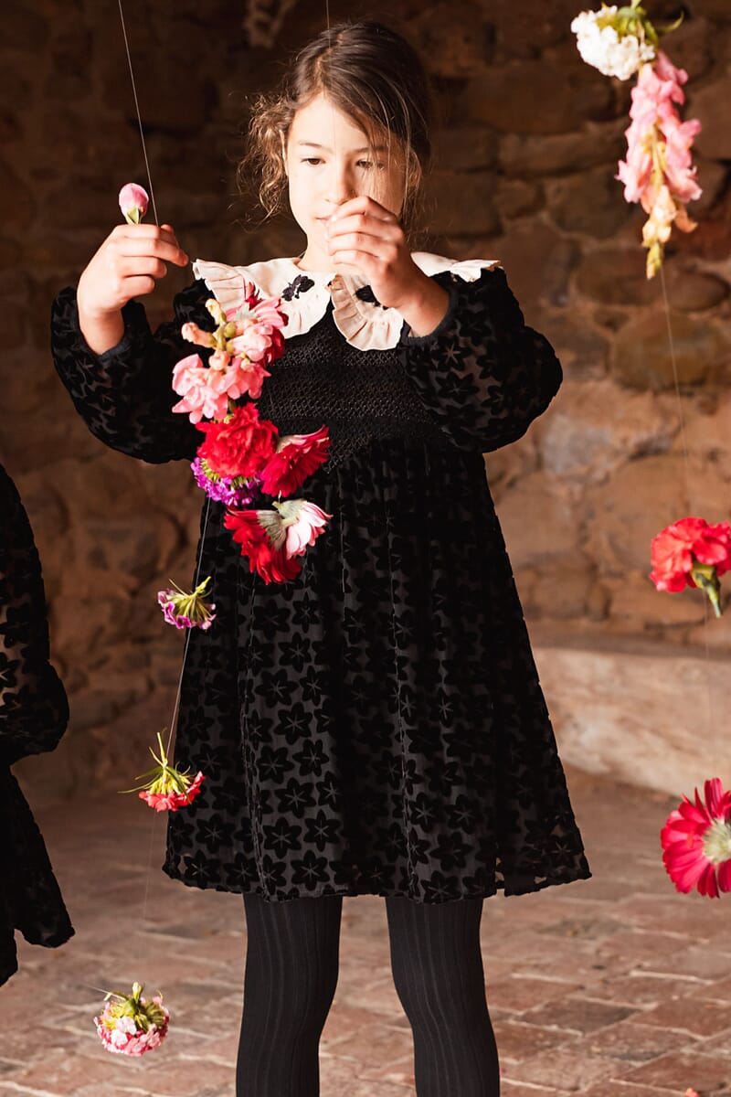- Robe, Velours dévoré, Couleur Noir, Doublure unie en voile de coton bio, Broderies main sur le col, Smocks sur le devant, Manches longues élastiquées.